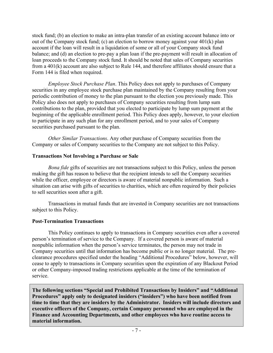 - 7 - stock fund; (b) an election to make an intra-plan transfer of an existing account balance into or out of the Company stock fund; (c) an election to borrow money against your 401(k) plan account if the loan will result in a liquidation of some or all of your Company stock fund balance; and (d) an election to pre‑pay a plan loan if the pre-payment will result in allocation of loan proceeds to the Company stock fund. It should be noted that sales of Company securities from a 401(k) account are also subject to Rule 144, and therefore affiliates should ensure that a Form 144 is filed when required. Employee Stock Purchase Plan. This Policy does not apply to purchases of Company securities in any employee stock purchase plan maintained by the Company resulting from your periodic contribution of money to the plan pursuant to the election you previously made. This Policy also does not apply to purchases of Company securities resulting from lump sum contributions to the plan, provided that you elected to participate by lump sum payment at the beginning of the applicable enrollment period. This Policy does apply, however, to your election to participate in any such plan for any enrollment period, and to your sales of Company securities purchased pursuant to the plan. Other Similar Transactions. Any other purchase of Company securities from the Company or sales of Company securities to the Company are not subject to this Policy. Transactions Not Involving a Purchase or Sale Bona fide gifts of securities are not transactions subject to this Policy, unless the person making the gift has reason to believe that the recipient intends to sell the Company securities while the officer, employee or directors is aware of material nonpublic information. Such a situation can arise with gifts of securities to charities, which are often required by their policies to sell securities soon after a gift. Transactions in mutual funds that are invested in Company securities are not transactions subject to this Policy. Post-Termination Transactions This Policy continues to apply to transactions in Company securities even after a covered person’s termination of service to the Company. If a covered person is aware of material nonpublic information when the person’s service terminates, the person may not trade in Company securities until that information has become public or is no longer material. The pre- clearance procedures specified under the heading “Additional Procedures” below, however, will cease to apply to transactions in Company securities upon the expiration of any Blackout Period or other Company-imposed trading restrictions applicable at the time of the termination of service. The following sections “Special and Prohibited Transactions by Insiders” and “Additional Procedures” apply only to designated insiders (“insiders”) who have been notified from time to time that they are insiders by the Administrator. Insiders will include directors and executive officers of the Company, certain Company personnel who are employed in the Finance and Accounting Departments, and other employees who have routine access to material information.