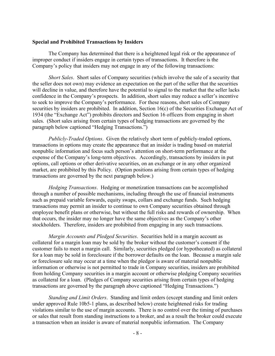 - 8 - Special and Prohibited Transactions by Insiders The Company has determined that there is a heightened legal risk or the appearance of improper conduct if insiders engage in certain types of transactions. It therefore is the Company’s policy that insiders may not engage in any of the following transactions: Short Sales. Short sales of Company securities (which involve the sale of a security that the seller does not own) may evidence an expectation on the part of the seller that the securities will decline in value, and therefore have the potential to signal to the market that the seller lacks confidence in the Company’s prospects. In addition, short sales may reduce a seller’s incentive to seek to improve the Company’s performance. For these reasons, short sales of Company securities by insiders are prohibited. In addition, Section 16(c) of the Securities Exchange Act of 1934 (the “Exchange Act”) prohibits directors and Section 16 officers from engaging in short sales. (Short sales arising from certain types of hedging transactions are governed by the paragraph below captioned “Hedging Transactions.”) Publicly-Traded Options. Given the relatively short term of publicly-traded options, transactions in options may create the appearance that an insider is trading based on material nonpublic information and focus such person’s attention on short-term performance at the expense of the Company’s long-term objectives. Accordingly, transactions by insiders in put options, call options or other derivative securities, on an exchange or in any other organized market, are prohibited by this Policy. (Option positions arising from certain types of hedging transactions are governed by the next paragraph below.) Hedging Transactions. Hedging or monetization transactions can be accomplished through a number of possible mechanisms, including through the use of financial instruments such as prepaid variable forwards, equity swaps, collars and exchange funds. Such hedging transactions may permit an insider to continue to own Company securities obtained through employee benefit plans or otherwise, but without the full risks and rewards of ownership. When that occurs, the insider may no longer have the same objectives as the Company’s other stockholders. Therefore, insiders are prohibited from engaging in any such transactions. Margin Accounts and Pledged Securities. Securities held in a margin account as collateral for a margin loan may be sold by the broker without the customer’s consent if the customer fails to meet a margin call. Similarly, securities pledged (or hypothecated) as collateral for a loan may be sold in foreclosure if the borrower defaults on the loan. Because a margin sale or foreclosure sale may occur at a time when the pledgor is aware of material nonpublic information or otherwise is not permitted to trade in Company securities, insiders are prohibited from holding Company securities in a margin account or otherwise pledging Company securities as collateral for a loan. (Pledges of Company securities arising from certain types of hedging transactions are governed by the paragraph above captioned “Hedging Transactions.”) Standing and Limit Orders. Standing and limit orders (except standing and limit orders under approved Rule 10b5-1 plans, as described below) create heightened risks for trading violations similar to the use of margin accounts. There is no control over the timing of purchases or sales that result from standing instructions to a broker, and as a result the broker could execute a transaction when an insider is aware of material nonpublic information. The Company