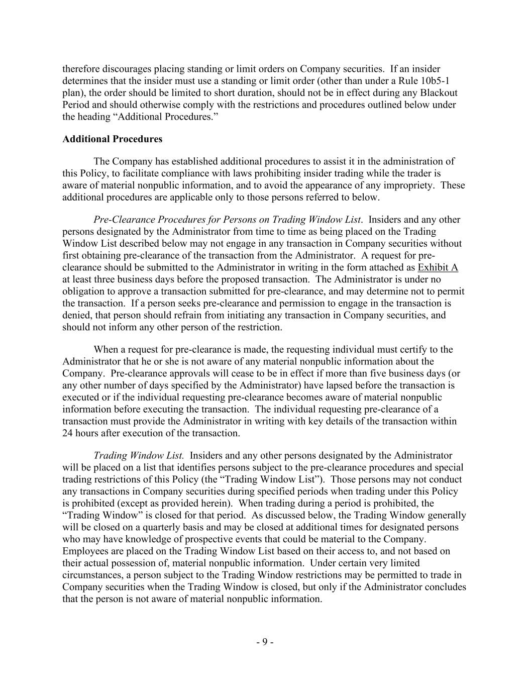 - 9 - therefore discourages placing standing or limit orders on Company securities. If an insider determines that the insider must use a standing or limit order (other than under a Rule 10b5-1 plan), the order should be limited to short duration, should not be in effect during any Blackout Period and should otherwise comply with the restrictions and procedures outlined below under the heading “Additional Procedures.” Additional Procedures The Company has established additional procedures to assist it in the administration of this Policy, to facilitate compliance with laws prohibiting insider trading while the trader is aware of material nonpublic information, and to avoid the appearance of any impropriety. These additional procedures are applicable only to those persons referred to below. Pre-Clearance Procedures for Persons on Trading Window List. Insiders and any other persons designated by the Administrator from time to time as being placed on the Trading Window List described below may not engage in any transaction in Company securities without first obtaining pre-clearance of the transaction from the Administrator. A request for pre- clearance should be submitted to the Administrator in writing in the form attached as Exhibit A at least three business days before the proposed transaction. The Administrator is under no obligation to approve a transaction submitted for pre-clearance, and may determine not to permit the transaction. If a person seeks pre-clearance and permission to engage in the transaction is denied, that person should refrain from initiating any transaction in Company securities, and should not inform any other person of the restriction. When a request for pre-clearance is made, the requesting individual must certify to the Administrator that he or she is not aware of any material nonpublic information about the Company. Pre-clearance approvals will cease to be in effect if more than five business days (or any other number of days specified by the Administrator) have lapsed before the transaction is executed or if the individual requesting pre-clearance becomes aware of material nonpublic information before executing the transaction. The individual requesting pre-clearance of a transaction must provide the Administrator in writing with key details of the transaction within 24 hours after execution of the transaction. Trading Window List. Insiders and any other persons designated by the Administrator will be placed on a list that identifies persons subject to the pre-clearance procedures and special trading restrictions of this Policy (the “Trading Window List”). Those persons may not conduct any transactions in Company securities during specified periods when trading under this Policy is prohibited (except as provided herein). When trading during a period is prohibited, the “Trading Window” is closed for that period. As discussed below, the Trading Window generally will be closed on a quarterly basis and may be closed at additional times for designated persons who may have knowledge of prospective events that could be material to the Company. Employees are placed on the Trading Window List based on their access to, and not based on their actual possession of, material nonpublic information. Under certain very limited circumstances, a person subject to the Trading Window restrictions may be permitted to trade in Company securities when the Trading Window is closed, but only if the Administrator concludes that the person is not aware of material nonpublic information.