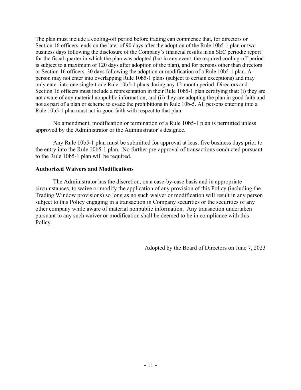 - 11 - The plan must include a cooling-off period before trading can commence that, for directors or Section 16 officers, ends on the later of 90 days after the adoption of the Rule 10b5-1 plan or two business days following the disclosure of the Company’s financial results in an SEC periodic report for the fiscal quarter in which the plan was adopted (but in any event, the required cooling-off period is subject to a maximum of 120 days after adoption of the plan), and for persons other than directors or Section 16 officers, 30 days following the adoption or modification of a Rule 10b5-1 plan. A person may not enter into overlapping Rule 10b5-1 plans (subject to certain exceptions) and may only enter into one single-trade Rule 10b5-1 plans during any 12-month period. Directors and Section 16 officers must include a representation in their Rule 10b5-1 plan certifying that: (i) they are not aware of any material nonpublic information; and (ii) they are adopting the plan in good faith and not as part of a plan or scheme to evade the prohibitions in Rule 10b-5. All persons entering into a Rule 10b5-1 plan must act in good faith with respect to that plan. No amendment, modification or termination of a Rule 10b5-1 plan is permitted unless approved by the Administrator or the Administrator’s designee. Any Rule 10b5-1 plan must be submitted for approval at least five business days prior to the entry into the Rule 10b5-1 plan. No further pre-approval of transactions conducted pursuant to the Rule 10b5-1 plan will be required. Authorized Waivers and Modifications The Administrator has the discretion, on a case-by-case basis and in appropriate circumstances, to waive or modify the application of any provision of this Policy (including the Trading Window provisions) so long as no such waiver or modification will result in any person subject to this Policy engaging in a transaction in Company securities or the securities of any other company while aware of material nonpublic information. Any transaction undertaken pursuant to any such waiver or modification shall be deemed to be in compliance with this Policy. Adopted by the Board of Directors on June 7, 2023