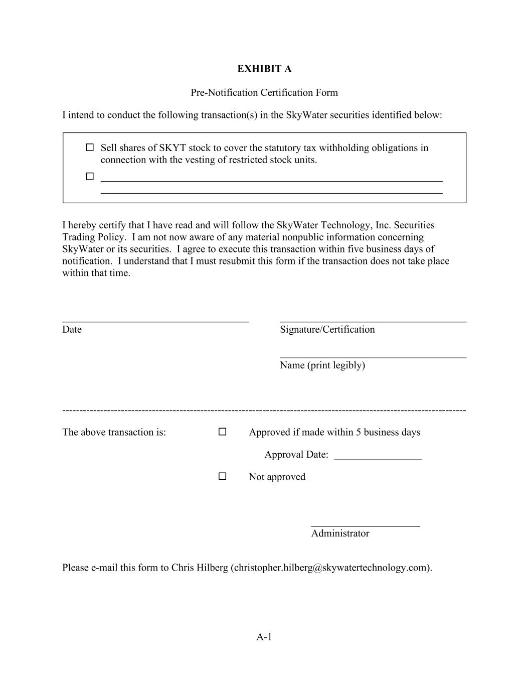 A-1 EXHIBIT A Pre-Notification Certification Form I intend to conduct the following transaction(s) in the SkyWater securities identified below: I hereby certify that I have read and will follow the SkyWater Technology, Inc. Securities Trading Policy. I am not now aware of any material nonpublic information concerning SkyWater or its securities. I agree to execute this transaction within five business days of notification. I understand that I must resubmit this form if the transaction does not take place within that time. Date Signature/Certification Name (print legibly) --------------------------------------------------------------------------------------------------------------------- The above transaction is: Approved if made within 5 business days Approval Date: _________________ Not approved _____________________ Administrator Please e-mail this form to Chris Hilberg (christopher.hilberg@skywatertechnology.com). Sell shares of SKYT stock to cover the statutory tax withholding obligations in connection with the vesting of restricted stock units.