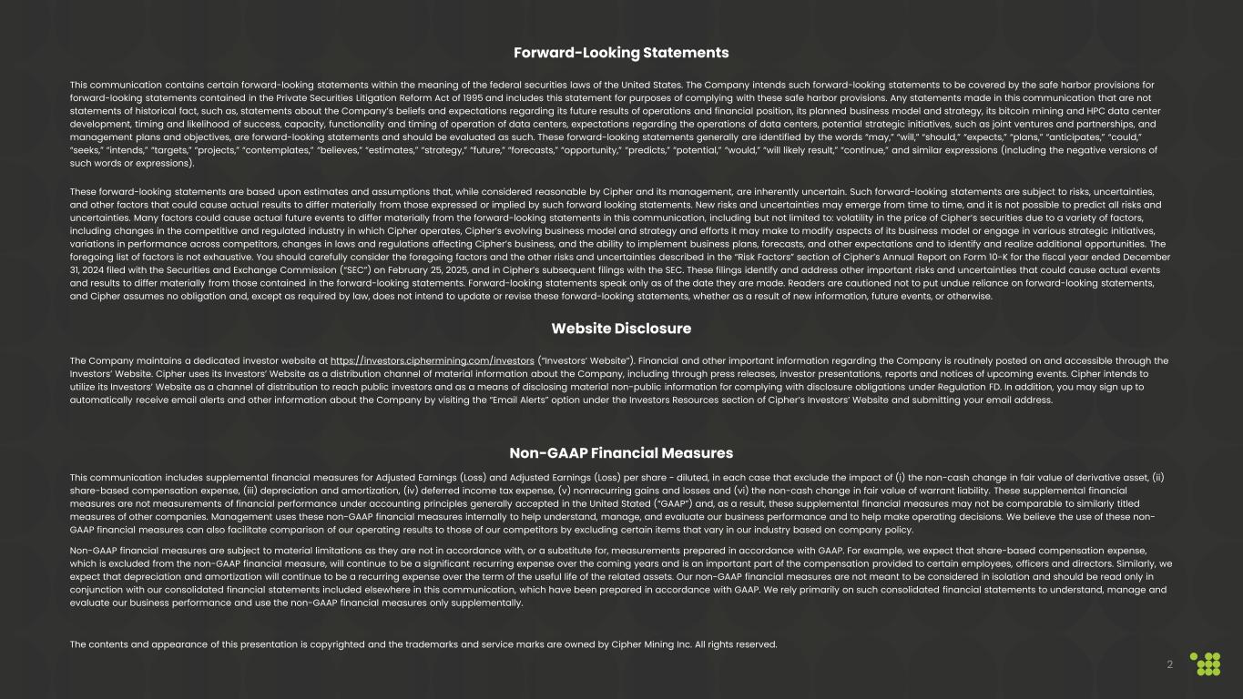 ライブ・ウェブキャストおよびカンファレンス・コールのウェブキャスト再生は、サイファーのウェブサイト(https://investors.ciphermining.com/)の投資家情報セクションからアクセスできます。電話でこの電話会議に参加するには、こちらから登録し、ダイヤルイン番号と電話会議に参加するための固有の PIN を入手してください。