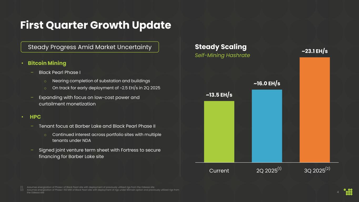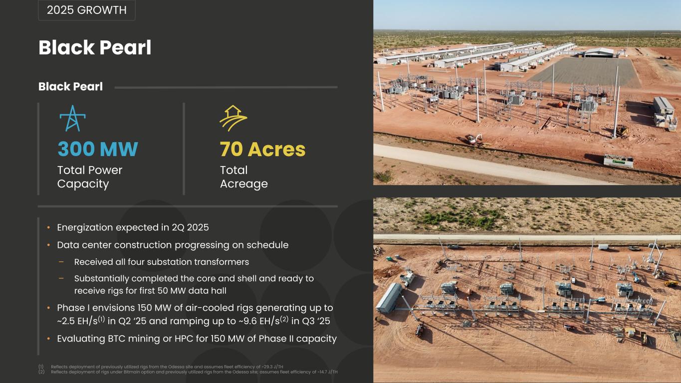 さらにペイジ氏は、「Black Pearlデータセンターの第一期コアとシェルの完成が間近に迫っており、4基の変電所変圧器もすべて現地に設置されました。進捗が早まり、5月に通電が開始される見込みであることから、今夏後半に予定されている新マシンの到着を待つ間、在庫のリグを直ちに新設現場に配備することにしました。この戦略的決定により、当社には追加の資本支出はなく、遊休資産を効率的に活用することで、毎秒約2.5エクサハッシュを予想より1四半期早くオンライン化することができる"