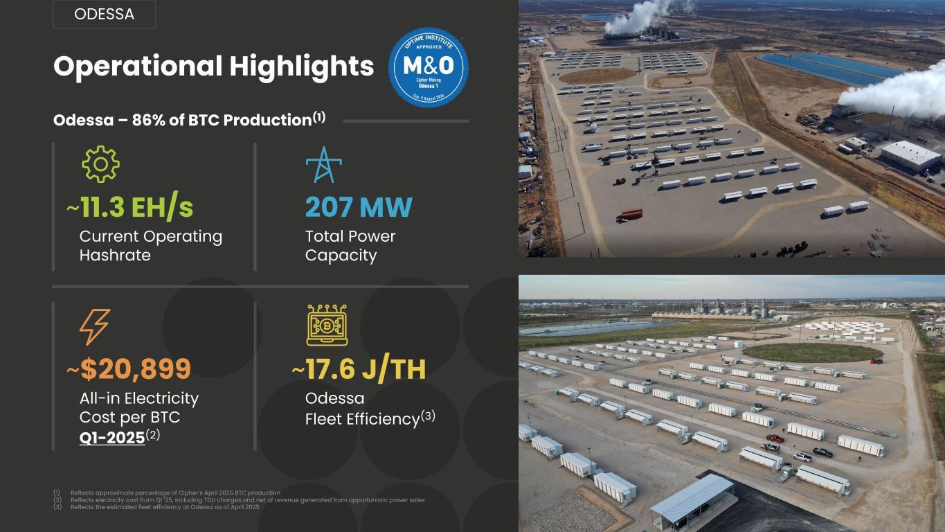 -アップグレードされた Odessa フリートで第 1 四半期のフル稼働を完了し、サイファーのセルフマイニングの総ハッシュレートは ~13.5 EH/s に増加。