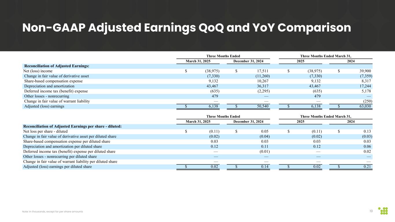 本プレスリリースには、調整後1株当たり利益(損失)および調整後1株当たり利益(損失)-希薄化の補足財務指標が含まれており、いずれの場合も(i)現金支出を伴わないデリバティブ資産の公正価値の変動、(ii)株式報酬費用、(iii)減価償却費および償却費、(iv)繰延税金費用、(v)非経常的な利益および損失、(vi)現金支出を伴わないワラント負債の公正価値の変動の影響を除外しています。これらの補足的財務指標は、米国で一般に公正妥当と認められた会計原則(以下「GAAP」)に基づく財務業績の測定基準ではなく、その結果、これらの補足的財務指標は他社の同様の標題の財務指標と比較できない可能性があります。経営陣は、当社の業績を理解、管理、評価し、経営上の意思決定に役立てるため、これらの非GAAPベースの財務指標を社内で使用しています。また、これらの非GAAPベースの財務指標を使用することにより、会社の方針に基づいて業界で変動する特定の項目を除外することで、競合他社との経営成績の比較を容易にすることができると考えています。