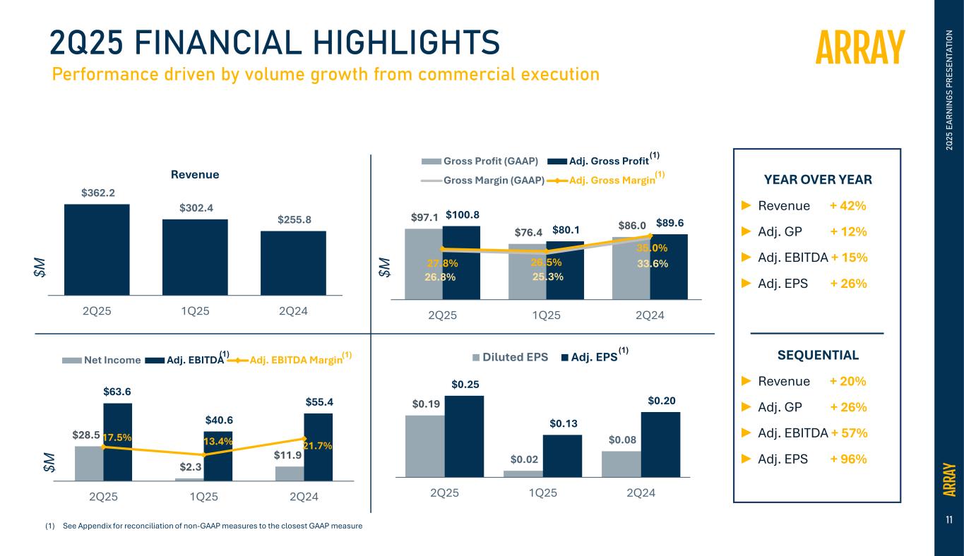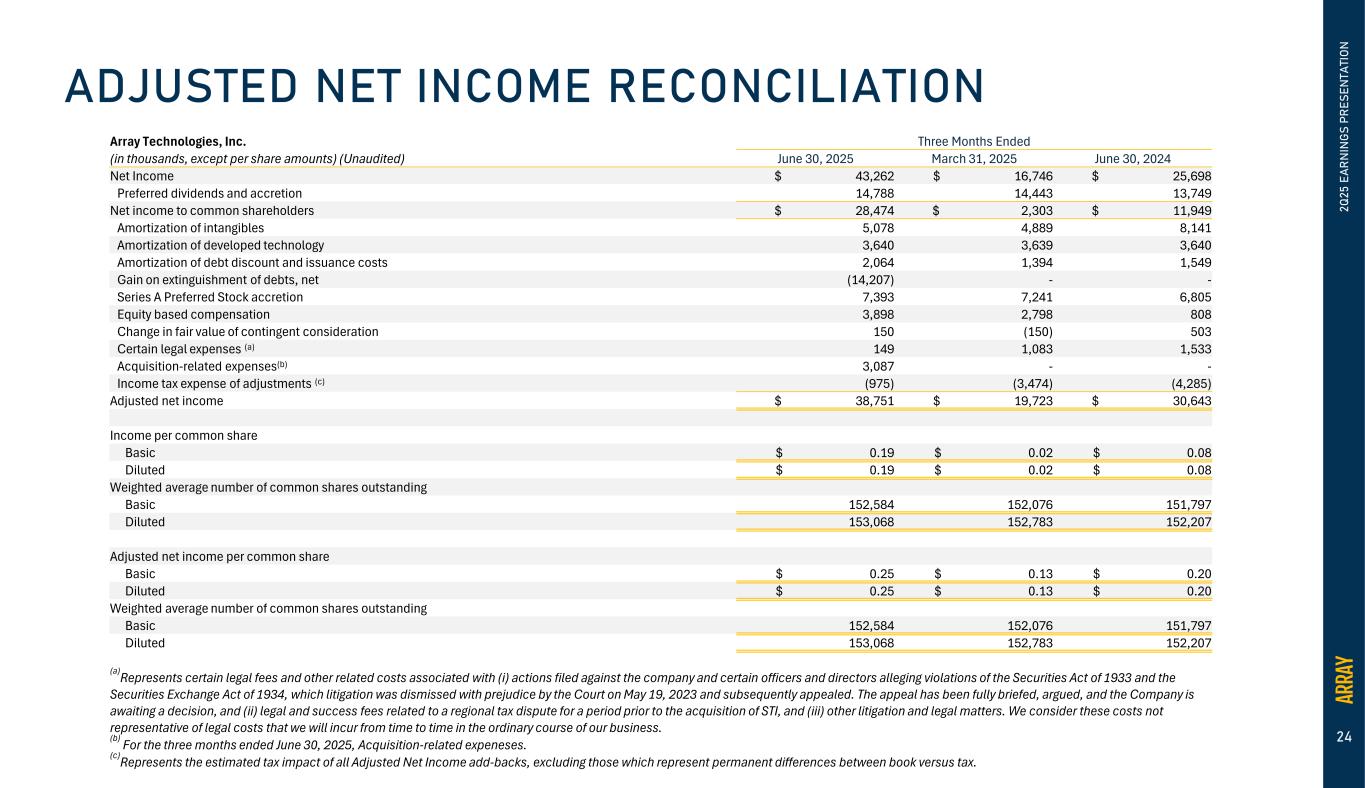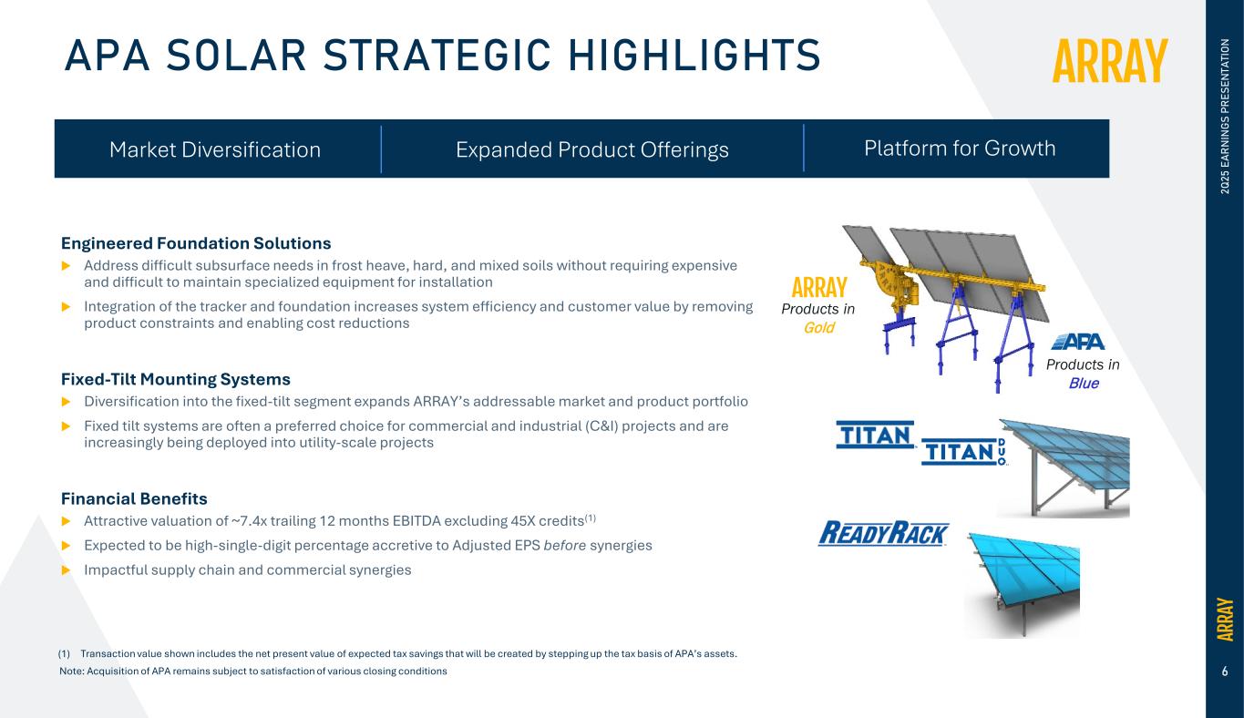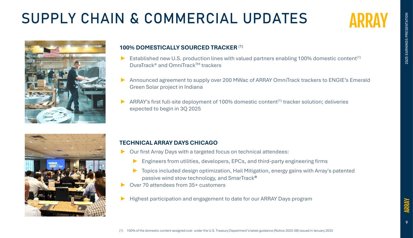 Array’s actual results and the timing of events could materially differ from those anticipated in such forward-looking statements as a result of certain risks, uncertainties and other factors, including without limitation: changes in growth or the rate of growth in demand for solar energy projects; factors outside of our control affecting the variability and demand for solar energy, including but not limited to, the retail price of electricity, availability of in-demand components like high voltage breakers, various policies related to the permitting and interconnection costs of solar plants, and the availability of incentives for solar energy and solar energy production systems, which makes it difficult to predict our future prospects; competitive pressures within our industry; competition from conventional and renewable energy sources; a loss of one or more of our significant customers, their inability to perform under their contracts, or their default in payment; a drop in the price of electricity derived from the utility grid or from alternative energy sources; fluctuations in our results of operations across fiscal periods, which could make our future performance difficult to predict and could cause our results of operations for a particular period to fall below expectations; any increase in interest rates, or a reduction in the availability of tax equity or project debt capital in the global financial markets, which could make it difficult for customers to finance the cost of a solar energy system and reduce the demand for our products; existing electric utility industry policies and regulations, and any subsequent changes or new related policies and regulations, including as a result of the “One Big Beautiful Bill” Act passed by Congress on July 4, 2025, which may present technical, regulatory and economic barriers to the purchase and use of solar energy systems, which may significantly reduce demand for our products or harm our ability to compete; the interruption of the flow of materials from international vendors, which could disrupt our supply chain, including as a result of the imposition of new and/or additional duties, tariffs and other charges or restrictions on imports and exports; changes in the global trade environment, including the imposition of import tariffs or other import restrictions; geopolitical, macroeconomic and other market conditions unrelated to our operating performance including but not limited to a pandemic, the Ukraine-Russia war, attacks on shipping in the Red Sea, conflict in the Middle East, inflation and interest rates; our ability to convert our orders in backlog into revenue; the reduction, elimination or expiration, or our failure to optimize the benefits of government incentives for, or regulations mandating the use of, renewable energy and solar energy, particularly in relation to our competitors, which could reduce demand for solar energy systems; failure to, or incurrence of significant costs in order to, obtain, maintain, protect, defend or enforce, our intellectual property and other proprietary right; delays in construction projects and any failure to manage our inventory; significant changes in the cost of raw materials; disruptions to transportation and logistics, including increases in shipping costs; defects or performance problems in our products, which could result in loss of customers, reputational damage and decreased revenue; delays, disruptions or quality control problems in our product development operations; our ability to retain our key personnel or failure to attract additional qualified personnel; additional business, financial, regulatory and competitive risks due to our continued planned expansion into new markets; cybersecurity or other data incidents, including unauthorized disclosure of personal or sensitive data or theft of confidential information; a failure to maintain an effective system of integrated internal controls over financial reporting, which may impair our ability to report our financial results accurately; our substantial indebtedness; risks related to actual or threatened public health epidemics, pandemics, outbreaks or crises; changes to laws and regulations, including changes to tax laws and regulations, that are applied adversely to us or our customers, including our ability to optimize those changes brought about by the passage of the Inflation Reduction Act (“IRA”) or any repeal thereof; our ability to consummate the acquisition of APA Solar, LLC ("APA") and to successfully integrate APA into our existing operations and realize the anticipated benefits of the acquisition; and other factors described in more detail in the section captioned “Risk Factors” in our Quarterly Report on Form 10-Q, our Annual Report on Form 10-K for the year ended December 31, 2024, as filed as Exhibit 99.2 to our June 24, 2025 8-K, and our other documents on file with the U.S. Securities and Exchange Commission, each of which can be found on our website, www.arraytechinc.com.