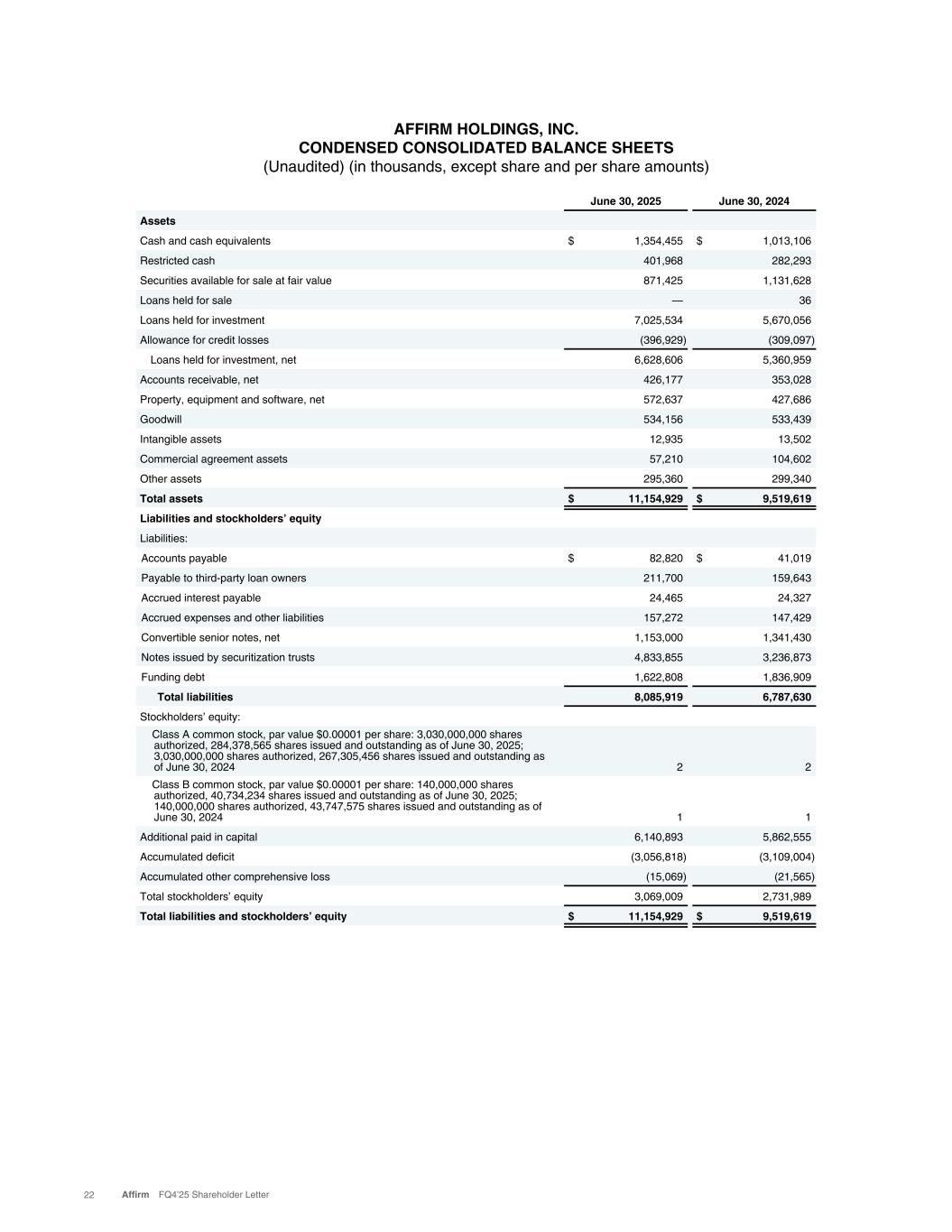June 30, 2025 June 30, 2024 Assets Cash and cash equivalents $ 1,354,455 $ 1,013,106 Restricted cash 401,968 282,293 Securities available for sale at fair value 871,425 1,131,628 Loans held for sale — 36 Loans held for investment 7,025,534 5,670,056 Allowance for credit losses (396,929) (309,097) Loans held for investment, net 6,628,606 5,360,959 Accounts receivable, net 426,177 353,028 Property, equipment and software, net 572,637 427,686 Goodwill 534,156 533,439 Intangible assets 12,935 13,502 Commercial agreement assets 57,210 104,602 Other assets 295,360 299,340 Total assets $ 11,154,929 $ 9,519,619 Liabilities and stockholders’ equity Liabilities: Accounts payable $ 82,820 $ 41,019 Payable to third-party loan owners 211,700 159,643 Accrued interest payable 24,465 24,327 Accrued expenses and other liabilities 157,272 147,429 Convertible senior notes, net 1,153,000 1,341,430 Notes issued by securitization trusts 4,833,855 3,236,873 Funding debt 1,622,808 1,836,909 Total liabilities 8,085,919 6,787,630 Stockholders’ equity: Class A common stock, par value $0.00001 per share: 3,030,000,000 shares authorized, 284,378,565 shares issued and outstanding as of June 30, 2025; 3,030,000,000 shares authorized, 267,305,456 shares issued and outstanding as of June 30, 2024 2 2 Class B common stock, par value $0.00001 per share: 140,000,000 shares authorized, 40,734,234 shares issued and outstanding as of June 30, 2025; 140,000,000 shares authorized, 43,747,575 shares issued and outstanding as of June 30, 2024 1 1 Additional paid in capital 6,140,893 5,862,555 Accumulated deficit (3,056,818) (3,109,004) Accumulated other comprehensive loss (15,069) (21,565) Total stockholders’ equity 3,069,009 2,731,989 Total liabilities and stockholders’ equity $ 11,154,929 $ 9,519,619 AFFIRM HOLDINGS, INC. CONDENSED CONSOLIDATED BALANCE SHEETS (Unaudited) (in thousands, except share and per share amounts) 22 Affirm FQ4’25 Shareholder Letter