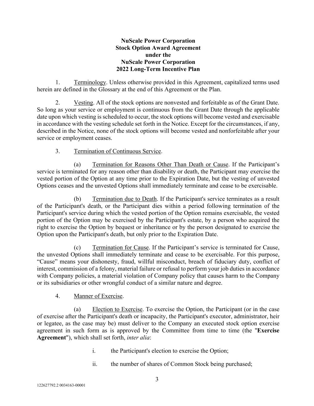 3 122627792.2 0034163-00001 NuScale Power Corporation Stock Option Award Agreement under the NuScale Power Corporation 2022 Long-Term Incentive Plan 1. Terminology. Unless otherwise provided in this Agreement, capitalized terms used herein are defined in the Glossary at the end of this Agreement or the Plan. 2. Vesting. All of the stock options are nonvested and forfeitable as of the Grant Date. So long as your service or employment is continuous from the Grant Date through the applicable date upon which vesting is scheduled to occur, the stock options will become vested and exercisable in accordance with the vesting schedule set forth in the Notice. Except for the circumstances, if any, described in the Notice, none of the stock options will become vested and nonforfeitable after your service or employment ceases. 3. Termination of Continuous Service. (a) Termination for Reasons Other Than Death or Cause. If the Participant’s service is terminated for any reason other than disability or death, the Participant may exercise the vested portion of the Option at any time prior to the Expiration Date, but the vesting of unvested Options ceases and the unvested Options shall immediately terminate and cease to be exercisable. (b) Termination due to Death. If the Participant's service terminates as a result of the Participant's death, or the Participant dies within a period following termination of the Participant's service during which the vested portion of the Option remains exercisable, the vested portion of the Option may be exercised by the Participant's estate, by a person who acquired the right to exercise the Option by bequest or inheritance or by the person designated to exercise the Option upon the Participant's death, but only prior to the Expiration Date. (c) Termination for Cause. If the Participant’s service is terminated for Cause, the unvested Options shall immediately terminate and cease to be exercisable. For this purpose, “Cause” means your dishonesty, fraud, willful misconduct, breach of fiduciary duty, conflict of interest, commission of a felony, material failure or refusal to perform your job duties in accordance with Company policies, a material violation of Company policy that causes harm to the Company or its subsidiaries or other wrongful conduct of a similar nature and degree. 4. Manner of Exercise. (a) Election to Exercise. To exercise the Option, the Participant (or in the case of exercise after the Participant's death or incapacity, the Participant's executor, administrator, heir or legatee, as the case may be) must deliver to the Company an executed stock option exercise agreement in such form as is approved by the Committee from time to time (the "Exercise Agreement"), which shall set forth, inter alia: i. the Participant's election to exercise the Option; ii. the number of shares of Common Stock being purchased;