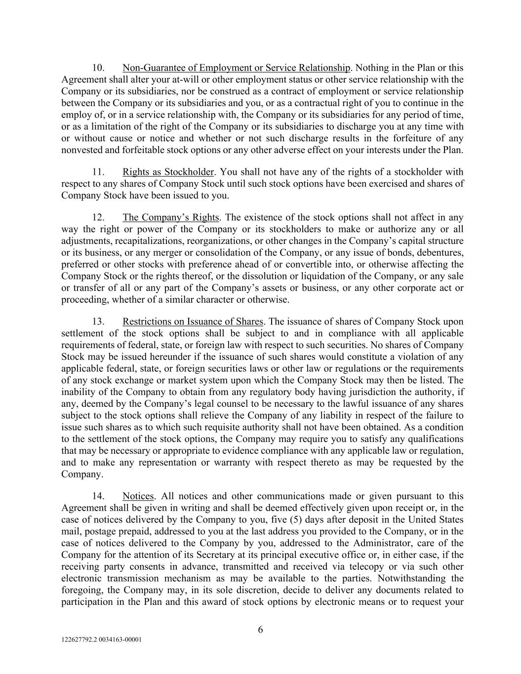 6 122627792.2 0034163-00001 10. Non-Guarantee of Employment or Service Relationship. Nothing in the Plan or this Agreement shall alter your at-will or other employment status or other service relationship with the Company or its subsidiaries, nor be construed as a contract of employment or service relationship between the Company or its subsidiaries and you, or as a contractual right of you to continue in the employ of, or in a service relationship with, the Company or its subsidiaries for any period of time, or as a limitation of the right of the Company or its subsidiaries to discharge you at any time with or without cause or notice and whether or not such discharge results in the forfeiture of any nonvested and forfeitable stock options or any other adverse effect on your interests under the Plan. 11. Rights as Stockholder. You shall not have any of the rights of a stockholder with respect to any shares of Company Stock until such stock options have been exercised and shares of Company Stock have been issued to you. 12. The Company’s Rights. The existence of the stock options shall not affect in any way the right or power of the Company or its stockholders to make or authorize any or all adjustments, recapitalizations, reorganizations, or other changes in the Company’s capital structure or its business, or any merger or consolidation of the Company, or any issue of bonds, debentures, preferred or other stocks with preference ahead of or convertible into, or otherwise affecting the Company Stock or the rights thereof, or the dissolution or liquidation of the Company, or any sale or transfer of all or any part of the Company’s assets or business, or any other corporate act or proceeding, whether of a similar character or otherwise. 13. Restrictions on Issuance of Shares. The issuance of shares of Company Stock upon settlement of the stock options shall be subject to and in compliance with all applicable requirements of federal, state, or foreign law with respect to such securities. No shares of Company Stock may be issued hereunder if the issuance of such shares would constitute a violation of any applicable federal, state, or foreign securities laws or other law or regulations or the requirements of any stock exchange or market system upon which the Company Stock may then be listed. The inability of the Company to obtain from any regulatory body having jurisdiction the authority, if any, deemed by the Company’s legal counsel to be necessary to the lawful issuance of any shares subject to the stock options shall relieve the Company of any liability in respect of the failure to issue such shares as to which such requisite authority shall not have been obtained. As a condition to the settlement of the stock options, the Company may require you to satisfy any qualifications that may be necessary or appropriate to evidence compliance with any applicable law or regulation, and to make any representation or warranty with respect thereto as may be requested by the Company. 14. Notices. All notices and other communications made or given pursuant to this Agreement shall be given in writing and shall be deemed effectively given upon receipt or, in the case of notices delivered by the Company to you, five (5) days after deposit in the United States mail, postage prepaid, addressed to you at the last address you provided to the Company, or in the case of notices delivered to the Company by you, addressed to the Administrator, care of the Company for the attention of its Secretary at its principal executive office or, in either case, if the receiving party consents in advance, transmitted and received via telecopy or via such other electronic transmission mechanism as may be available to the parties. Notwithstanding the foregoing, the Company may, in its sole discretion, decide to deliver any documents related to participation in the Plan and this award of stock options by electronic means or to request your