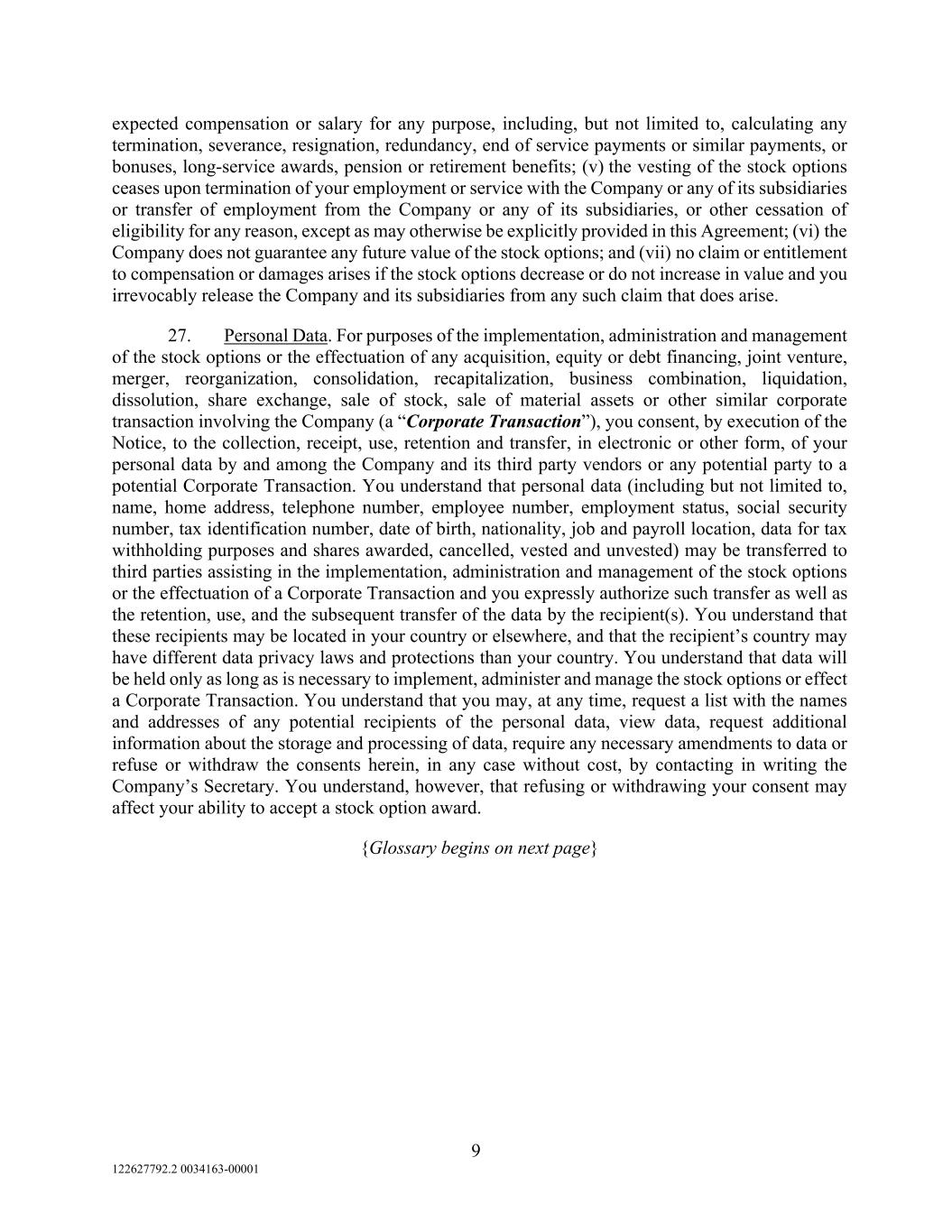 9 122627792.2 0034163-00001 expected compensation or salary for any purpose, including, but not limited to, calculating any termination, severance, resignation, redundancy, end of service payments or similar payments, or bonuses, long-service awards, pension or retirement benefits; (v) the vesting of the stock options ceases upon termination of your employment or service with the Company or any of its subsidiaries or transfer of employment from the Company or any of its subsidiaries, or other cessation of eligibility for any reason, except as may otherwise be explicitly provided in this Agreement; (vi) the Company does not guarantee any future value of the stock options; and (vii) no claim or entitlement to compensation or damages arises if the stock options decrease or do not increase in value and you irrevocably release the Company and its subsidiaries from any such claim that does arise. 27. Personal Data. For purposes of the implementation, administration and management of the stock options or the effectuation of any acquisition, equity or debt financing, joint venture, merger, reorganization, consolidation, recapitalization, business combination, liquidation, dissolution, share exchange, sale of stock, sale of material assets or other similar corporate transaction involving the Company (a “Corporate Transaction”), you consent, by execution of the Notice, to the collection, receipt, use, retention and transfer, in electronic or other form, of your personal data by and among the Company and its third party vendors or any potential party to a potential Corporate Transaction. You understand that personal data (including but not limited to, name, home address, telephone number, employee number, employment status, social security number, tax identification number, date of birth, nationality, job and payroll location, data for tax withholding purposes and shares awarded, cancelled, vested and unvested) may be transferred to third parties assisting in the implementation, administration and management of the stock options or the effectuation of a Corporate Transaction and you expressly authorize such transfer as well as the retention, use, and the subsequent transfer of the data by the recipient(s). You understand that these recipients may be located in your country or elsewhere, and that the recipient’s country may have different data privacy laws and protections than your country. You understand that data will be held only as long as is necessary to implement, administer and manage the stock options or effect a Corporate Transaction. You understand that you may, at any time, request a list with the names and addresses of any potential recipients of the personal data, view data, request additional information about the storage and processing of data, require any necessary amendments to data or refuse or withdraw the consents herein, in any case without cost, by contacting in writing the Company’s Secretary. You understand, however, that refusing or withdrawing your consent may affect your ability to accept a stock option award. {Glossary begins on next page}