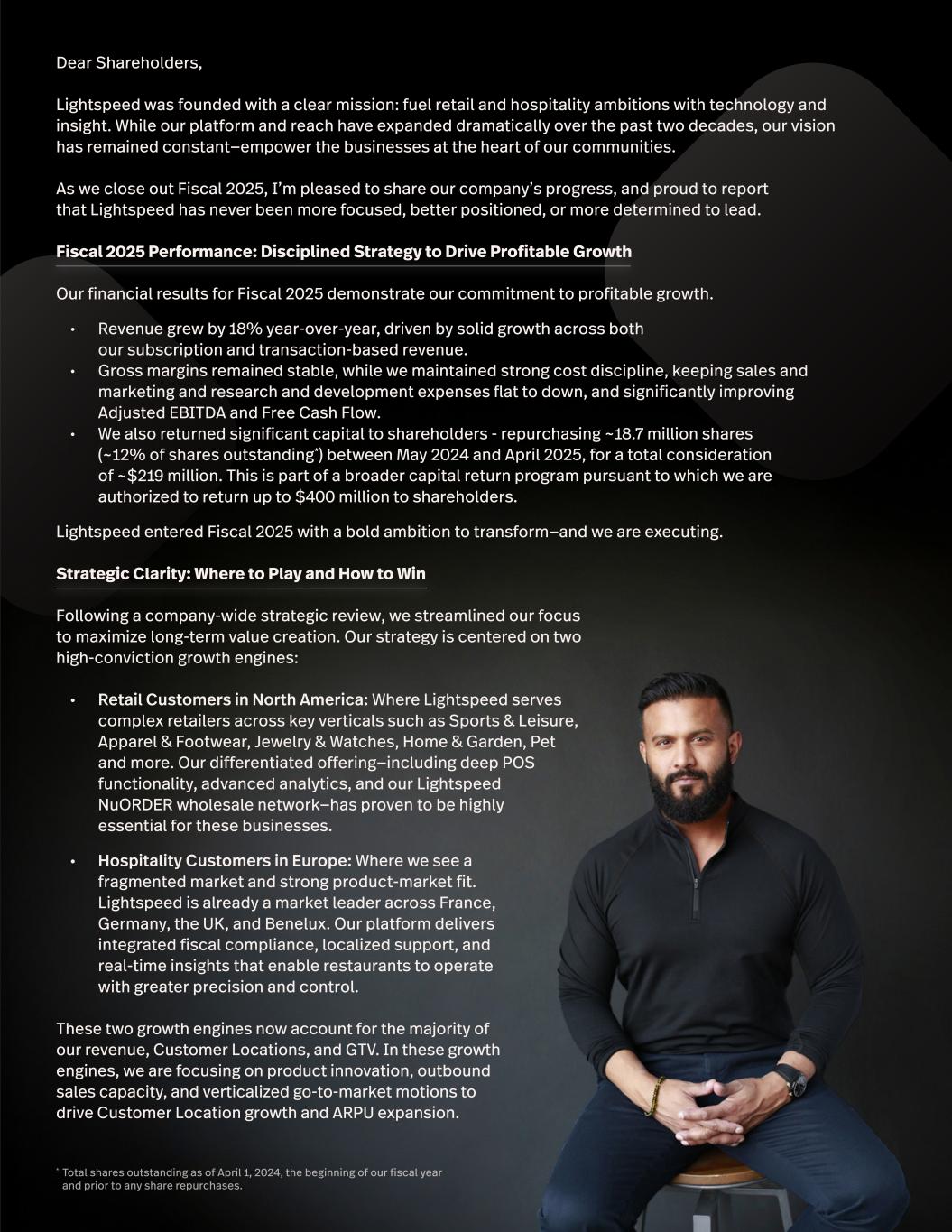 Dear Shareholders, Lightspeed was founded with a clear mission: fuel retail and hospitality ambitions with technology and insight. While our platform and reach have expanded dramatically over the past two decades, our vision has remained constant—empower the businesses at the heart of our communities. As we close out Fiscal 2025, I’m pleased to share our company’s progress, and proud to report that Lightspeed has never been more focused, better positioned, or more determined to lead. Fiscal 2025 Performance: Disciplined Strategy to Drive Profitable Growth Our financial results for Fiscal 2025 demonstrate our commitment to profitable growth. • Revenue grew by 18% year-over-year, driven by solid growth across both our subscription and transaction-based revenue. • Gross margins remained stable, while we maintained strong cost discipline, keeping sales and marketing and research and development expenses flat to down, and significantly improving Adjusted EBITDA and Free Cash Flow. • We also returned significant capital to shareholders - repurchasing ~18.7 million shares (~12% of shares outstanding*) between May 2024 and April 2025, for a total consideration of ~$219 million. This is part of a broader capital return program pursuant to which we are authorized to return up to $400 million to shareholders. Lightspeed entered Fiscal 2025 with a bold ambition to transform—and we are executing. Strategic Clarity: Where to Play and How to Win Following a company-wide strategic review, we streamlined our focus to maximize long-term value creation. Our strategy is centered on two high-conviction growth engines: • Retail Customers in North America: Where Lightspeed serves complex retailers across key verticals such as Sports & Leisure, Apparel & Footwear, Jewelry & Watches, Home & Garden, Pet and more. Our differentiated offering—including deep POS functionality, advanced analytics, and our Lightspeed NuORDER wholesale network—has proven to be highly essential for these businesses. • Hospitality Customers in Europe: Where we see a fragmented market and strong product-market fit. Lightspeed is already a market leader across France, Germany, the UK, and Benelux. Our platform delivers integrated fiscal compliance, localized support, and real-time insights that enable restaurants to operate with greater precision and control. These two growth engines now account for the majority of our revenue, Customer Locations, and GTV. In these growth engines, we are focusing on product innovation, outbound sales capacity, and verticalized go-to-market motions to drive Customer Location growth and ARPU expansion. * Total shares outstanding as of April 1, 2024, the beginning of our fiscal year and prior to any share repurchases.