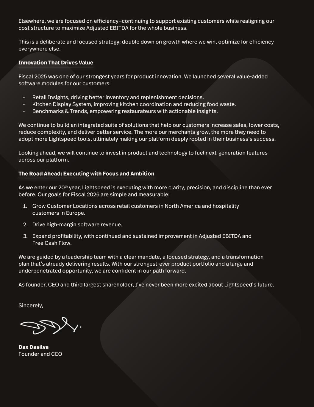 Elsewhere, we are focused on efficiency—continuing to support existing customers while realigning our cost structure to maximize Adjusted EBITDA for the whole business. This is a deliberate and focused strategy: double down on growth where we win, optimize for efficiency everywhere else. Innovation That Drives Value Fiscal 2025 was one of our strongest years for product innovation. We launched several value-added software modules for our customers: • Retail Insights, driving better inventory and replenishment decisions. • Kitchen Display System, improving kitchen coordination and reducing food waste. • Benchmarks & Trends, empowering restaurateurs with actionable insights. We continue to build an integrated suite of solutions that help our customers increase sales, lower costs, reduce complexity, and deliver better service. The more our merchants grow, the more they need to adopt more Lightspeed tools, ultimately making our platform deeply rooted in their business’s success. Looking ahead, we will continue to invest in product and technology to fuel next-generation features across our platform. The Road Ahead: Executing with Focus and Ambition As we enter our 20th year, Lightspeed is executing with more clarity, precision, and discipline than ever before. Our goals for Fiscal 2026 are simple and measurable: 1. Grow Customer Locations across retail customers in North America and hospitality customers in Europe. 2. Drive high-margin software revenue. 3. Expand profitability, with continued and sustained improvement in Adjusted EBITDA and Free Cash Flow. We are guided by a leadership team with a clear mandate, a focused strategy, and a transformation plan that’s already delivering results. With our strongest-ever product portfolio and a large and underpenetrated opportunity, we are confident in our path forward. As founder, CEO and third largest shareholder, I’ve never been more excited about Lightspeed’s future. Sincerely, Dax Dasilva Founder and CEO