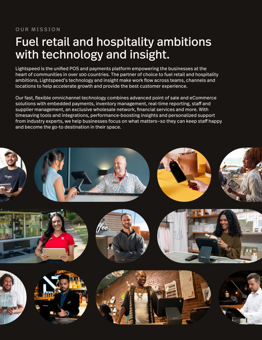 O U R M I S S I O N Fuel retail and hospitality ambitions with technology and insight. Lightspeed is the unified POS and payments platform empowering the businesses at the heart of communities in over 100 countries. The partner of choice to fuel retail and hospitality ambitions, Lightspeed’s technology and insight make work flow across teams, channels and locations to help accelerate growth and provide the best customer experience. Our fast, flexible omnichannel technology combines advanced point of sale and eCommerce solutions with embedded payments, inventory management, real-time reporting, staff and supplier management, an exclusive wholesale network, financial services and more. With timesaving tools and integrations, performance-boosting insights and personalized support from industry experts, we help businesses focus on what matters—so they can keep staff happy and become the go-to destination in their space.