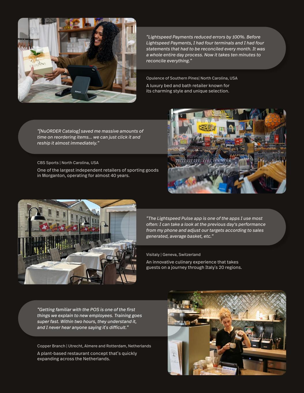 Opulence of Southern Pines| North Carolina, USA A luxury bed and bath retailer known for its charming style and unique selection. “Lightspeed Payments reduced errors by 100%. Before Lightspeed Payments, I had four terminals and I had four statements that had to be reconciled every month. It was a whole entire day process. Now it takes ten minutes to reconcile everything.” CBS Sports | North Carolina, USA One of the largest independent retailers of sporting goods in Morganton, operating for almost 40 years. “[NuORDER Catalog] saved me massive amounts of time on reordering items... we can just click it and reship it almost immediately.” Visitaly | Geneva, Switzerland An innovative culinary experience that takes guests on a journey through Italyʼs 20 regions. “The Lightspeed Pulse app is one of the apps I use most often: I can take a look at the previous day's performance from my phone and adjust our targets according to sales generated, average basket, etc.” Copper Branch | Utrecht, Almere and Rotterdam, Netherlands A plant-based restaurant concept that’s quickly expanding across the Netherlands. “Getting familiar with the POS is one of the first things we explain to new employees. Training goes super fast. Within two hours, they understand it, and I never hear anyone saying itʼs difficult.”