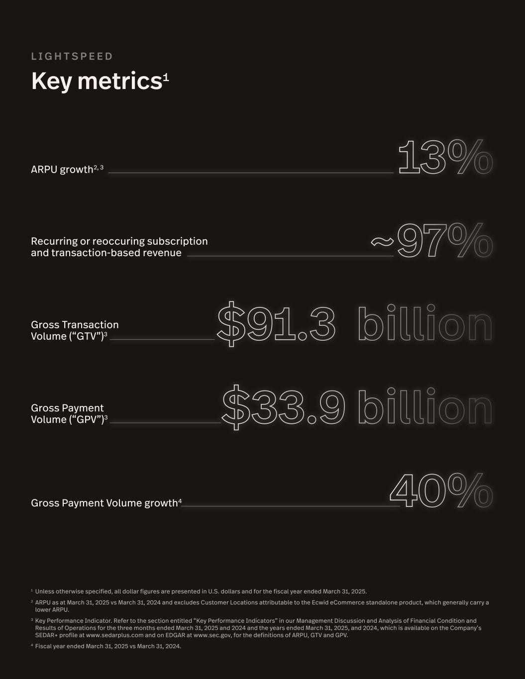 L I G H T S P E E D Key metrics1 1 Unless otherwise specified, all dollar figures are presented in U.S. dollars and for the fiscal year ended March 31, 2025. 2 ARPU as at March 31, 2025 vs March 31, 2024 and excludes Customer Locations attributable to the Ecwid eCommerce standalone product, which generally carry a lower ARPU. 3 Key Performance Indicator. Refer to the section entitled “Key Performance Indicators” in our Management Discussion and Analysis of Financial Condition and Results of Operations for the three months ended March 31, 2025 and 2024 and the years ended March 31, 2025, and 2024, which is available on the Company’s SEDAR+ profile at www.sedarplus.com and on EDGAR at www.sec.gov, for the definitions of ARPU, GTV and GPV. 4 Fiscal year ended March 31, 2025 vs March 31, 2024. ARPU growth2, 3 Recurring or reoccuring subscription and transaction-based revenue Gross Transaction Volume (“GTV”)3 Gross Payment Volume (“GPV”)3 Gross Payment Volume growth4 13% ~97% $91.3 billion $33.9 billion 40%