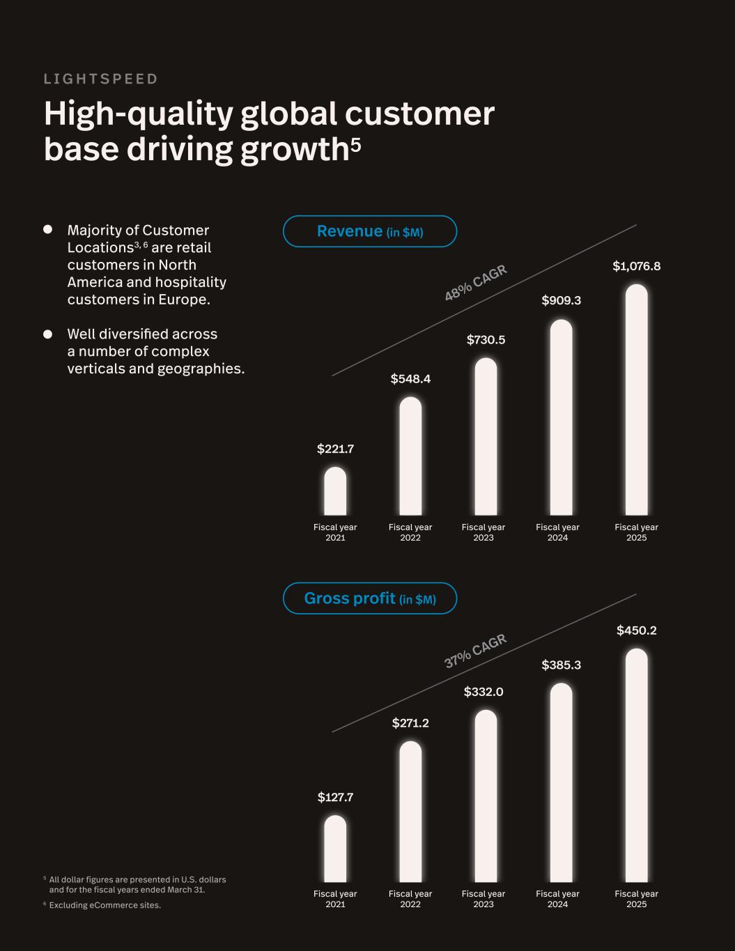 5 All dollar figures are presented in U.S. dollars and for the fiscal years ended March 31. 6 Excluding eCommerce sites. Revenue (in $M) Gross profit (in $M) Majority of Customer Locations3, 6 are retail customers in North America and hospitality customers in Europe. Well diversified across a number of complex verticals and geographies. L I G H T S P E E D High-quality global customer base driving growth5 Fiscal year 2021 $221.7 $127.7 $548.4 $271.2 $730.5 $332.0 $909.3 $385.3 Fiscal year 2022 Fiscal year 2023 Fiscal year 2024 Fiscal year 2025 48% CAGR 37% CAGR $1,076.8 $450.2 Fiscal year 2021 Fiscal year 2022 Fiscal year 2023 Fiscal year 2024 Fiscal year 2025