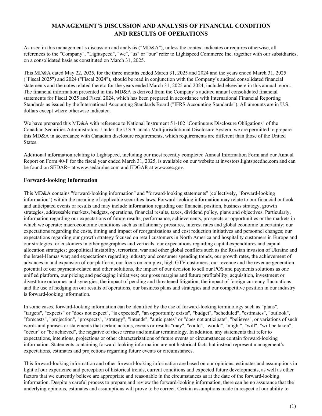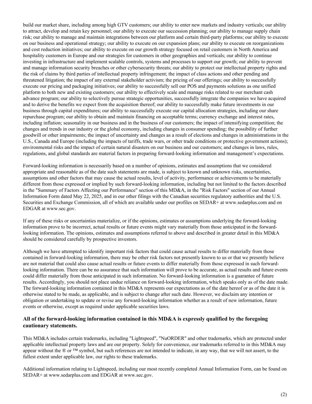 build our market share, including among high GTV customers; our ability to enter new markets and industry verticals; our ability to attract, develop and retain key personnel; our ability to execute our succession planning; our ability to manage supply chain risk; our ability to manage and maintain integrations between our platform and certain third-party platforms; our ability to execute on our business and operational strategy; our ability to execute on our expansion plans; our ability to execute on reorganizations and cost reduction initiatives; our ability to execute on our growth strategy focused on retail customers in North America and hospitality customers in Europe and our strategies for customers in other geographies and verticals; our ability to continue investing in infrastructure and implement scalable controls, systems and processes to support our growth; our ability to prevent and manage information security breaches or other cybersecurity threats; our ability to protect our intellectual property rights and the risk of claims by third parties of intellectual property infringement; the impact of class actions and other pending and threatened litigation; the impact of any external stakeholder activism; the pricing of our offerings; our ability to successfully execute our pricing and packaging initiatives; our ability to successfully sell our POS and payments solutions as one unified platform to both new and existing customers; our ability to effectively scale and manage risks related to our merchant cash advance program; our ability to selectively pursue strategic opportunities, successfully integrate the companies we have acquired and to derive the benefits we expect from the acquisition thereof; our ability to successfully make future investments in our business through capital expenditures; our ability to successfully execute our capital allocation strategies, including our share repurchase program; our ability to obtain and maintain financing on acceptable terms; currency exchange and interest rates, including inflation; seasonality in our business and in the business of our customers; the impact of intensifying competition; the changes and trends in our industry or the global economy, including changes in consumer spending; the possibility of further goodwill or other impairments; the impact of uncertainty and changes as a result of elections and changes in administrations in the U.S., Canada and Europe (including the impacts of tariffs, trade wars, or other trade conditions or protective government actions); environmental risks and the impact of certain natural disasters on our business and our customers; and changes in laws, rules, regulations, and global standards are material factors in preparing forward-looking information and management’s expectations. Forward-looking information is necessarily based on a number of opinions, estimates and assumptions that we considered appropriate and reasonable as of the date such statements are made, is subject to known and unknown risks, uncertainties, assumptions and other factors that may cause the actual results, level of activity, performance or achievements to be materially different from those expressed or implied by such forward-looking information, including but not limited to the factors described in the "Summary of Factors Affecting our Performance" section of this MD&A, in the "Risk Factors" section of our Annual Information Form dated May 22, 2025, and in our other filings with the Canadian securities regulatory authorities and the U.S. Securities and Exchange Commission, all of which are available under our profiles on SEDAR+ at www.sedarplus.com and on EDGAR at www.sec.gov. If any of these risks or uncertainties materialize, or if the opinions, estimates or assumptions underlying the forward-looking information prove to be incorrect, actual results or future events might vary materially from those anticipated in the forward- looking information. The opinions, estimates and assumptions referred to above and described in greater detail in this MD&A should be considered carefully by prospective investors. Although we have attempted to identify important risk factors that could cause actual results to differ materially from those contained in forward-looking information, there may be other risk factors not presently known to us or that we presently believe are not material that could also cause actual results or future events to differ materially from those expressed in such forward- looking information. There can be no assurance that such information will prove to be accurate, as actual results and future events could differ materially from those anticipated in such information. No forward-looking information is a guarantee of future results. Accordingly, you should not place undue reliance on forward-looking information, which speaks only as of the date made. The forward-looking information contained in this MD&A represents our expectations as of the date hereof or as of the date it is otherwise stated to be made, as applicable, and is subject to change after such date. However, we disclaim any intention or obligation or undertaking to update or revise any forward-looking information whether as a result of new information, future events or otherwise, except as required under applicable securities laws. All of the forward-looking information contained in this MD&A is expressly qualified by the foregoing cautionary statements. This MD&A includes certain trademarks, including "Lightspeed", "NuORDER" and other trademarks, which are protected under applicable intellectual property laws and are our property. Solely for convenience, our trademarks referred to in this MD&A may appear without the ® or ™ symbol, but such references are not intended to indicate, in any way, that we will not assert, to the fullest extent under applicable law, our rights to these trademarks. Additional information relating to Lightspeed, incl