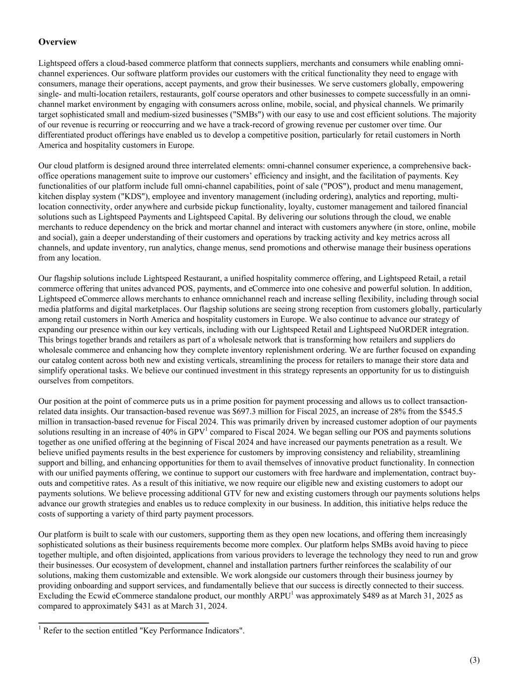 Overview Lightspeed offers a cloud-based commerce platform that connects suppliers, merchants and consumers while enabling omni- channel experiences. Our software platform provides our customers with the critical functionality they need to engage with consumers, manage their operations, accept payments, and grow their businesses. We serve customers globally, empowering single- and multi-location retailers, restaurants, golf course operators and other businesses to compete successfully in an omni- channel market environment by engaging with consumers across online, mobile, social, and physical channels. We primarily target sophisticated small and medium-sized businesses ("SMBs") with our easy to use and cost efficient solutions. The majority of our revenue is recurring or reoccurring and we have a track-record of growing revenue per customer over time. Our differentiated product offerings have enabled us to develop a competitive position, particularly for retail customers in North America and hospitality customers in Europe. Our cloud platform is designed around three interrelated elements: omni-channel consumer experience, a comprehensive back- office operations management suite to improve our customers’ efficiency and insight, and the facilitation of payments. Key functionalities of our platform include full omni-channel capabilities, point of sale ("POS"), product and menu management, kitchen display system ("KDS"), employee and inventory management (including ordering), analytics and reporting, multi- location connectivity, order anywhere and curbside pickup functionality, loyalty, customer management and tailored financial solutions such as Lightspeed Payments and Lightspeed Capital. By delivering our solutions through the cloud, we enable merchants to reduce dependency on the brick and mortar channel and interact with customers anywhere (in store, online, mobile and social), gain a deeper understanding of their customers and operations by tracking activity and key metrics across all channels, and update inventory, run analytics, change menus, send promotions and otherwise manage their business operations from any location. Our flagship solutions include Lightspeed Restaurant, a unified hospitality commerce offering, and Lightspeed Retail, a retail commerce offering that unites advanced POS, payments, and eCommerce into one cohesive and powerful solution. In addition, Lightspeed eCommerce allows merchants to enhance omnichannel reach and increase selling flexibility, including through social media platforms and digital marketplaces. Our flagship solutions are seeing strong reception from customers globally, particularly among retail customers in North America and hospitality customers in Europe. We also continue to advance our strategy of expanding our presence within our key verticals, including with our Lightspeed Retail and Lightspeed NuORDER integration. This brings together brands and retailers as part of a wholesale network that is transforming how retailers and suppliers do wholesale commerce and enhancing how they complete inventory replenishment ordering. We are further focused on expanding our catalog content across both new and existing verticals, streamlining the process for retailers to manage their store data and simplify operational tasks. We believe our continued investment in this strategy represents an opportunity for us to distinguish ourselves from competitors. Our position at the point of commerce puts us in a prime position for payment processing and allows us to collect transaction- related data insights. Our transaction-based revenue was $697.3 million for Fiscal 2025, an increase of 28% from the $545.5 million in transaction-based revenue for Fiscal 2024. This was primarily driven by increased customer adoption of our payments solutions resulting in an increase of 40% in GPV1 compared to Fiscal 2024. We began selling our POS and payments solutions together as one unified offering at the beginning of Fiscal 2024 and have increased our payments penetration as a result. We believe unified payments results in the best experience for customers by improving consistency and reliability, streamlining support and billing, and enhancing opportunities for them to avail themselves of innovative product functionality. In connection with our unified payments offering, we continue to support our customers with free hardware and implementation, contract buy- outs and competitive rates. As a result of this initiative, we now require our eligible new and existing customers to adopt our payments solutions. We believe processing additional GTV for new and existing customers through our payments solutions helps advance our growth strategies and enables us to reduce complexity in our business. In addition, this initiative helps reduce the costs of supporting a variety of third party payment processors. Our platform is built to scale with our customers, supporting them as they open new locations, and offering them increasingly sophisticated solutions as their business requirements become more complex. Our platform helps SMBs avoid having to piece together multiple, and often disjointed, applications from various providers to leverage the technology they need to run and grow their businesses. Our ecosystem of development, channel and installation partners further reinforces the scalability of our solutions, making them customizable and extensible. We work alongside our customers through their business journey by providing onboarding and support services, and fundamentally believe that our success is directly connected to their success. Excluding the Ecwid eCommerce standalone product, our monthly ARPU1 was approximately $489 as at March 31, 2025 as compared to approximately $431 as at March 31, 2024. (3) 1 Refer to the section entitled "Key Performance Indicators".
