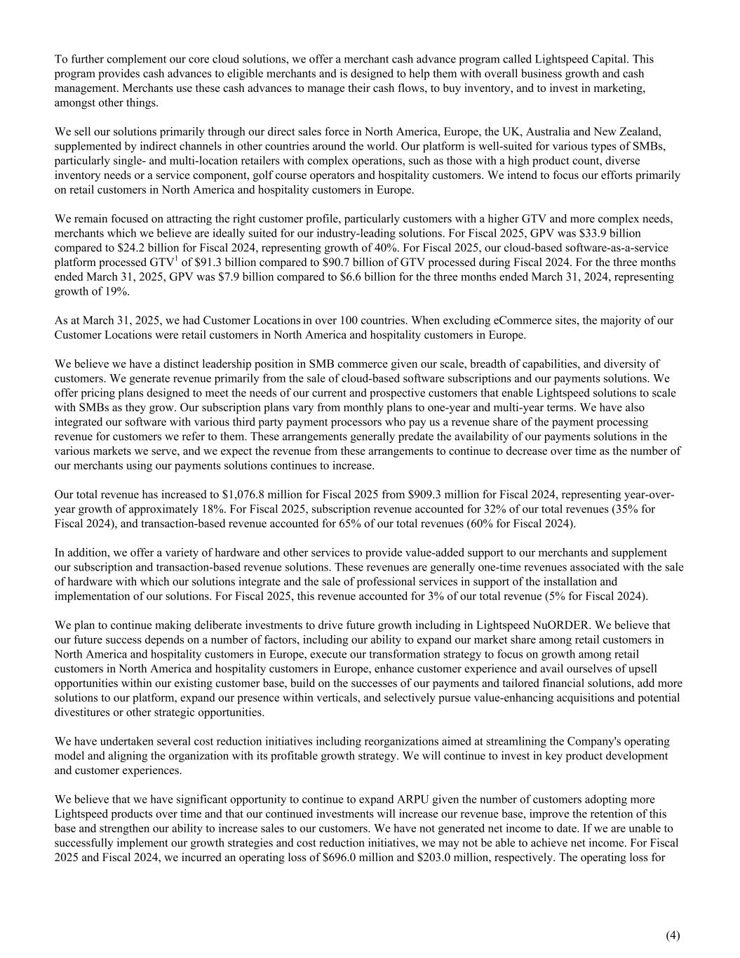 To further complement our core cloud solutions, we offer a merchant cash advance program called Lightspeed Capital. This program provides cash advances to eligible merchants and is designed to help them with overall business growth and cash management. Merchants use these cash advances to manage their cash flows, to buy inventory, and to invest in marketing, amongst other things. We sell our solutions primarily through our direct sales force in North America, Europe, the UK, Australia and New Zealand, supplemented by indirect channels in other countries around the world. Our platform is well-suited for various types of SMBs, particularly single- and multi-location retailers with complex operations, such as those with a high product count, diverse inventory needs or a service component, golf course operators and hospitality customers. We intend to focus our efforts primarily on retail customers in North America and hospitality customers in Europe. We remain focused on attracting the right customer profile, particularly customers with a higher GTV and more complex needs, merchants which we believe are ideally suited for our industry-leading solutions. For Fiscal 2025, GPV was $33.9 billion compared to $24.2 billion for Fiscal 2024, representing growth of 40%. For Fiscal 2025, our cloud-based software-as-a-service platform processed GTV1 of $91.3 billion compared to $90.7 billion of GTV processed during Fiscal 2024. For the three months ended March 31, 2025, GPV was $7.9 billion compared to $6.6 billion for the three months ended March 31, 2024, representing growth of 19%. As at March 31, 2025, we had Customer Locations in over 100 countries. When excluding eCommerce sites, the majority of our Customer Locations were retail customers in North America and hospitality customers in Europe. We believe we have a distinct leadership position in SMB commerce given our scale, breadth of capabilities, and diversity of customers. We generate revenue primarily from the sale of cloud-based software subscriptions and our payments solutions. We offer pricing plans designed to meet the needs of our current and prospective customers that enable Lightspeed solutions to scale with SMBs as they grow. Our subscription plans vary from monthly plans to one-year and multi-year terms. We have also integrated our software with various third party payment processors who pay us a revenue share of the payment processing revenue for customers we refer to them. These arrangements generally predate the availability of our payments solutions in the various markets we serve, and we expect the revenue from these arrangements to continue to decrease over time as the number of our merchants using our payments solutions continues to increase. Our total revenue has increased to $1,076.8 million for Fiscal 2025 from $909.3 million for Fiscal 2024, representing year-over- year growth of approximately 18%. For Fiscal 2025, subscription revenue accounted for 32% of our total revenues (35% for Fiscal 2024), and transaction-based revenue accounted for 65% of our total revenues (60% for Fiscal 2024). In addition, we offer a variety of hardware and other services to provide value-added support to our merchants and supplement our subscription and transaction-based revenue solutions. These revenues are generally one-time revenues associated with the sale of hardware with which our solutions integrate and the sale of professional services in support of the installation and implementation of our solutions. For Fiscal 2025, this revenue accounted for 3% of our total revenue (5% for Fiscal 2024). We plan to continue making deliberate investments to drive future growth including in Lightspeed NuORDER. We believe that our future success depends on a number of factors, including our ability to expand our market share among retail customers in North America and hospitality customers in Europe, execute our transformation strategy to focus on growth among retail customers in North America and hospitality customers in Europe, enhance customer experience and avail ourselves of upsell opportunities within our existing customer base, build on the successes of our payments and tailored financial solutions, add more solutions to our platform, expand our presence within verticals, and selectively pursue value-enhancing acquisitions and potential divestitures or other strategic opportunities. We have undertaken several cost reduction initiatives including reorganizations aimed at streamlining the Company's operating model and aligning the organization with its profitable growth strategy. We will continue to invest in key product development and customer experiences. We believe that we have significant opportunity to continue to expand ARPU given the number of customers adopting more Lightspeed products over time and that our continued investments will increase our revenue base, improve the retention of this base and strengthen our ability to increase sales to our customers. We have not generated net income to date. If we are unable to successfully implement our growth strategies and cost reduction initiatives, we may not be able to achieve net income. For Fiscal 2025 and Fiscal 2024, we incurred an operating loss of $696.0 million and $203.0 million, respectively. The operating loss for (4)