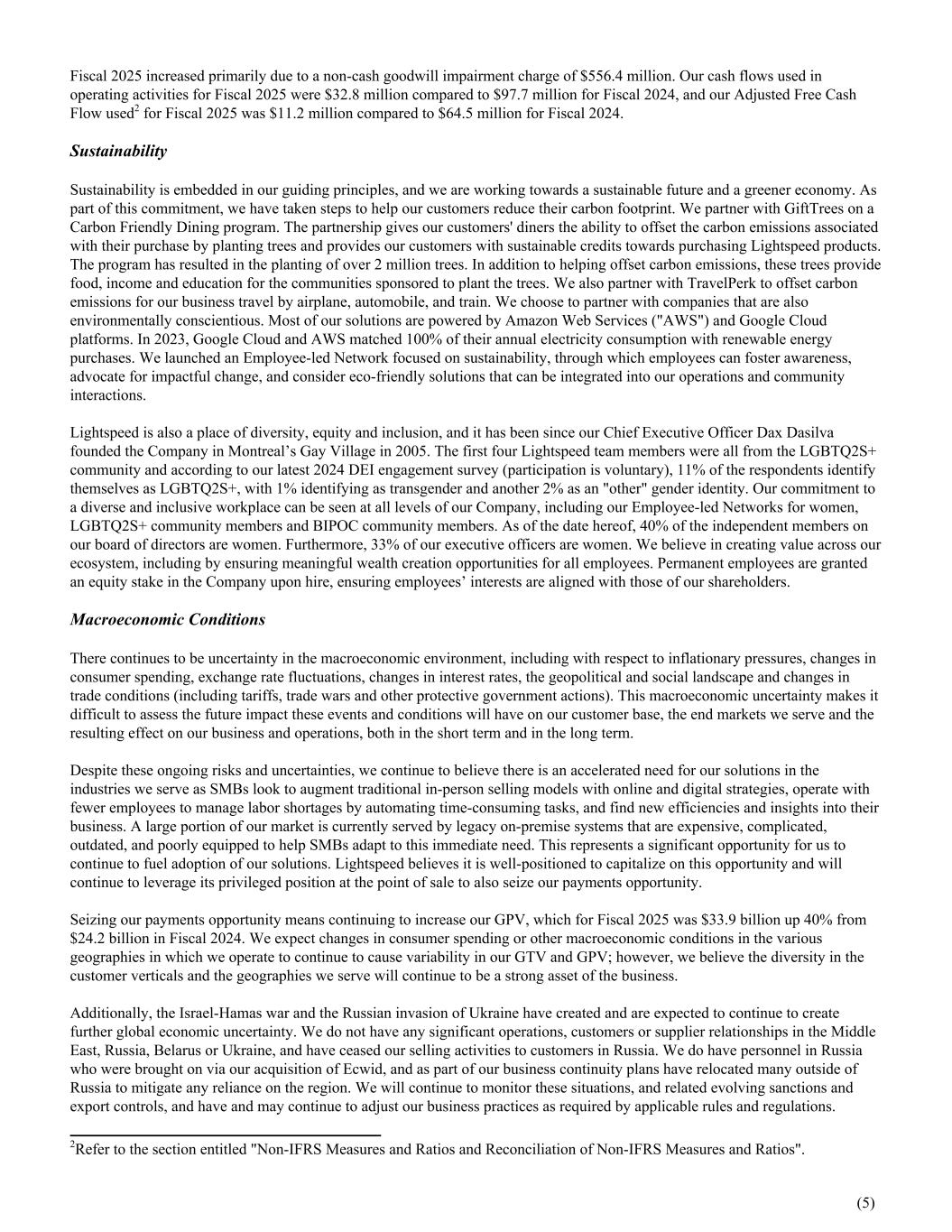 Fiscal 2025 increased primarily due to a non-cash goodwill impairment charge of $556.4 million. Our cash flows used in operating activities for Fiscal 2025 were $32.8 million compared to $97.7 million for Fiscal 2024, and our Adjusted Free Cash Flow used2 for Fiscal 2025 was $11.2 million compared to $64.5 million for Fiscal 2024. Sustainability Sustainability is embedded in our guiding principles, and we are working towards a sustainable future and a greener economy. As part of this commitment, we have taken steps to help our customers reduce their carbon footprint. We partner with GiftTrees on a Carbon Friendly Dining program. The partnership gives our customers' diners the ability to offset the carbon emissions associated with their purchase by planting trees and provides our customers with sustainable credits towards purchasing Lightspeed products. The program has resulted in the planting of over 2 million trees. In addition to helping offset carbon emissions, these trees provide food, income and education for the communities sponsored to plant the trees. We also partner with TravelPerk to offset carbon emissions for our business travel by airplane, automobile, and train. We choose to partner with companies that are also environmentally conscientious. Most of our solutions are powered by Amazon Web Services ("AWS") and Google Cloud platforms. In 2023, Google Cloud and AWS matched 100% of their annual electricity consumption with renewable energy purchases. We launched an Employee-led Network focused on sustainability, through which employees can foster awareness, advocate for impactful change, and consider eco-friendly solutions that can be integrated into our operations and community interactions. Lightspeed is also a place of diversity, equity and inclusion, and it has been since our Chief Executive Officer Dax Dasilva founded the Company in Montreal’s Gay Village in 2005. The first four Lightspeed team members were all from the LGBTQ2S+ community and according to our latest 2024 DEI engagement survey (participation is voluntary), 11% of the respondents identify themselves as LGBTQ2S+, with 1% identifying as transgender and another 2% as an "other" gender identity. Our commitment to a diverse and inclusive workplace can be seen at all levels of our Company, including our Employee-led Networks for women, LGBTQ2S+ community members and BIPOC community members. As of the date hereof, 40% of the independent members on our board of directors are women. Furthermore, 33% of our executive officers are women. We believe in creating value across our ecosystem, including by ensuring meaningful wealth creation opportunities for all employees. Permanent employees are granted an equity stake in the Company upon hire, ensuring employees’ interests are aligned with those of our shareholders. Macroeconomic Conditions There continues to be uncertainty in the macroeconomic environment, including with respect to inflationary pressures, changes in consumer spending, exchange rate fluctuations, changes in interest rates, the geopolitical and social landscape and changes in trade conditions (including tariffs, trade wars and other protective government actions). This macroeconomic uncertainty makes it difficult to assess the future impact these events and conditions will have on our customer base, the end markets we serve and the resulting effect on our business and operations, both in the short term and in the long term. Despite these ongoing risks and uncertainties, we continue to believe there is an accelerated need for our solutions in the industries we serve as SMBs look to augment traditional in-person selling models with online and digital strategies, operate with fewer employees to manage labor shortages by automating time-consuming tasks, and find new efficiencies and insights into their business. A large portion of our market is currently served by legacy on-premise systems that are expensive, complicated, outdated, and poorly equipped to help SMBs adapt to this immediate need. This represents a significant opportunity for us to continue to fuel adoption of our solutions. Lightspeed believes it is well-positioned to capitalize on this opportunity and will continue to leverage its privileged position at the point of sale to also seize our payments opportunity. Seizing our payments opportunity means continuing to increase our GPV, which for Fiscal 2025 was $33.9 billion up 40% from $24.2 billion in Fiscal 2024. We expect changes in consumer spending or other macroeconomic conditions in the various geographies in which we operate to continue to cause variability in our GTV and GPV; however, we believe the diversity in the customer verticals and the geographies we serve will continue to be a strong asset of the business. Additionally, the Israel-Hamas war and the Russian invasion of Ukraine have created and are expected to continue to create further global economic uncertainty. We do not have any significant operations, customers or supplier relationships in the Middle East, Russia, Belarus or Ukraine, and have ceased our selling activities to customers in Russia. We do have personnel in Russia who were brought on via our acquisition of Ecwid, and as part of our business continuity plans have relocated many outside of Russia to mitigate any reliance on the region. We will continue to monitor these situations, and related evolving sanctions and export controls, and have and may continue to adjust our business practices as required by applicable rules and regulations. (5) 2Refer to the section entitled "Non-IFRS Measures and Ratios and Reconciliation of Non-IFRS Measures and Ratios".