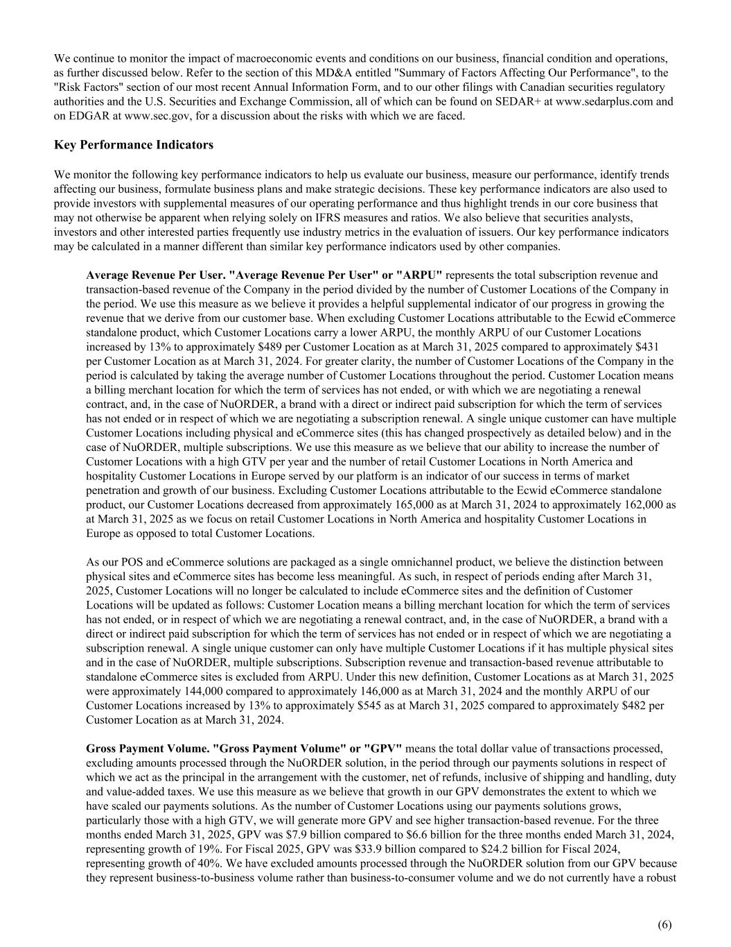 We continue to monitor the impact of macroeconomic events and conditions on our business, financial condition and operations, as further discussed below. Refer to the section of this MD&A entitled "Summary of Factors Affecting Our Performance", to the "Risk Factors" section of our most recent Annual Information Form, and to our other filings with Canadian securities regulatory authorities and the U.S. Securities and Exchange Commission, all of which can be found on SEDAR+ at www.sedarplus.com and on EDGAR at www.sec.gov, for a discussion about the risks with which we are faced. Key Performance Indicators We monitor the following key performance indicators to help us evaluate our business, measure our performance, identify trends affecting our business, formulate business plans and make strategic decisions. These key performance indicators are also used to provide investors with supplemental measures of our operating performance and thus highlight trends in our core business that may not otherwise be apparent when relying solely on IFRS measures and ratios. We also believe that securities analysts, investors and other interested parties frequently use industry metrics in the evaluation of issuers. Our key performance indicators may be calculated in a manner different than similar key performance indicators used by other companies. Average Revenue Per User. "Average Revenue Per User" or "ARPU" represents the total subscription revenue and transaction-based revenue of the Company in the period divided by the number of Customer Locations of the Company in the period. We use this measure as we believe it provides a helpful supplemental indicator of our progress in growing the revenue that we derive from our customer base. When excluding Customer Locations attributable to the Ecwid eCommerce standalone product, which Customer Locations carry a lower ARPU, the monthly ARPU of our Customer Locations increased by 13% to approximately $489 per Customer Location as at March 31, 2025 compared to approximately $431 per Customer Location as at March 31, 2024. For greater clarity, the number of Customer Locations of the Company in the period is calculated by taking the average number of Customer Locations throughout the period. Customer Location means a billing merchant location for which the term of services has not ended, or with which we are negotiating a renewal contract, and, in the case of NuORDER, a brand with a direct or indirect paid subscription for which the term of services has not ended or in respect of which we are negotiating a subscription renewal. A single unique customer can have multiple Customer Locations including physical and eCommerce sites (this has changed prospectively as detailed below) and in the case of NuORDER, multiple subscriptions. We use this measure as we believe that our ability to increase the number of Customer Locations with a high GTV per year and the number of retail Customer Locations in North America and hospitality Customer Locations in Europe served by our platform is an indicator of our success in terms of market penetration and growth of our business. Excluding Customer Locations attributable to the Ecwid eCommerce standalone product, our Customer Locations decreased from approximately 165,000 as at March 31, 2024 to approximately 162,000 as at March 31, 2025 as we focus on retail Customer Locations in North America and hospitality Customer Locations in Europe as opposed to total Customer Locations. As our POS and eCommerce solutions are packaged as a single omnichannel product, we believe the distinction between physical sites and eCommerce sites has become less meaningful. As such, in respect of periods ending after March 31, 2025, Customer Locations will no longer be calculated to include eCommerce sites and the definition of Customer Locations will be updated as follows: Customer Location means a billing merchant location for which the term of services has not ended, or in respect of which we are negotiating a renewal contract, and, in the case of NuORDER, a brand with a direct or indirect paid subscription for which the term of services has not ended or in respect of which we are negotiating a subscription renewal. A single unique customer can only have multiple Customer Locations if it has multiple physical sites and in the case of NuORDER, multiple subscriptions. Subscription revenue and transaction-based revenue attributable to standalone eCommerce sites is excluded from ARPU. Under this new definition, Customer Locations as at March 31, 2025 were approximately 144,000 compared to approximately 146,000 as at March 31, 2024 and the monthly ARPU of our Customer Locations increased by 13% to approximately $545 as at March 31, 2025 compared to approximately $482 per Customer Location as at March 31, 2024. Gross Payment Volume. "Gross Payment Volume" or "GPV" means the total dollar value of transactions processed, excluding amounts processed through the NuORDER solution, in the period through our payments solutions in respect of which we act as the principal in the arrangement with the customer, net of refunds, inclusive of shipping and handling, duty and value-added taxes. We use this measure as we believe that growth in our GPV demonstrates the extent to which we have scaled our payments solutions. As the number of Customer Locations using our payments solutions grows, particularly those with a high GTV, we will generate more GPV and see higher transaction-based revenue. For the three months ended March 31, 2025, GPV was $7.9 billion compared to $6.6 billion for the three months ended March 31, 2024, representing growth of 19%. For Fiscal 2025, GPV was $33.9 billion compared to $24.2 billion for Fiscal 2024, representing growth of 40%. We have excluded amounts processed through the NuORDER solution from our GPV because they represent business-to-business volume rather than business-to-consumer volume and we do not currently have a robust (6)