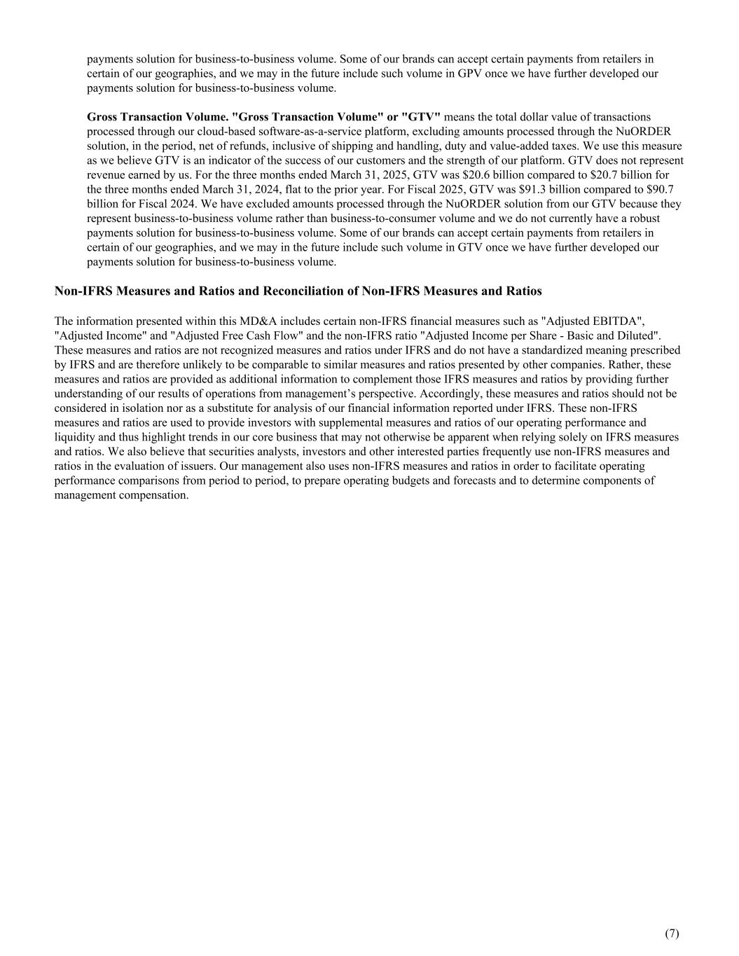 payments solution for business-to-business volume. Some of our brands can accept certain payments from retailers in certain of our geographies, and we may in the future include such volume in GPV once we have further developed our payments solution for business-to-business volume. Gross Transaction Volume. "Gross Transaction Volume" or "GTV" means the total dollar value of transactions processed through our cloud-based software-as-a-service platform, excluding amounts processed through the NuORDER solution, in the period, net of refunds, inclusive of shipping and handling, duty and value-added taxes. We use this measure as we believe GTV is an indicator of the success of our customers and the strength of our platform. GTV does not represent revenue earned by us. For the three months ended March 31, 2025, GTV was $20.6 billion compared to $20.7 billion for the three months ended March 31, 2024, flat to the prior year. For Fiscal 2025, GTV was $91.3 billion compared to $90.7 billion for Fiscal 2024. We have excluded amounts processed through the NuORDER solution from our GTV because they represent business-to-business volume rather than business-to-consumer volume and we do not currently have a robust payments solution for business-to-business volume. Some of our brands can accept certain payments from retailers in certain of our geographies, and we may in the future include such volume in GTV once we have further developed our payments solution for business-to-business volume. Non-IFRS Measures and Ratios and Reconciliation of Non-IFRS Measures and Ratios The information presented within this MD&A includes certain non-IFRS financial measures such as "Adjusted EBITDA", "Adjusted Income" and "Adjusted Free Cash Flow" and the non-IFRS ratio "Adjusted Income per Share - Basic and Diluted". These measures and ratios are not recognized measures and ratios under IFRS and do not have a standardized meaning prescribed by IFRS and are therefore unlikely to be comparable to similar measures and ratios presented by other companies. Rather, these measures and ratios are provided as additional information to complement those IFRS measures and ratios by providing further understanding of our results of operations from management’s perspective. Accordingly, these measures and ratios should not be considered in isolation nor as a substitute for analysis of our financial information reported under IFRS. These non-IFRS measures and ratios are used to provide investors with supplemental measures and ratios of our operating performance and liquidity and thus highlight trends in our core business that may not otherwise be apparent when relying solely on IFRS measures and ratios. We also believe that securities analysts, investors and other interested parties frequently use non-IFRS measures and ratios in the evaluation of issuers. Our management also uses non-IFRS measures and ratios in order to facilitate operating performance comparisons from period to period, to prepare operating budgets and forecasts and to determine components of management compensation. (7)