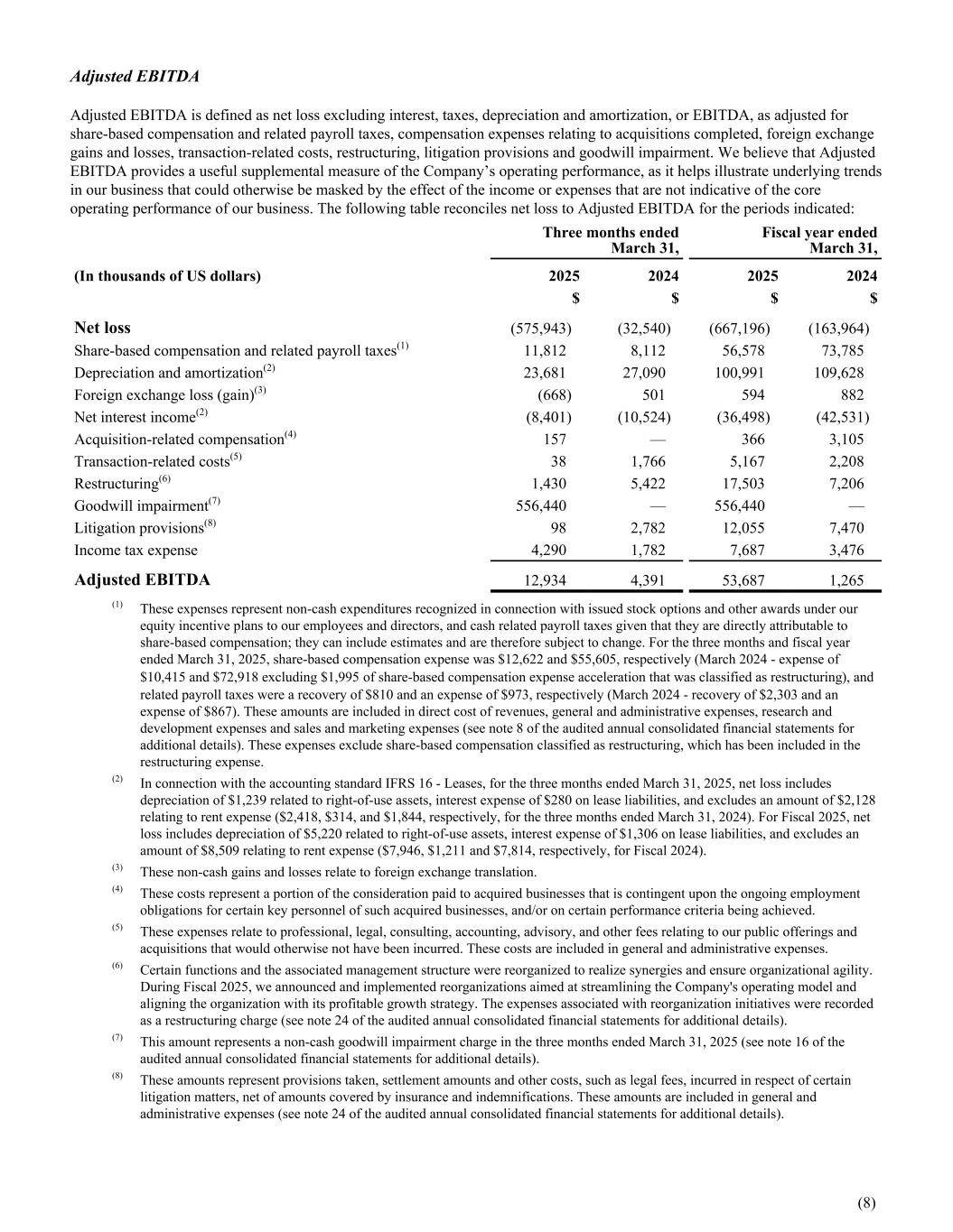 Adjusted EBITDA Adjusted EBITDA is defined as net loss excluding interest, taxes, depreciation and amortization, or EBITDA, as adjusted for share-based compensation and related payroll taxes, compensation expenses relating to acquisitions completed, foreign exchange gains and losses, transaction-related costs, restructuring, litigation provisions and goodwill impairment. We believe that Adjusted EBITDA provides a useful supplemental measure of the Company’s operating performance, as it helps illustrate underlying trends in our business that could otherwise be masked by the effect of the income or expenses that are not indicative of the core operating performance of our business. The following table reconciles net loss to Adjusted EBITDA for the periods indicated: Three months ended March 31, Fiscal year ended March 31, (In thousands of US dollars) 2025 2024 2025 2024 $ $ $ $ Net loss (575,943) (32,540) (667,196) (163,964) Share-based compensation and related payroll taxes(1) 11,812 8,112 56,578 73,785 Depreciation and amortization(2) 23,681 27,090 100,991 109,628 Foreign exchange loss (gain)(3) (668) 501 594 882 Net interest income(2) (8,401) (10,524) (36,498) (42,531) Acquisition-related compensation(4) 157 — 366 3,105 Transaction-related costs(5) 38 1,766 5,167 2,208 Restructuring(6) 1,430 5,422 17,503 7,206 Goodwill impairment(7) 556,440 — 556,440 — Litigation provisions(8) 98 2,782 12,055 7,470 Income tax expense 4,290 1,782 7,687 3,476 Adjusted EBITDA 12,934 4,391 53,687 1,265 (1) These expenses represent non-cash expenditures recognized in connection with issued stock options and other awards under our equity incentive plans to our employees and directors, and cash related payroll taxes given that they are directly attributable to share-based compensation; they can include estimates and are therefore subject to change. For the three months and fiscal year ended March 31, 2025, share-based compensation expense was $12,622 and $55,605, respectively (March 2024 - expense of $10,415 and $72,918 excluding $1,995 of share-based compensation expense acceleration that was classified as restructuring), and related payroll taxes were a recovery of $810 and an expense of $973, respectively (March 2024 - recovery of $2,303 and an expense of $867). These amounts are included in direct cost of revenues, general and administrative expenses, research and development expenses and sales and marketing expenses (see note 8 of the audited annual consolidated financial statements for additional details). These expenses exclude share-based compensation classified as restructuring, which has been included in the restructuring expense. (2) In connection with the accounting standard IFRS 16 - Leases, for the three months ended March 31, 2025, net loss includes depreciation of $1,239 related to right-of-use assets, interest expense of $280 on lease liabilities, and excludes an amount of $2,128 relating to rent expense ($2,418, $314, and $1,844, respectively, for the three months ended March 31, 2024). For Fiscal 2025, net loss includes depreciation of $5,220 related to right-of-use assets, interest expense of $1,306 on lease liabilities, and excludes an amount of $8,509 relating to rent expense ($7,946, $1,211 and $7,814, respectively, for Fiscal 2024). (3) These non-cash gains and losses relate to foreign exchange translation. (4) These costs represent a portion of the consideration paid to acquired businesses that is contingent upon the ongoing employment obligations for certain key personnel of such acquired businesses, and/or on certain performance criteria being achieved. (5) These expenses relate to professional, legal, consulting, accounting, advisory, and other fees relating to our public offerings and acquisitions that would otherwise not have been incurred. These costs are included in general and administrative expenses. (6) Certain functions and the associated management structure were reorganized to realize synergies and ensure organizational agility. During Fiscal 2025, we announced and implemented reorganizations aimed at streamlining the Company's operating model and aligning the organization with its profitable growth strategy. The expenses associated with reorganization initiatives were recorded as a restructuring charge (see note 24 of the audited annual consolidated financial statements for additional details). (7) This amount represents a non-cash goodwill impairment charge in the three months ended March 31, 2025 (see note 16 of the audited annual consolidated financial statements for additional details). (8) These amounts represent provisions taken, settlement amounts and other costs, such as legal fees, incurred in respect of certain litigation matters, net of amounts covered by insurance and indemnifications. These amounts are included in general and administrative expenses (see note 24 of the audited annual consolidated financial statements for additional details). (8)