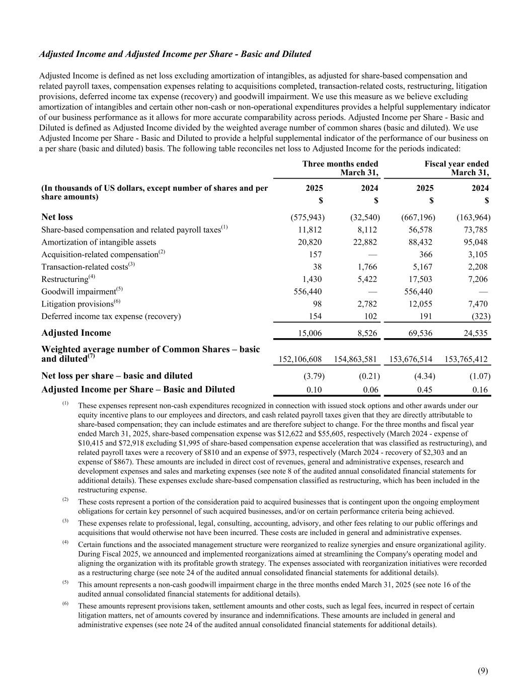 Adjusted Income and Adjusted Income per Share - Basic and Diluted Adjusted Income is defined as net loss excluding amortization of intangibles, as adjusted for share-based compensation and related payroll taxes, compensation expenses relating to acquisitions completed, transaction-related costs, restructuring, litigation provisions, deferred income tax expense (recovery) and goodwill impairment. We use this measure as we believe excluding amortization of intangibles and certain other non-cash or non-operational expenditures provides a helpful supplementary indicator of our business performance as it allows for more accurate comparability across periods. Adjusted Income per Share - Basic and Diluted is defined as Adjusted Income divided by the weighted average number of common shares (basic and diluted). We use Adjusted Income per Share - Basic and Diluted to provide a helpful supplemental indicator of the performance of our business on a per share (basic and diluted) basis. The following table reconciles net loss to Adjusted Income for the periods indicated: Three months ended March 31, Fiscal year ended March 31, (In thousands of US dollars, except number of shares and per share amounts) 2025 2024 2025 2024 $ $ $ $ Net loss (575,943) (32,540) (667,196) (163,964) Share-based compensation and related payroll taxes(1) 11,812 8,112 56,578 73,785 Amortization of intangible assets 20,820 22,882 88,432 95,048 Acquisition-related compensation(2) 157 — 366 3,105 Transaction-related costs(3) 38 1,766 5,167 2,208 Restructuring(4) 1,430 5,422 17,503 7,206 Goodwill impairment(5) 556,440 — 556,440 — Litigation provisions(6) 98 2,782 12,055 7,470 Deferred income tax expense (recovery) 154 102 191 (323) Adjusted Income 15,006 8,526 69,536 24,535 Weighted average number of Common Shares – basic and diluted(7) 152,106,608 154,863,581 153,676,514 153,765,412 Net loss per share – basic and diluted (3.79) (0.21) (4.34) (1.07) Adjusted Income per Share – Basic and Diluted 0.10 0.06 0.45 0.16 (1) These expenses represent non-cash expenditures recognized in connection with issued stock options and other awards under our equity incentive plans to our employees and directors, and cash related payroll taxes given that they are directly attributable to share-based compensation; they can include estimates and are therefore subject to change. For the three months and fiscal year ended March 31, 2025, share-based compensation expense was $12,622 and $55,605, respectively (March 2024 - expense of $10,415 and $72,918 excluding $1,995 of share-based compensation expense acceleration that was classified as restructuring), and related payroll taxes were a recovery of $810 and an expense of $973, respectively (March 2024 - recovery of $2,303 and an expense of $867). These amounts are included in direct cost of revenues, general and administrative expenses, research and development expenses and sales and marketing expenses (see note 8 of the audited annual consolidated financial statements for additional details). These expenses exclude share-based compensation classified as restructuring, which has been included in the restructuring expense. (2) These costs represent a portion of the consideration paid to acquired businesses that is contingent upon the ongoing employment obligations for certain key personnel of such acquired businesses, and/or on certain performance criteria being achieved. (3) These expenses relate to professional, legal, consulting, accounting, advisory, and other fees relating to our public offerings and acquisitions that would otherwise not have been incurred. These costs are included in general and administrative expenses. (4) Certain functions and the associated management structure were reorganized to realize synergies and ensure organizational agility. During Fiscal 2025, we announced and implemented reorganizations aimed at streamlining the Company's operating model and aligning the organization with its profitable growth strategy. The expenses associated with reorganization initiatives were recorded as a restructuring charge (see note 24 of the audited annual consolidated financial statements for additional details). (5) This amount represents a non-cash goodwill impairment charge in the three months ended March 31, 2025 (see note 16 of the audited annual consolidated financial statements for additional details). (6) These amounts represent provisions taken, settlement amounts and other costs, such as legal fees, incurred in respect of certain litigation matters, net of amounts covered by insurance and indemnifications. These amounts are included in general and administrative expenses (see note 24 of the audited annual consolidated financial statements for additional details). (9)