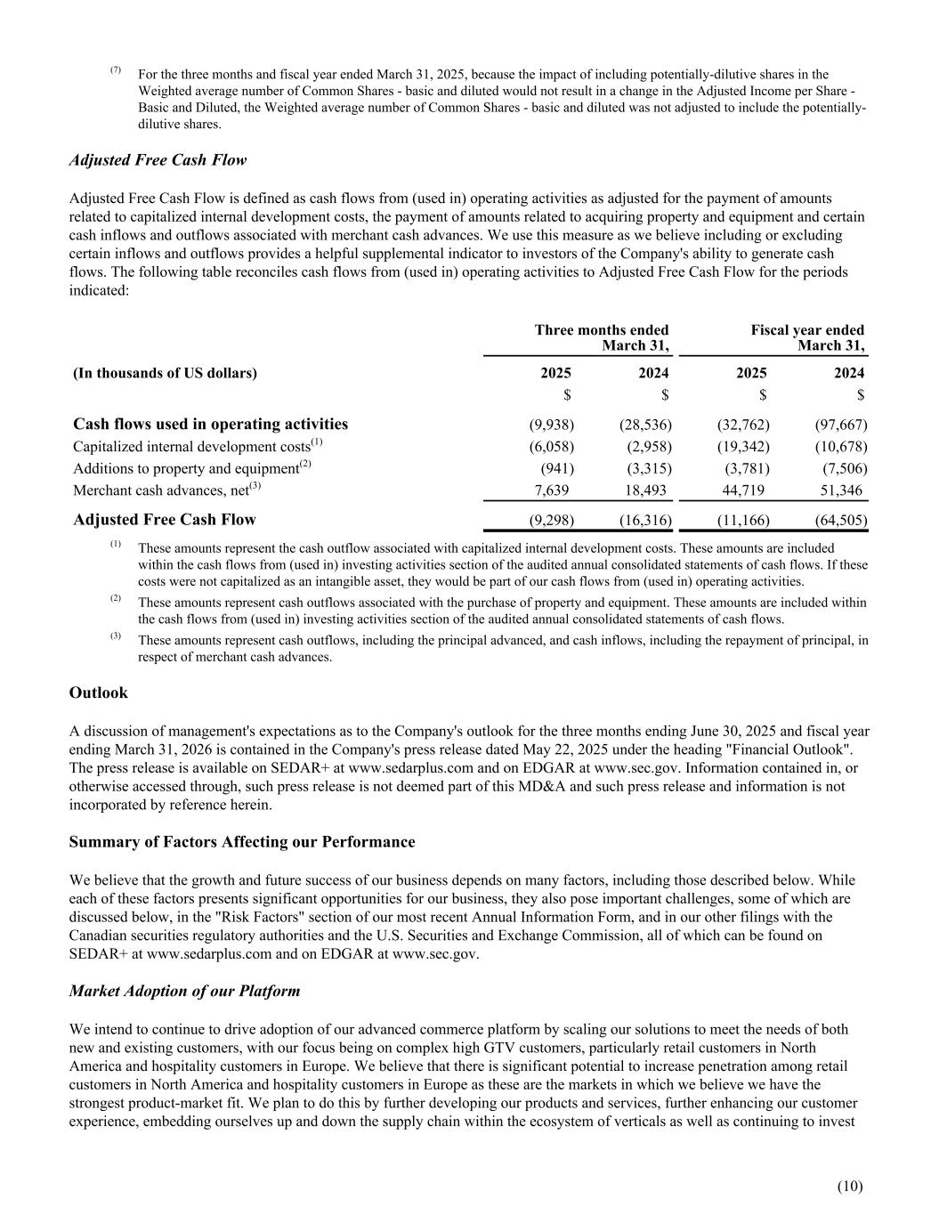 (7) For the three months and fiscal year ended March 31, 2025, because the impact of including potentially-dilutive shares in the Weighted average number of Common Shares - basic and diluted would not result in a change in the Adjusted Income per Share - Basic and Diluted, the Weighted average number of Common Shares - basic and diluted was not adjusted to include the potentially- dilutive shares. Adjusted Free Cash Flow Adjusted Free Cash Flow is defined as cash flows from (used in) operating activities as adjusted for the payment of amounts related to capitalized internal development costs, the payment of amounts related to acquiring property and equipment and certain cash inflows and outflows associated with merchant cash advances. We use this measure as we believe including or excluding certain inflows and outflows provides a helpful supplemental indicator to investors of the Company's ability to generate cash flows. The following table reconciles cash flows from (used in) operating activities to Adjusted Free Cash Flow for the periods indicated: Three months ended March 31, Fiscal year ended March 31, (In thousands of US dollars) 2025 2024 2025 2024 $ $ $ $ Cash flows used in operating activities (9,938) (28,536) (32,762) (97,667) Capitalized internal development costs(1) (6,058) (2,958) (19,342) (10,678) Additions to property and equipment(2) (941) (3,315) (3,781) (7,506) Merchant cash advances, net(3) 7,639 18,493 44,719 51,346 Adjusted Free Cash Flow (9,298) (16,316) (11,166) (64,505) (1) These amounts represent the cash outflow associated with capitalized internal development costs. These amounts are included within the cash flows from (used in) investing activities section of the audited annual consolidated statements of cash flows. If these costs were not capitalized as an intangible asset, they would be part of our cash flows from (used in) operating activities. (2) These amounts represent cash outflows associated with the purchase of property and equipment. These amounts are included within the cash flows from (used in) investing activities section of the audited annual consolidated statements of cash flows. (3) These amounts represent cash outflows, including the principal advanced, and cash inflows, including the repayment of principal, in respect of merchant cash advances. Outlook A discussion of management's expectations as to the Company's outlook for the three months ending June 30, 2025 and fiscal year ending March 31, 2026 is contained in the Company's press release dated May 22, 2025 under the heading "Financial Outlook". The press release is available on SEDAR+ at www.sedarplus.com and on EDGAR at www.sec.gov. Information contained in, or otherwise accessed through, such press release is not deemed part of this MD&A and such press release and information is not incorporated by reference herein. Summary of Factors Affecting our Performance We believe that the growth and future success of our business depends on many factors, including those described below. While each of these factors presents significant opportunities for our business, they also pose important challenges, some of which are discussed below, in the "Risk Factors" section of our most recent Annual Information Form, and in our other filings with the Canadian securities regulatory authorities and the U.S. Securities and Exchange Commission, all of which can be found on SEDAR+ at www.sedarplus.com and on EDGAR at www.sec.gov. Market Adoption of our Platform We intend to continue to drive adoption of our advanced commerce platform by scaling our solutions to meet the needs of both new and existing customers, with our focus being on complex high GTV customers, particularly retail customers in North America and hospitality customers in Europe. We believe that there is significant potential to increase penetration among retail customers in North America and hospitality customers in Europe as these are the markets in which we believe we have the strongest product-market fit. We plan to do this by further developing our products and services, further enhancing our customer experience, embedding ourselves up and down the supply chain within the ecosystem of verticals as well as continuing to invest (10)