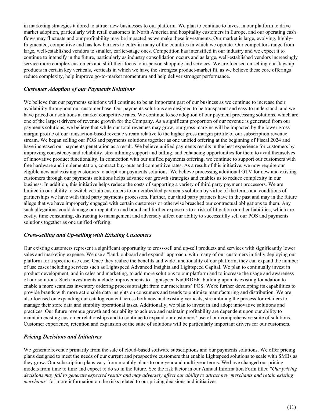in marketing strategies tailored to attract new businesses to our platform. We plan to continue to invest in our platform to drive market adoption, particularly with retail customers in North America and hospitality customers in Europe, and our operating cash flows may fluctuate and our profitability may be impacted as we make these investments. Our market is large, evolving, highly- fragmented, competitive and has low barriers to entry in many of the countries in which we operate. Our competitors range from large, well-established vendors to smaller, earlier-stage ones. Competition has intensified in our industry and we expect it to continue to intensify in the future, particularly as industry consolidation occurs and as large, well-established vendors increasingly service more complex customers and shift their focus to in-person shopping and services. We are focused on selling our flagship products in certain key verticals, verticals in which we have the strongest product-market fit, as we believe these core offerings reduce complexity, help improve go-to-market momentum and help deliver stronger performance. Customer Adoption of our Payments Solutions We believe that our payments solutions will continue to be an important part of our business as we continue to increase their availability throughout our customer base. Our payments solutions are designed to be transparent and easy to understand, and we have priced our solutions at market competitive rates. We continue to see adoption of our payment processing solutions, which are one of the largest drivers of revenue growth for the Company. As a significant proportion of our revenue is generated from our payments solutions, we believe that while our total revenues may grow, our gross margins will be impacted by the lower gross margin profile of our transaction-based revenue stream relative to the higher gross margin profile of our subscription revenue stream. We began selling our POS and payments solutions together as one unified offering at the beginning of Fiscal 2024 and have increased our payments penetration as a result. We believe unified payments results in the best experience for customers by improving consistency and reliability, streamlining support and billing, and enhancing opportunities for them to avail themselves of innovative product functionality. In connection with our unified payments offering, we continue to support our customers with free hardware and implementation, contract buy-outs and competitive rates. As a result of this initiative, we now require our eligible new and existing customers to adopt our payments solutions. We believe processing additional GTV for new and existing customers through our payments solutions helps advance our growth strategies and enables us to reduce complexity in our business. In addition, this initiative helps reduce the costs of supporting a variety of third party payment processors. We are limited in our ability to switch certain customers to our embedded payments solution by virtue of the terms and conditions of partnerships we have with third party payments processors. Further, our third party partners have in the past and may in the future allege that we have improperly engaged with certain customers or otherwise breached our contractual obligations to them. Any such allegations could damage our reputation and brand and further expose us to a risk of litigation or other liabilities, which are costly, time consuming, distracting to management and adversely affect our ability to successfully sell our POS and payments solutions together as one unified offering. Cross-selling and Up-selling with Existing Customers Our existing customers represent a significant opportunity to cross-sell and up-sell products and services with significantly lower sales and marketing expense. We use a "land, onboard and expand" approach, with many of our customers initially deploying our platform for a specific use case. Once they realize the benefits and wide functionality of our platform, they can expand the number of use cases including services such as Lightspeed Advanced Insights and Lightspeed Capital. We plan to continually invest in product development, and in sales and marketing, to add more solutions to our platform and to increase the usage and awareness of our solutions. Such investments include improvements to Lightspeed NuORDER, building upon its existing foundation to enable a more seamless inventory ordering process straight from our merchants’ POS. We're further developing its capabilities to provide brands with more actionable data insights on consumers and trends to optimize manufacturing and distribution. We are also focused on expanding our catalog content across both new and existing verticals, streamlining the process for retailers to manage their store data and simplify operational tasks. Additionally, we plan to invest in and adopt innovative solutions and practices. Our future revenue growth and our ability to achieve and maintain profitability are dependent upon our ability to maintain existing customer relationships and to continue to expand our customers’ use of our comprehensive suite of solutions. Customer experience, retention and expansion of the suite of solutions will be particularly important drivers for our customers. Pricing Decisions and Initiatives We generate revenue primarily from the sale of cloud-based software subscriptions and our payments solutions. We offer pricing plans designed to meet the needs of our current and prospective customers that enable Lightspeed solutions to scale with SMBs as they grow. Our subscription plans vary from monthly plans to one-year and multi-year terms. We have changed our pricing models from time to time and expect to do so in the future. See the risk factor in our Annual Information Form titled "Our pricing decisions may fail to generate expected results and may adversely affect our ability to attract new merchants and r