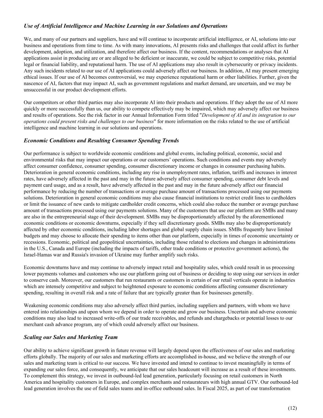 Use of Artificial Intelligence and Machine Learning in our Solutions and Operations We, and many of our partners and suppliers, have and will continue to incorporate artificial intelligence, or AI, solutions into our business and operations from time to time. As with many innovations, AI presents risks and challenges that could affect its further development, adoption, and utilization, and therefore affect our business. If the content, recommendations or analyses that AI applications assist in producing are or are alleged to be deficient or inaccurate, we could be subject to competitive risks, potential legal or financial liability, and reputational harm. The use of AI applications may also result in cybersecurity or privacy incidents. Any such incidents related to our use of AI applications could adversely affect our business. In addition, AI may present emerging ethical issues. If our use of AI becomes controversial, we may experience reputational harm or other liabilities. Further, given the nascence of AI, factors that may impact AI, such as government regulations and market demand, are uncertain, and we may be unsuccessful in our product development efforts. Our competitors or other third parties may also incorporate AI into their products and operations. If they adopt the use of AI more quickly or more successfully than us, our ability to compete effectively may be impaired, which may adversely affect our business and results of operations. See the risk factor in our Annual Information Form titled "Development of AI and its integration to our operations could present risks and challenges to our business" for more information on the risks related to the use of artificial intelligence and machine learning in our solutions and operations. Economic Conditions and Resulting Consumer Spending Trends Our performance is subject to worldwide economic conditions and global events, including political, economic, social and environmental risks that may impact our operations or our customers’ operations. Such conditions and events may adversely affect consumer confidence, consumer spending, consumer discretionary income or changes in consumer purchasing habits. Deterioration in general economic conditions, including any rise in unemployment rates, inflation, tariffs and increases in interest rates, have adversely affected in the past and may in the future adversely affect consumer spending, consumer debt levels and payment card usage, and as a result, have adversely affected in the past and may in the future adversely affect our financial performance by reducing the number of transactions or average purchase amount of transactions processed using our payments solutions. Deterioration in general economic conditions may also cause financial institutions to restrict credit lines to cardholders or limit the issuance of new cards to mitigate cardholder credit concerns, which could also reduce the number or average purchase amount of transactions processed using our payments solutions. Many of the customers that use our platform are SMBs and many are also in the entrepreneurial stage of their development. SMBs may be disproportionately affected by the aforementioned economic conditions or economic downturns, especially if they sell discretionary goods. SMBs may also be disproportionately affected by other economic conditions, including labor shortages and global supply chain issues. SMBs frequently have limited budgets and may choose to allocate their spending to items other than our platform, especially in times of economic uncertainty or recessions. Economic, political and geopolitical uncertainties, including those related to elections and changes in administrations in the U.S., Canada and Europe (including the impacts of tariffs, other trade conditions or protective government actions), the Israel-Hamas war and Russia's invasion of Ukraine may further amplify such risks. Economic downturns have and may continue to adversely impact retail and hospitality sales, which could result in us processing lower payments volumes and customers who use our platform going out of business or deciding to stop using our services in order to conserve cash. Moreover, our customers that run restaurants or customers in certain of our retail verticals operate in industries which are intensely competitive and subject to heightened exposure to economic conditions affecting consumer discretionary spending, resulting in overall risk and a rate of failure that are typically greater than for businesses generally. Weakening economic conditions may also adversely affect third parties, including suppliers and partners, with whom we have entered into relationships and upon whom we depend in order to operate and grow our business. Uncertain and adverse economic conditions may also lead to increased write-offs of our trade receivables, and refunds and chargebacks or potential losses to our merchant cash advance program, any of which could adversely affect our business. Scaling our Sales and Marketing Team Our ability to achieve significant growth in future revenue will largely depend upon the effectiveness of our sales and marketing efforts globally. The majority of our sales and marketing efforts are accomplished in-house, and we believe the strength of our sales and marketing team is critical to our success. We have invested and intend to continue to invest meaningfully in terms of expanding our sales force, and consequently, we anticipate that our sales headcount will increase as a result of these investments. To complement this strategy, we invest in outbound-led lead generation, particularly focusing on retail customers in North America and hospitality customers in Europe, and complex merchants and restaurateurs with high annual GTV. Our outbound-led lead generation involves the use of field sales teams and in-office outbound sales. In Fiscal 2025, as part of our transformation (12)