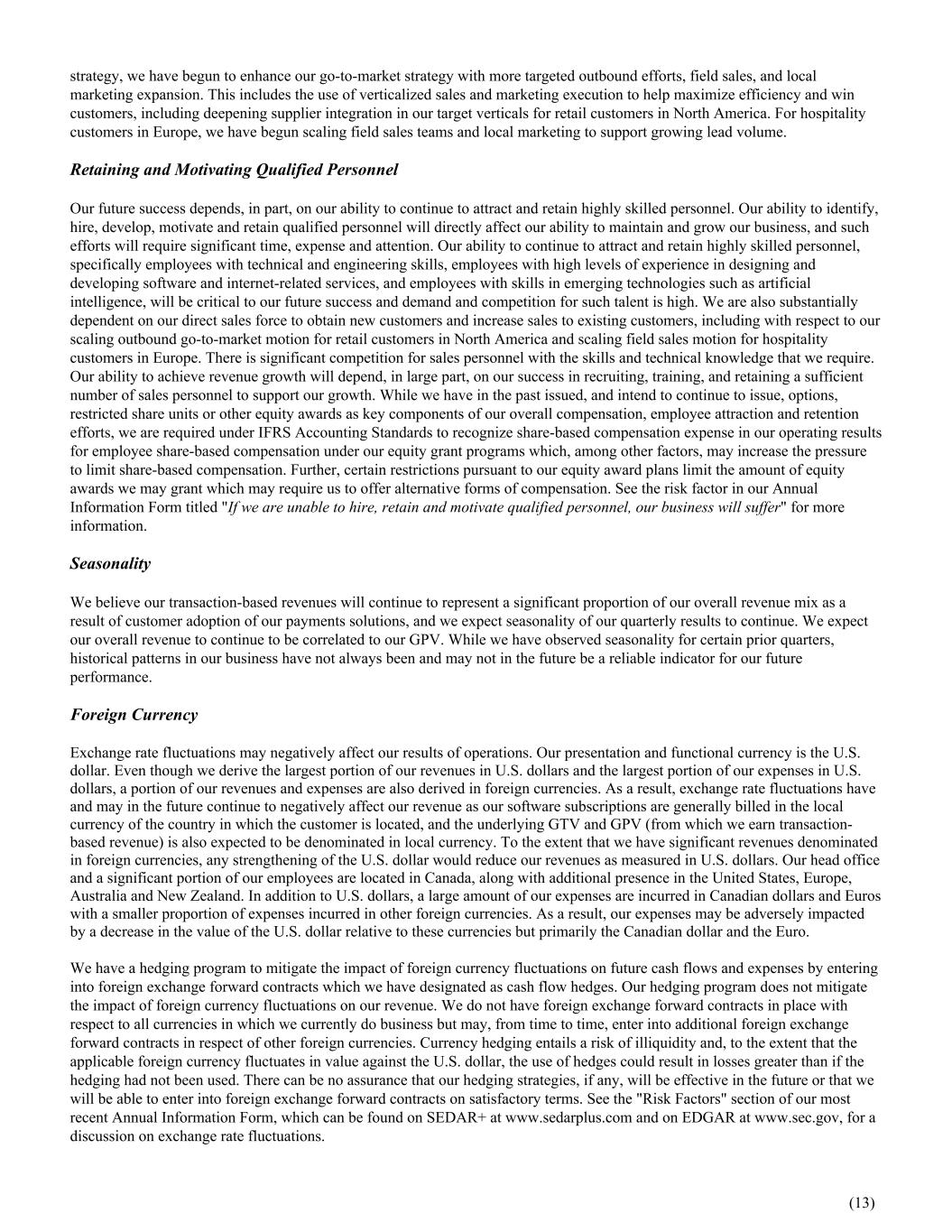 strategy, we have begun to enhance our go-to-market strategy with more targeted outbound efforts, field sales, and local marketing expansion. This includes the use of verticalized sales and marketing execution to help maximize efficiency and win customers, including deepening supplier integration in our target verticals for retail customers in North America. For hospitality customers in Europe, we have begun scaling field sales teams and local marketing to support growing lead volume. Retaining and Motivating Qualified Personnel Our future success depends, in part, on our ability to continue to attract and retain highly skilled personnel. Our ability to identify, hire, develop, motivate and retain qualified personnel will directly affect our ability to maintain and grow our business, and such efforts will require significant time, expense and attention. Our ability to continue to attract and retain highly skilled personnel, specifically employees with technical and engineering skills, employees with high levels of experience in designing and developing software and internet-related services, and employees with skills in emerging technologies such as artificial intelligence, will be critical to our future success and demand and competition for such talent is high. We are also substantially dependent on our direct sales force to obtain new customers and increase sales to existing customers, including with respect to our scaling outbound go-to-market motion for retail customers in North America and scaling field sales motion for hospitality customers in Europe. There is significant competition for sales personnel with the skills and technical knowledge that we require. Our ability to achieve revenue growth will depend, in large part, on our success in recruiting, training, and retaining a sufficient number of sales personnel to support our growth. While we have in the past issued, and intend to continue to issue, options, restricted share units or other equity awards as key components of our overall compensation, employee attraction and retention efforts, we are required under IFRS Accounting Standards to recognize share-based compensation expense in our operating results for employee share-based compensation under our equity grant programs which, among other factors, may increase the pressure to limit share-based compensation. Further, certain restrictions pursuant to our equity award plans limit the amount of equity awards we may grant which may require us to offer alternative forms of compensation. See the risk factor in our Annual Information Form titled "If we are unable to hire, retain and motivate qualified personnel, our business will suffer" for more information. Seasonality We believe our transaction-based revenues will continue to represent a significant proportion of our overall revenue mix as a result of customer adoption of our payments solutions, and we expect seasonality of our quarterly results to continue. We expect our overall revenue to continue to be correlated to our GPV. While we have observed seasonality for certain prior quarters, historical patterns in our business have not always been and may not in the future be a reliable indicator for our future performance. Foreign Currency Exchange rate fluctuations may negatively affect our results of operations. Our presentation and functional currency is the U.S. dollar. Even though we derive the largest portion of our revenues in U.S. dollars and the largest portion of our expenses in U.S. dollars, a portion of our revenues and expenses are also derived in foreign currencies. As a result, exchange rate fluctuations have and may in the future continue to negatively affect our revenue as our software subscriptions are generally billed in the local currency of the country in which the customer is located, and the underlying GTV and GPV (from which we earn transaction- based revenue) is also expected to be denominated in local currency. To the extent that we have significant revenues denominated in foreign currencies, any strengthening of the U.S. dollar would reduce our revenues as measured in U.S. dollars. Our head office and a significant portion of our employees are located in Canada, along with additional presence in the United States, Europe, Australia and New Zealand. In addition to U.S. dollars, a large amount of our expenses are incurred in Canadian dollars and Euros with a smaller proportion of expenses incurred in other foreign currencies. As a result, our expenses may be adversely impacted by a decrease in the value of the U.S. dollar relative to these currencies but primarily the Canadian dollar and the Euro. We have a hedging program to mitigate the impact of foreign currency fluctuations on future cash flows and expenses by entering into foreign exchange forward contracts which we have designated as cash flow hedges. Our hedging program does not mitigate the impact of foreign currency fluctuations on our revenue. We do not have foreign exchange forward contracts in place with respect to all currencies in which we currently do business but may, from time to time, enter into additional foreign exchange forward contracts in respect of other foreign currencies. Currency hedging entails a risk of illiquidity and, to the extent that the applicable foreign currency fluctuates in value against the U.S. dollar, the use of hedges could result in losses greater than if the hedging had not been used. There can be no assurance that our hedging strategies, if any, will be effective in the future or that we will be able to enter into foreign exchange forward contracts on satisfactory terms. See the "Risk Factors" section of our most recent Annual Information Form, which can be found on SEDAR+ at www.sedarplus.com and on EDGAR at www.sec.gov, for a discussion on exchange rate fluctuations. (13)
