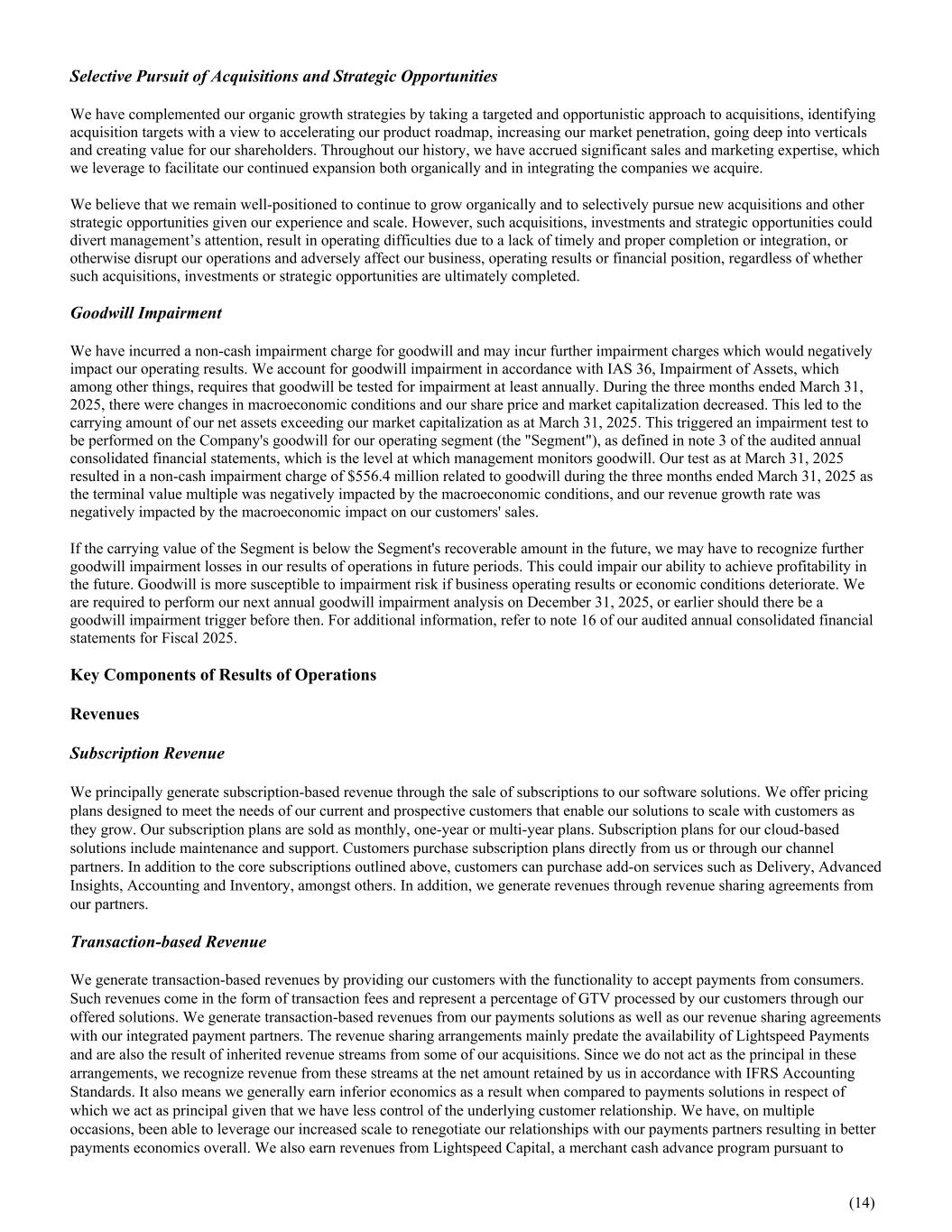 Selective Pursuit of Acquisitions and Strategic Opportunities We have complemented our organic growth strategies by taking a targeted and opportunistic approach to acquisitions, identifying acquisition targets with a view to accelerating our product roadmap, increasing our market penetration, going deep into verticals and creating value for our shareholders. Throughout our history, we have accrued significant sales and marketing expertise, which we leverage to facilitate our continued expansion both organically and in integrating the companies we acquire. We believe that we remain well-positioned to continue to grow organically and to selectively pursue new acquisitions and other strategic opportunities given our experience and scale. However, such acquisitions, investments and strategic opportunities could divert management’s attention, result in operating difficulties due to a lack of timely and proper completion or integration, or otherwise disrupt our operations and adversely affect our business, operating results or financial position, regardless of whether such acquisitions, investments or strategic opportunities are ultimately completed. Goodwill Impairment We have incurred a non-cash impairment charge for goodwill and may incur further impairment charges which would negatively impact our operating results. We account for goodwill impairment in accordance with IAS 36, Impairment of Assets, which among other things, requires that goodwill be tested for impairment at least annually. During the three months ended March 31, 2025, there were changes in macroeconomic conditions and our share price and market capitalization decreased. This led to the carrying amount of our net assets exceeding our market capitalization as at March 31, 2025. This triggered an impairment test to be performed on the Company's goodwill for our operating segment (the "Segment"), as defined in note 3 of the audited annual consolidated financial statements, which is the level at which management monitors goodwill. Our test as at March 31, 2025 resulted in a non-cash impairment charge of $556.4 million related to goodwill during the three months ended March 31, 2025 as the terminal value multiple was negatively impacted by the macroeconomic conditions, and our revenue growth rate was negatively impacted by the macroeconomic impact on our customers' sales. If the carrying value of the Segment is below the Segment's recoverable amount in the future, we may have to recognize further goodwill impairment losses in our results of operations in future periods. This could impair our ability to achieve profitability in the future. Goodwill is more susceptible to impairment risk if business operating results or economic conditions deteriorate. We are required to perform our next annual goodwill impairment analysis on December 31, 2025, or earlier should there be a goodwill impairment trigger before then. For additional information, refer to note 16 of our audited annual consolidated financial statements for Fiscal 2025. Key Components of Results of Operations Revenues Subscription Revenue We principally generate subscription-based revenue through the sale of subscriptions to our software solutions. We offer pricing plans designed to meet the needs of our current and prospective customers that enable our solutions to scale with customers as they grow. Our subscription plans are sold as monthly, one-year or multi-year plans. Subscription plans for our cloud-based solutions include maintenance and support. Customers purchase subscription plans directly from us or through our channel partners. In addition to the core subscriptions outlined above, customers can purchase add-on services such as Delivery, Advanced Insights, Accounting and Inventory, amongst others. In addition, we generate revenues through revenue sharing agreements from our partners. Transaction-based Revenue We generate transaction-based revenues by providing our customers with the functionality to accept payments from consumers. Such revenues come in the form of transaction fees and represent a percentage of GTV processed by our customers through our offered solutions. We generate transaction-based revenues from our payments solutions as well as our revenue sharing agreements with our integrated payment partners. The revenue sharing arrangements mainly predate the availability of Lightspeed Payments and are also the result of inherited revenue streams from some of our acquisitions. Since we do not act as the principal in these arrangements, we recognize revenue from these streams at the net amount retained by us in accordance with IFRS Accounting Standards. It also means we generally earn inferior economics as a result when compared to payments solutions in respect of which we act as principal given that we have less control of the underlying customer relationship. We have, on multiple occasions, been able to leverage our increased scale to renegotiate our relationships with our payments partners resulting in better payments economics overall. We also earn revenues from Lightspeed Capital, a merchant cash advance program pursuant to (14)