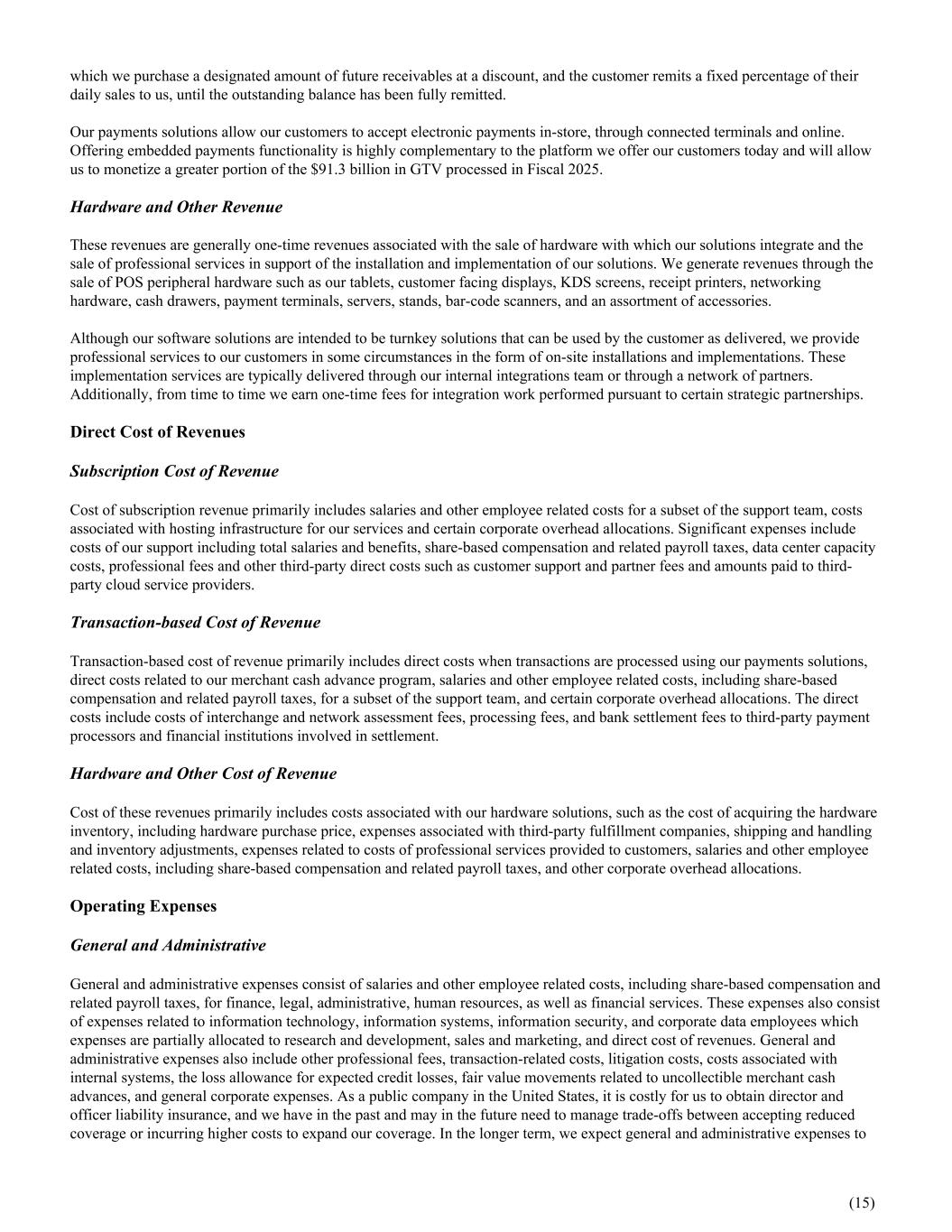 which we purchase a designated amount of future receivables at a discount, and the customer remits a fixed percentage of their daily sales to us, until the outstanding balance has been fully remitted. Our payments solutions allow our customers to accept electronic payments in-store, through connected terminals and online. Offering embedded payments functionality is highly complementary to the platform we offer our customers today and will allow us to monetize a greater portion of the $91.3 billion in GTV processed in Fiscal 2025. Hardware and Other Revenue These revenues are generally one-time revenues associated with the sale of hardware with which our solutions integrate and the sale of professional services in support of the installation and implementation of our solutions. We generate revenues through the sale of POS peripheral hardware such as our tablets, customer facing displays, KDS screens, receipt printers, networking hardware, cash drawers, payment terminals, servers, stands, bar-code scanners, and an assortment of accessories. Although our software solutions are intended to be turnkey solutions that can be used by the customer as delivered, we provide professional services to our customers in some circumstances in the form of on-site installations and implementations. These implementation services are typically delivered through our internal integrations team or through a network of partners. Additionally, from time to time we earn one-time fees for integration work performed pursuant to certain strategic partnerships. Direct Cost of Revenues Subscription Cost of Revenue Cost of subscription revenue primarily includes salaries and other employee related costs for a subset of the support team, costs associated with hosting infrastructure for our services and certain corporate overhead allocations. Significant expenses include costs of our support including total salaries and benefits, share-based compensation and related payroll taxes, data center capacity costs, professional fees and other third-party direct costs such as customer support and partner fees and amounts paid to third- party cloud service providers. Transaction-based Cost of Revenue Transaction-based cost of revenue primarily includes direct costs when transactions are processed using our payments solutions, direct costs related to our merchant cash advance program, salaries and other employee related costs, including share-based compensation and related payroll taxes, for a subset of the support team, and certain corporate overhead allocations. The direct costs include costs of interchange and network assessment fees, processing fees, and bank settlement fees to third-party payment processors and financial institutions involved in settlement. Hardware and Other Cost of Revenue Cost of these revenues primarily includes costs associated with our hardware solutions, such as the cost of acquiring the hardware inventory, including hardware purchase price, expenses associated with third-party fulfillment companies, shipping and handling and inventory adjustments, expenses related to costs of professional services provided to customers, salaries and other employee related costs, including share-based compensation and related payroll taxes, and other corporate overhead allocations. Operating Expenses General and Administrative General and administrative expenses consist of salaries and other employee related costs, including share-based compensation and related payroll taxes, for finance, legal, administrative, human resources, as well as financial services. These expenses also consist of expenses related to information technology, information systems, information security, and corporate data employees which expenses are partially allocated to research and development, sales and marketing, and direct cost of revenues. General and administrative expenses also include other professional fees, transaction-related costs, litigation costs, costs associated with internal systems, the loss allowance for expected credit losses, fair value movements related to uncollectible merchant cash advances, and general corporate expenses. As a public company in the United States, it is costly for us to obtain director and officer liability insurance, and we have in the past and may in the future need to manage trade-offs between accepting reduced coverage or incurring higher costs to expand our coverage. In the longer term, we expect general and administrative expenses to (15)