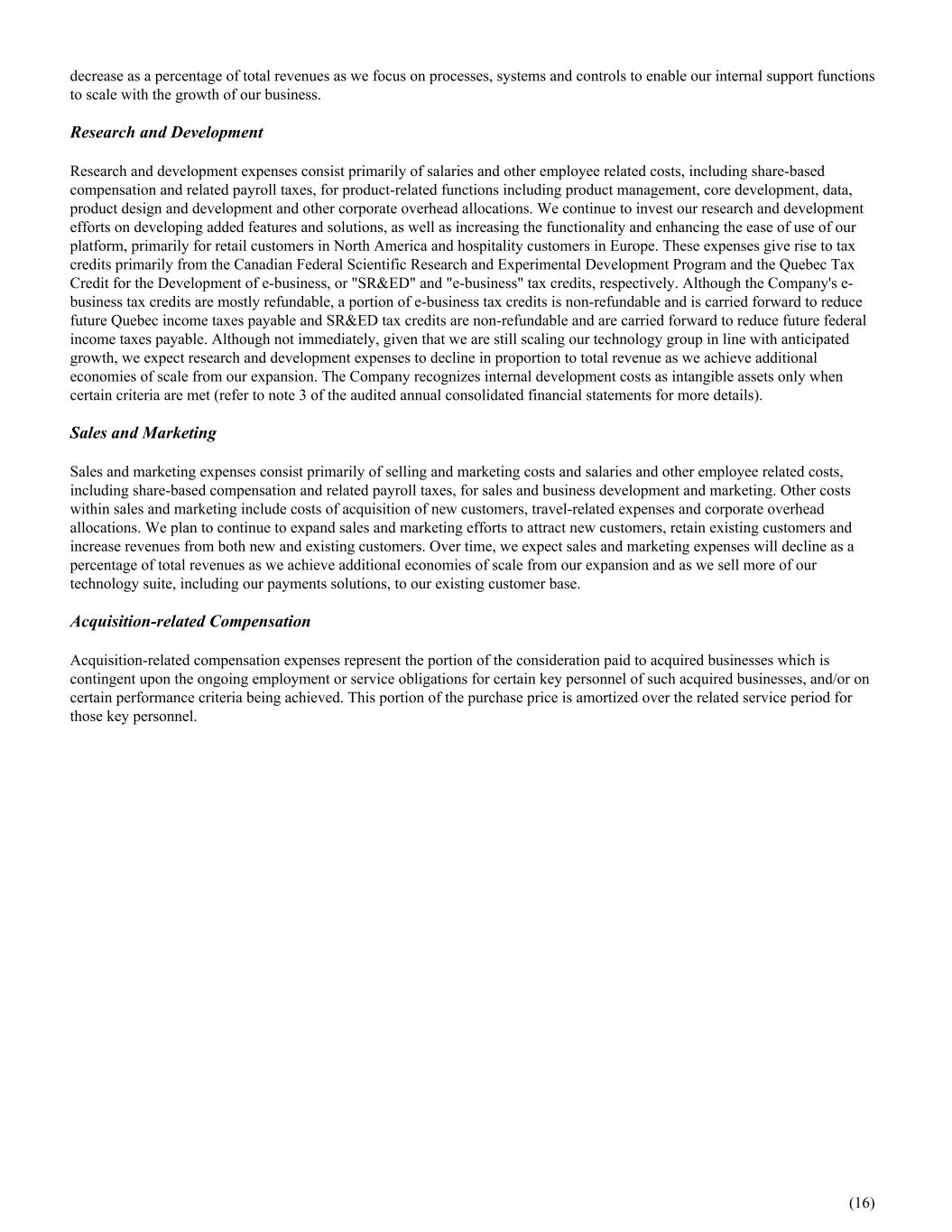 decrease as a percentage of total revenues as we focus on processes, systems and controls to enable our internal support functions to scale with the growth of our business. Research and Development Research and development expenses consist primarily of salaries and other employee related costs, including share-based compensation and related payroll taxes, for product-related functions including product management, core development, data, product design and development and other corporate overhead allocations. We continue to invest our research and development efforts on developing added features and solutions, as well as increasing the functionality and enhancing the ease of use of our platform, primarily for retail customers in North America and hospitality customers in Europe. These expenses give rise to tax credits primarily from the Canadian Federal Scientific Research and Experimental Development Program and the Quebec Tax Credit for the Development of e-business, or "SR&ED" and "e-business" tax credits, respectively. Although the Company's e- business tax credits are mostly refundable, a portion of e-business tax credits is non-refundable and is carried forward to reduce future Quebec income taxes payable and SR&ED tax credits are non-refundable and are carried forward to reduce future federal income taxes payable. Although not immediately, given that we are still scaling our technology group in line with anticipated growth, we expect research and development expenses to decline in proportion to total revenue as we achieve additional economies of scale from our expansion. The Company recognizes internal development costs as intangible assets only when certain criteria are met (refer to note 3 of the audited annual consolidated financial statements for more details). Sales and Marketing Sales and marketing expenses consist primarily of selling and marketing costs and salaries and other employee related costs, including share-based compensation and related payroll taxes, for sales and business development and marketing. Other costs within sales and marketing include costs of acquisition of new customers, travel-related expenses and corporate overhead allocations. We plan to continue to expand sales and marketing efforts to attract new customers, retain existing customers and increase revenues from both new and existing customers. Over time, we expect sales and marketing expenses will decline as a percentage of total revenues as we achieve additional economies of scale from our expansion and as we sell more of our technology suite, including our payments solutions, to our existing customer base. Acquisition-related Compensation Acquisition-related compensation expenses represent the portion of the consideration paid to acquired businesses which is contingent upon the ongoing employment or service obligations for certain key personnel of such acquired businesses, and/or on certain performance criteria being achieved. This portion of the purchase price is amortized over the related service period for those key personnel. (16)