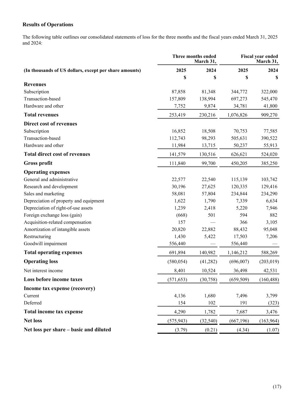 Results of Operations The following table outlines our consolidated statements of loss for the three months and the fiscal years ended March 31, 2025 and 2024: Three months ended March 31, Fiscal year ended March 31, (In thousands of US dollars, except per share amounts) 2025 2024 2025 2024 $ $ $ $ Revenues Subscription 87,858 81,348 344,772 322,000 Transaction-based 157,809 138,994 697,273 545,470 Hardware and other 7,752 9,874 34,781 41,800 Total revenues 253,419 230,216 1,076,826 909,270 Direct cost of revenues Subscription 16,852 18,508 70,753 77,585 Transaction-based 112,743 98,293 505,631 390,522 Hardware and other 11,984 13,715 50,237 55,913 Total direct cost of revenues 141,579 130,516 626,621 524,020 Gross profit 111,840 99,700 450,205 385,250 Operating expenses General and administrative 22,577 22,540 115,139 103,742 Research and development 30,196 27,625 120,335 129,416 Sales and marketing 58,081 57,804 234,844 234,290 Depreciation of property and equipment 1,622 1,790 7,339 6,634 Depreciation of right-of-use assets 1,239 2,418 5,220 7,946 Foreign exchange loss (gain) (668) 501 594 882 Acquisition-related compensation 157 — 366 3,105 Amortization of intangible assets 20,820 22,882 88,432 95,048 Restructuring 1,430 5,422 17,503 7,206 Goodwill impairment 556,440 — 556,440 — Total operating expenses 691,894 140,982 1,146,212 588,269 Operating loss (580,054) (41,282) (696,007) (203,019) Net interest income 8,401 10,524 36,498 42,531 Loss before income taxes (571,653) (30,758) (659,509) (160,488) Income tax expense (recovery) Current 4,136 1,680 7,496 3,799 Deferred 154 102 191 (323) Total income tax expense 4,290 1,782 7,687 3,476 Net loss (575,943) (32,540) (667,196) (163,964) Net loss per share – basic and diluted (3.79) (0.21) (4.34) (1.07) (17)