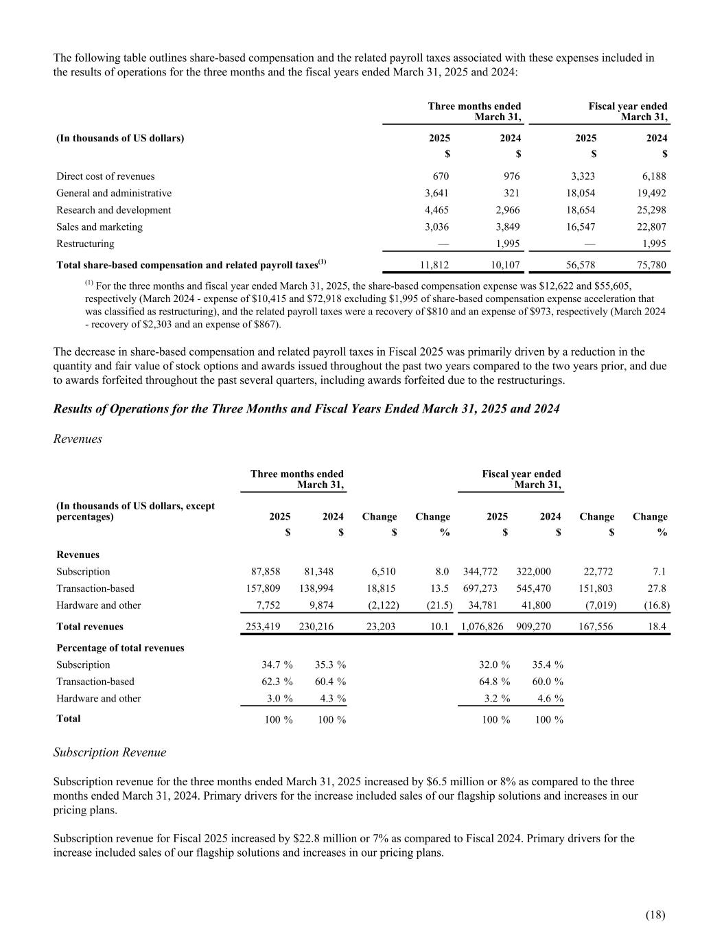 The following table outlines share-based compensation and the related payroll taxes associated with these expenses included in the results of operations for the three months and the fiscal years ended March 31, 2025 and 2024: Three months ended March 31, Fiscal year ended March 31, (In thousands of US dollars) 2025 2024 2025 2024 $ $ $ $ Direct cost of revenues 670 976 3,323 6,188 General and administrative 3,641 321 18,054 19,492 Research and development 4,465 2,966 18,654 25,298 Sales and marketing 3,036 3,849 16,547 22,807 Restructuring — 1,995 — 1,995 Total share-based compensation and related payroll taxes(1) 11,812 10,107 56,578 75,780 (1) For the three months and fiscal year ended March 31, 2025, the share-based compensation expense was $12,622 and $55,605, respectively (March 2024 - expense of $10,415 and $72,918 excluding $1,995 of share-based compensation expense acceleration that was classified as restructuring), and the related payroll taxes were a recovery of $810 and an expense of $973, respectively (March 2024 - recovery of $2,303 and an expense of $867). The decrease in share-based compensation and related payroll taxes in Fiscal 2025 was primarily driven by a reduction in the quantity and fair value of stock options and awards issued throughout the past two years compared to the two years prior, and due to awards forfeited throughout the past several quarters, including awards forfeited due to the restructurings. Results of Operations for the Three Months and Fiscal Years Ended March 31, 2025 and 2024 Revenues Three months ended March 31, Fiscal year ended March 31, (In thousands of US dollars, except percentages) 2025 2024 Change Change 2025 2024 Change Change $ $ $ % $ $ $ % Revenues Subscription 87,858 81,348 6,510 8.0 344,772 322,000 22,772 7.1 Transaction-based 157,809 138,994 18,815 13.5 697,273 545,470 151,803 27.8 Hardware and other 7,752 9,874 (2,122) (21.5) 34,781 41,800 (7,019) (16.8) Total revenues 253,419 230,216 23,203 10.1 1,076,826 909,270 167,556 18.4 Percentage of total revenues Subscription 34.7 % 35.3 % 32.0 % 35.4 % Transaction-based 62.3 % 60.4 % 64.8 % 60.0 % Hardware and other 3.0 % 4.3 % 3.2 % 4.6 % Total 100 % 100 % 100 % 100 % Subscription Revenue Subscription revenue for the three months ended March 31, 2025 increased by $6.5 million or 8% as compared to the three months ended March 31, 2024. Primary drivers for the increase included sales of our flagship solutions and increases in our pricing plans. Subscription revenue for Fiscal 2025 increased by $22.8 million or 7% as compared to Fiscal 2024. Primary drivers for the increase included sales of our flagship solutions and increases in our pricing plans. (18)