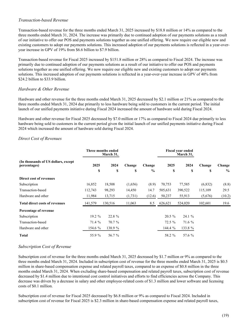 Transaction-based Revenue Transaction-based revenue for the three months ended March 31, 2025 increased by $18.8 million or 14% as compared to the three months ended March 31, 2024. The increase was primarily due to continued adoption of our payments solutions as a result of our initiative to offer our POS and payments solutions together as one unified offering. We now require our eligible new and existing customers to adopt our payments solutions. This increased adoption of our payments solutions is reflected in a year-over- year increase in GPV of 19% from $6.6 billion to $7.9 billion. Transaction-based revenue for Fiscal 2025 increased by $151.8 million or 28% as compared to Fiscal 2024. The increase was primarily due to continued adoption of our payments solutions as a result of our initiative to offer our POS and payments solutions together as one unified offering. We now require our eligible new and existing customers to adopt our payments solutions. This increased adoption of our payments solutions is reflected in a year-over-year increase in GPV of 40% from $24.2 billion to $33.9 billion. Hardware & Other Revenue Hardware and other revenue for the three months ended March 31, 2025 decreased by $2.1 million or 21% as compared to the three months ended March 31, 2024 due primarily to less hardware being sold to customers in the current period. The initial launch of our unified payments initiative during Fiscal 2024 increased the amount of hardware sold during Fiscal 2024. Hardware and other revenue for Fiscal 2025 decreased by $7.0 million or 17% as compared to Fiscal 2024 due primarily to less hardware being sold to customers in the current period given the initial launch of our unified payments initiative during Fiscal 2024 which increased the amount of hardware sold during Fiscal 2024. Direct Cost of Revenues Three months ended March 31, Fiscal year ended March 31, (In thousands of US dollars, except percentages) 2025 2024 Change Change 2025 2024 Change Change $ $ $ % $ $ $ % Direct cost of revenues Subscription 16,852 18,508 (1,656) (8.9) 70,753 77,585 (6,832) (8.8) Transaction-based 112,743 98,293 14,450 14.7 505,631 390,522 115,109 29.5 Hardware and other 11,984 13,715 (1,731) (12.6) 50,237 55,913 (5,676) (10.2) Total direct costs of revenues 141,579 130,516 11,063 8.5 626,621 524,020 102,601 19.6 Percentage of revenue Subscription 19.2 % 22.8 % 20.5 % 24.1 % Transaction-based 71.4 % 70.7 % 72.5 % 71.6 % Hardware and other 154.6 % 138.9 % 144.4 % 133.8 % Total 55.9 % 56.7 % 58.2 % 57.6 % Subscription Cost of Revenue Subscription cost of revenue for the three months ended March 31, 2025 decreased by $1.7 million or 9% as compared to the three months ended March 31, 2024. Included in subscription cost of revenue for the three months ended March 31, 2025 is $0.5 million in share-based compensation expense and related payroll taxes, compared to an expense of $0.8 million in the three months ended March 31, 2024. When excluding share-based compensation and related payroll taxes, subscription cost of revenue decreased by $1.4 million due to intentional cost control initiatives and efforts to find efficiencies across the Company. This decrease was driven by a decrease in salary and other employee-related costs of $1.3 million and lower software and licensing costs of $0.1 million. Subscription cost of revenue for Fiscal 2025 decreased by $6.8 million or 9% as compared to Fiscal 2024. Included in subscription cost of revenue for Fiscal 2025 is $2.3 million in share-based compensation expense and related payroll taxes, (19)