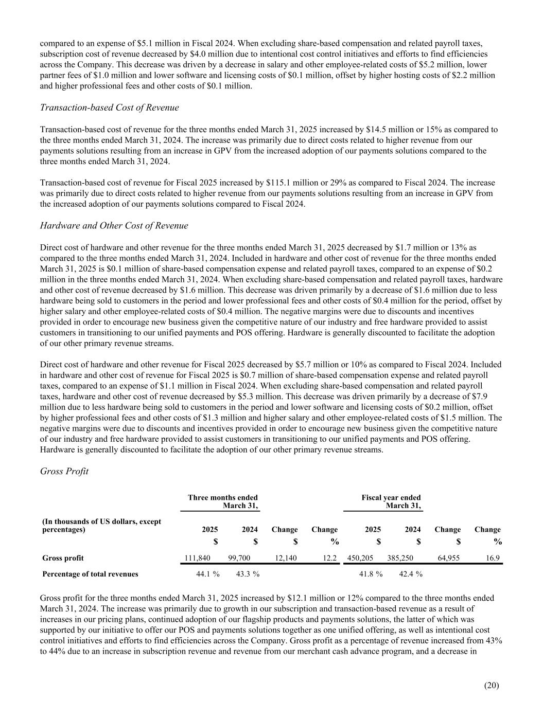 compared to an expense of $5.1 million in Fiscal 2024. When excluding share-based compensation and related payroll taxes, subscription cost of revenue decreased by $4.0 million due to intentional cost control initiatives and efforts to find efficiencies across the Company. This decrease was driven by a decrease in salary and other employee-related costs of $5.2 million, lower partner fees of $1.0 million and lower software and licensing costs of $0.1 million, offset by higher hosting costs of $2.2 million and higher professional fees and other costs of $0.1 million. Transaction-based Cost of Revenue Transaction-based cost of revenue for the three months ended March 31, 2025 increased by $14.5 million or 15% as compared to the three months ended March 31, 2024. The increase was primarily due to direct costs related to higher revenue from our payments solutions resulting from an increase in GPV from the increased adoption of our payments solutions compared to the three months ended March 31, 2024. Transaction-based cost of revenue for Fiscal 2025 increased by $115.1 million or 29% as compared to Fiscal 2024. The increase was primarily due to direct costs related to higher revenue from our payments solutions resulting from an increase in GPV from the increased adoption of our payments solutions compared to Fiscal 2024. Hardware and Other Cost of Revenue Direct cost of hardware and other revenue for the three months ended March 31, 2025 decreased by $1.7 million or 13% as compared to the three months ended March 31, 2024. Included in hardware and other cost of revenue for the three months ended March 31, 2025 is $0.1 million of share-based compensation expense and related payroll taxes, compared to an expense of $0.2 million in the three months ended March 31, 2024. When excluding share-based compensation and related payroll taxes, hardware and other cost of revenue decreased by $1.6 million. This decrease was driven primarily by a decrease of $1.6 million due to less hardware being sold to customers in the period and lower professional fees and other costs of $0.4 million for the period, offset by higher salary and other employee-related costs of $0.4 million. The negative margins were due to discounts and incentives provided in order to encourage new business given the competitive nature of our industry and free hardware provided to assist customers in transitioning to our unified payments and POS offering. Hardware is generally discounted to facilitate the adoption of our other primary revenue streams. Direct cost of hardware and other revenue for Fiscal 2025 decreased by $5.7 million or 10% as compared to Fiscal 2024. Included in hardware and other cost of revenue for Fiscal 2025 is $0.7 million of share-based compensation expense and related payroll taxes, compared to an expense of $1.1 million in Fiscal 2024. When excluding share-based compensation and related payroll taxes, hardware and other cost of revenue decreased by $5.3 million. This decrease was driven primarily by a decrease of $7.9 million due to less hardware being sold to customers in the period and lower software and licensing costs of $0.2 million, offset by higher professional fees and other costs of $1.3 million and higher salary and other employee-related costs of $1.5 million. The negative margins were due to discounts and incentives provided in order to encourage new business given the competitive nature of our industry and free hardware provided to assist customers in transitioning to our unified payments and POS offering. Hardware is generally discounted to facilitate the adoption of our other primary revenue streams. Gross Profit Three months ended March 31, Fiscal year ended March 31, (In thousands of US dollars, except percentages) 2025 2024 Change Change 2025 2024 Change Change $ $ $ % $ $ $ % Gross profit 111,840 99,700 12,140 12.2 450,205 385,250 64,955 16.9 Percentage of total revenues 44.1 % 43.3 % 41.8 % 42.4 % Gross profit for the three months ended March 31, 2025 increased by $12.1 million or 12% compared to the three months ended March 31, 2024. The increase was primarily due to growth in our subscription and transaction-based revenue as a result of increases in our pricing plans, continued adoption of our flagship products and payments solutions, the latter of which was supported by our initiative to offer our POS and payments solutions together as one unified offering, as well as intentional cost control initiatives and efforts to find efficiencies across the Company. Gross profit as a percentage of revenue increased from 43% to 44% due to an increase in subscription revenue and revenue from our merchant cash advance program, and a decrease in (20)