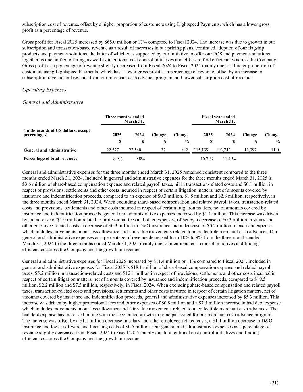 subscription cost of revenue, offset by a higher proportion of customers using Lightspeed Payments, which has a lower gross profit as a percentage of revenue. Gross profit for Fiscal 2025 increased by $65.0 million or 17% compared to Fiscal 2024. The increase was due to growth in our subscription and transaction-based revenue as a result of increases in our pricing plans, continued adoption of our flagship products and payments solutions, the latter of which was supported by our initiative to offer our POS and payments solutions together as one unified offering, as well as intentional cost control initiatives and efforts to find efficiencies across the Company. Gross profit as a percentage of revenue slightly decreased from Fiscal 2024 to Fiscal 2025 mainly due to a higher proportion of customers using Lightspeed Payments, which has a lower gross profit as a percentage of revenue, offset by an increase in subscription revenue and revenue from our merchant cash advance program, and lower subscription cost of revenue. Operating Expenses General and Administrative Three months ended March 31, Fiscal year ended March 31, (In thousands of US dollars, except percentages) 2025 2024 Change Change 2025 2024 Change Change $ $ $ % $ $ $ % General and administrative 22,577 22,540 37 0.2 115,139 103,742 11,397 11.0 Percentage of total revenues 8.9 % 9.8 % 10.7 % 11.4 % General and administrative expenses for the three months ended March 31, 2025 remained consistent compared to the three months ended March 31, 2024. Included in general and administrative expenses for the three months ended March 31, 2025 is $3.6 million of share-based compensation expense and related payroll taxes, nil in transaction-related costs and $0.1 million in respect of provisions, settlements and other costs incurred in respect of certain litigation matters, net of amounts covered by insurance and indemnification proceeds, compared to an expense of $0.3 million, $1.8 million and $2.8 million, respectively, in the three months ended March 31, 2024. When excluding share-based compensation and related payroll taxes, transaction-related costs and provisions, settlements and other costs incurred in respect of certain litigation matters, net of amounts covered by insurance and indemnification proceeds, general and administrative expenses increased by $1.1 million. This increase was driven by an increase of $1.9 million related to professional fees and other expenses, offset by a decrease of $0.3 million in salary and other employee-related costs, a decrease of $0.3 million in D&O insurance and a decrease of $0.2 million in bad debt expense which includes movements in our loss allowance and fair value movements related to uncollectible merchant cash advances. Our general and administrative expenses as a percentage of revenue decreased from 10% to 9% from the three months ended March 31, 2024 to the three months ended March 31, 2025 mainly due to intentional cost control initiatives and finding efficiencies across the Company and the growth in revenue. General and administrative expenses for Fiscal 2025 increased by $11.4 million or 11% compared to Fiscal 2024. Included in general and administrative expenses for Fiscal 2025 is $18.1 million of share-based compensation expense and related payroll taxes, $5.2 million in transaction-related costs and $12.1 million in respect of provisions, settlements and other costs incurred in respect of certain litigation matters, net of amounts covered by insurance and indemnification proceeds, compared to $19.5 million, $2.2 million and $7.5 million, respectively, in Fiscal 2024. When excluding share-based compensation and related payroll taxes, transaction-related costs and provisions, settlements and other costs incurred in respect of certain litigation matters, net of amounts covered by insurance and indemnification proceeds, general and administrative expenses increased by $5.3 million. This increase was driven by higher professional fees and other expenses of $0.8 million and a $7.5 million increase in bad debt expense which includes movements in our loss allowance and fair value movements related to uncollectible merchant cash advances. The bad debt expense has increased in line with the accelerated growth in principal issued for our merchant cash advance program. The increase was offset by a $1.1 million decrease in salary and other employee-related costs, a $1.4 million decrease in D&O insurance and lower software and licensing costs of $0.5 million. Our general and administrative expenses as a percentage of revenue slightly decreased from Fiscal 2024 to Fiscal 2025 mainly due to intentional cost control initiatives and finding efficiencies across the Company and the growth in revenue. (21)
