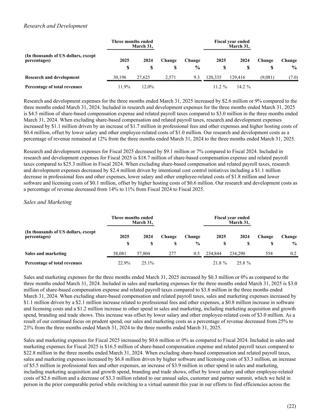 Research and Development Three months ended March 31, Fiscal year ended March 31, (In thousands of US dollars, except percentages) 2025 2024 Change Change 2025 2024 Change Change $ $ $ % $ $ $ % Research and development 30,196 27,625 2,571 9.3 120,335 129,416 (9,081) (7.0) Percentage of total revenues 11.9 % 12.0 % 11.2 % 14.2 % Research and development expenses for the three months ended March 31, 2025 increased by $2.6 million or 9% compared to the three months ended March 31, 2024. Included in research and development expenses for the three months ended March 31, 2025 is $4.5 million of share-based compensation expense and related payroll taxes compared to $3.0 million in the three months ended March 31, 2024. When excluding share-based compensation and related payroll taxes, research and development expenses increased by $1.1 million driven by an increase of $1.7 million in professional fees and other expenses and higher hosting costs of $0.4 million, offset by lower salary and other employee-related costs of $1.0 million. Our research and development costs as a percentage of revenue remained at 12% from the three months ended March 31, 2024 to the three months ended March 31, 2025. Research and development expenses for Fiscal 2025 decreased by $9.1 million or 7% compared to Fiscal 2024. Included in research and development expenses for Fiscal 2025 is $18.7 million of share-based compensation expense and related payroll taxes compared to $25.3 million in Fiscal 2024. When excluding share-based compensation and related payroll taxes, research and development expenses decreased by $2.4 million driven by intentional cost control initiatives including a $1.1 million decrease in professional fees and other expenses, lower salary and other employee-related costs of $1.8 million and lower software and licensing costs of $0.1 million, offset by higher hosting costs of $0.6 million. Our research and development costs as a percentage of revenue decreased from 14% to 11% from Fiscal 2024 to Fiscal 2025. Sales and Marketing Three months ended March 31, Fiscal year ended March 31, (In thousands of US dollars, except percentages) 2025 2024 Change Change 2025 2024 Change Change $ $ $ % $ $ $ % Sales and marketing 58,081 57,804 277 0.5 234,844 234,290 554 0.2 Percentage of total revenues 22.9 % 25.1 % 21.8 % 25.8 % Sales and marketing expenses for the three months ended March 31, 2025 increased by $0.3 million or 0% as compared to the three months ended March 31, 2024. Included in sales and marketing expenses for the three months ended March 31, 2025 is $3.0 million of share-based compensation expense and related payroll taxes compared to $3.8 million in the three months ended March 31, 2024. When excluding share-based compensation and related payroll taxes, sales and marketing expenses increased by $1.1 million driven by a $2.1 million increase related to professional fees and other expenses, a $0.8 million increase in software and licensing costs and a $1.2 million increase in other spend in sales and marketing, including marketing acquisition and growth spend, branding and trade shows. This increase was offset by lower salary and other employee-related costs of $3.0 million. As a result of our continued focus on prudent spend, our sales and marketing costs as a percentage of revenue decreased from 25% to 23% from the three months ended March 31, 2024 to the three months ended March 31, 2025. Sales and marketing expenses for Fiscal 2025 increased by $0.6 million or 0% as compared to Fiscal 2024. Included in sales and marketing expenses for Fiscal 2025 is $16.5 million of share-based compensation expense and related payroll taxes compared to $22.8 million in the three months ended March 31, 2024. When excluding share-based compensation and related payroll taxes, sales and marketing expenses increased by $6.8 million driven by higher software and licensing costs of $3.3 million, an increase of $5.5 million in professional fees and other expenses, an increase of $3.9 million in other spend in sales and marketing, including marketing acquisition and growth spend, branding and trade shows, offset by lower salary and other employee-related costs of $2.6 million and a decrease of $3.3 million related to our annual sales, customer and partner summit, which we held in person in the prior comparable period while switching to a virtual summit this year in our efforts to find efficiencies across the (22)