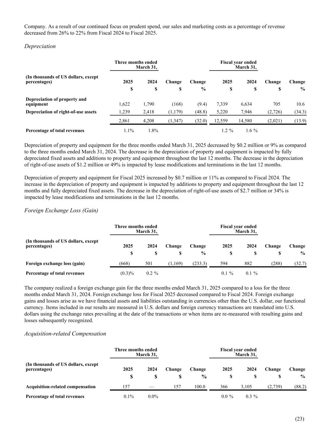Company. As a result of our continued focus on prudent spend, our sales and marketing costs as a percentage of revenue decreased from 26% to 22% from Fiscal 2024 to Fiscal 2025. Depreciation Three months ended March 31, Fiscal year ended March 31, (In thousands of US dollars, except percentages) 2025 2024 Change Change 2025 2024 Change Change $ $ $ % $ $ $ % Depreciation of property and equipment 1,622 1,790 (168) (9.4) 7,339 6,634 705 10.6 Depreciation of right-of-use assets 1,239 2,418 (1,179) (48.8) 5,220 7,946 (2,726) (34.3) 2,861 4,208 (1,347) (32.0) 12,559 14,580 (2,021) (13.9) Percentage of total revenues 1.1 % 1.8 % 1.2 % 1.6 % Depreciation of property and equipment for the three months ended March 31, 2025 decreased by $0.2 million or 9% as compared to the three months ended March 31, 2024. The decrease in the depreciation of property and equipment is impacted by fully depreciated fixed assets and additions to property and equipment throughout the last 12 months. The decrease in the depreciation of right-of-use assets of $1.2 million or 49% is impacted by lease modifications and terminations in the last 12 months. Depreciation of property and equipment for Fiscal 2025 increased by $0.7 million or 11% as compared to Fiscal 2024. The increase in the depreciation of property and equipment is impacted by additions to property and equipment throughout the last 12 months and fully depreciated fixed assets. The decrease in the depreciation of right-of-use assets of $2.7 million or 34% is impacted by lease modifications and terminations in the last 12 months. Foreign Exchange Loss (Gain) Three months ended March 31, Fiscal year ended March 31, (In thousands of US dollars, except percentages) 2025 2024 Change Change 2025 2024 Change Change $ $ $ % $ $ $ % Foreign exchange loss (gain) (668) 501 (1,169) (233.3) 594 882 (288) (32.7) Percentage of total revenues (0.3) % 0.2 % 0.1 % 0.1 % The company realized a foreign exchange gain for the three months ended March 31, 2025 compared to a loss for the three months ended March 31, 2024. Foreign exchange loss for Fiscal 2025 decreased compared to Fiscal 2024. Foreign exchange gains and losses arise as we have financial assets and liabilities outstanding in currencies other than the U.S. dollar, our functional currency. Items included in our results are measured in U.S. dollars and foreign currency transactions are translated into U.S. dollars using the exchange rates prevailing at the date of the transactions or when items are re-measured with resulting gains and losses subsequently recognized. Acquisition-related Compensation Three months ended March 31, Fiscal year ended March 31, (In thousands of US dollars, except percentages) 2025 2024 Change Change 2025 2024 Change Change $ $ $ % $ $ $ % Acquisition-related compensation 157 — 157 100.0 366 3,105 (2,739) (88.2) Percentage of total revenues 0.1 % 0.0 % 0.0 % 0.3 % (23)