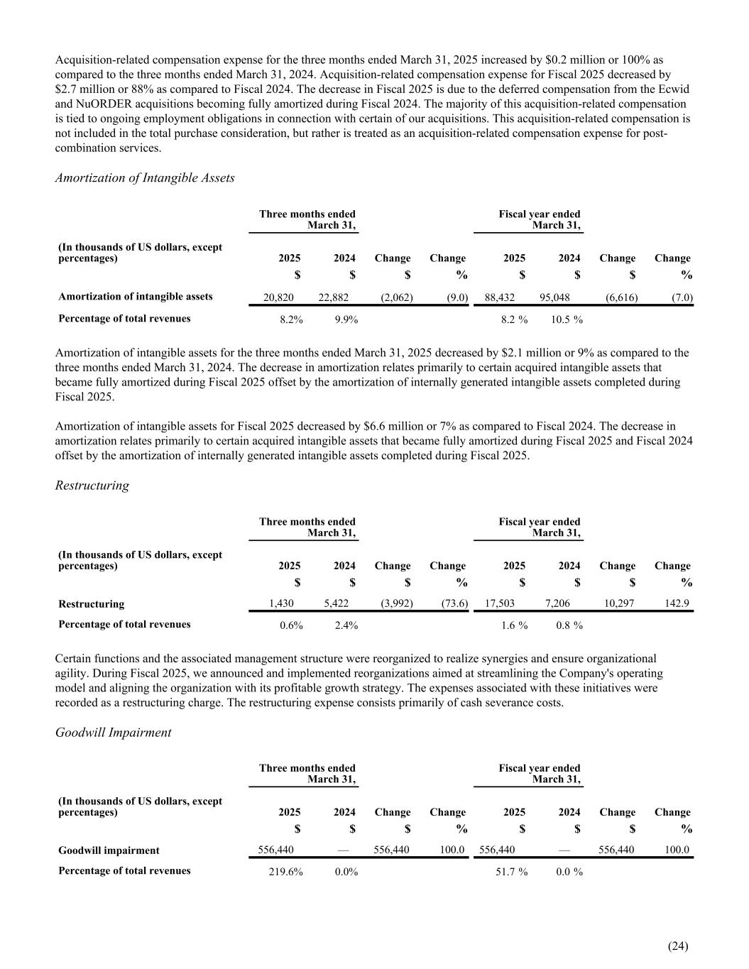 Acquisition-related compensation expense for the three months ended March 31, 2025 increased by $0.2 million or 100% as compared to the three months ended March 31, 2024. Acquisition-related compensation expense for Fiscal 2025 decreased by $2.7 million or 88% as compared to Fiscal 2024. The decrease in Fiscal 2025 is due to the deferred compensation from the Ecwid and NuORDER acquisitions becoming fully amortized during Fiscal 2024. The majority of this acquisition-related compensation is tied to ongoing employment obligations in connection with certain of our acquisitions. This acquisition-related compensation is not included in the total purchase consideration, but rather is treated as an acquisition-related compensation expense for post- combination services. Amortization of Intangible Assets Three months ended March 31, Fiscal year ended March 31, (In thousands of US dollars, except percentages) 2025 2024 Change Change 2025 2024 Change Change $ $ $ % $ $ $ % Amortization of intangible assets 20,820 22,882 (2,062) (9.0) 88,432 95,048 (6,616) (7.0) Percentage of total revenues 8.2 % 9.9 % 8.2 % 10.5 % Amortization of intangible assets for the three months ended March 31, 2025 decreased by $2.1 million or 9% as compared to the three months ended March 31, 2024. The decrease in amortization relates primarily to certain acquired intangible assets that became fully amortized during Fiscal 2025 offset by the amortization of internally generated intangible assets completed during Fiscal 2025. Amortization of intangible assets for Fiscal 2025 decreased by $6.6 million or 7% as compared to Fiscal 2024. The decrease in amortization relates primarily to certain acquired intangible assets that became fully amortized during Fiscal 2025 and Fiscal 2024 offset by the amortization of internally generated intangible assets completed during Fiscal 2025. Restructuring Three months ended March 31, Fiscal year ended March 31, (In thousands of US dollars, except percentages) 2025 2024 Change Change 2025 2024 Change Change $ $ $ % $ $ $ % Restructuring 1,430 5,422 (3,992) (73.6) 17,503 7,206 10,297 142.9 Percentage of total revenues 0.6 % 2.4 % 1.6 % 0.8 % Certain functions and the associated management structure were reorganized to realize synergies and ensure organizational agility. During Fiscal 2025, we announced and implemented reorganizations aimed at streamlining the Company's operating model and aligning the organization with its profitable growth strategy. The expenses associated with these initiatives were recorded as a restructuring charge. The restructuring expense consists primarily of cash severance costs. Goodwill Impairment Three months ended March 31, Fiscal year ended March 31, (In thousands of US dollars, except percentages) 2025 2024 Change Change 2025 2024 Change Change $ $ $ % $ $ $ % Goodwill impairment 556,440 — 556,440 100.0 556,440 — 556,440 100.0 Percentage of total revenues 219.6 % 0.0 % 51.7 % 0.0 % (24)