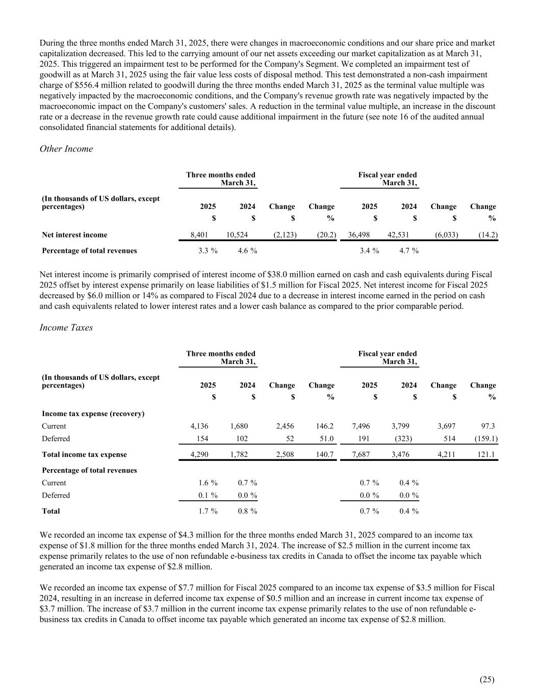 During the three months ended March 31, 2025, there were changes in macroeconomic conditions and our share price and market capitalization decreased. This led to the carrying amount of our net assets exceeding our market capitalization as at March 31, 2025. This triggered an impairment test to be performed for the Company's Segment. We completed an impairment test of goodwill as at March 31, 2025 using the fair value less costs of disposal method. This test demonstrated a non-cash impairment charge of $556.4 million related to goodwill during the three months ended March 31, 2025 as the terminal value multiple was negatively impacted by the macroeconomic conditions, and the Company's revenue growth rate was negatively impacted by the macroeconomic impact on the Company's customers' sales. A reduction in the terminal value multiple, an increase in the discount rate or a decrease in the revenue growth rate could cause additional impairment in the future (see note 16 of the audited annual consolidated financial statements for additional details). Other Income Three months ended March 31, Fiscal year ended March 31, (In thousands of US dollars, except percentages) 2025 2024 Change Change 2025 2024 Change Change $ $ $ % $ $ $ % Net interest income 8,401 10,524 (2,123) (20.2) 36,498 42,531 (6,033) (14.2) Percentage of total revenues 3.3 % 4.6 % 3.4 % 4.7 % Net interest income is primarily comprised of interest income of $38.0 million earned on cash and cash equivalents during Fiscal 2025 offset by interest expense primarily on lease liabilities of $1.5 million for Fiscal 2025. Net interest income for Fiscal 2025 decreased by $6.0 million or 14% as compared to Fiscal 2024 due to a decrease in interest income earned in the period on cash and cash equivalents related to lower interest rates and a lower cash balance as compared to the prior comparable period. Income Taxes Three months ended March 31, Fiscal year ended March 31, (In thousands of US dollars, except percentages) 2025 2024 Change Change 2025 2024 Change Change $ $ $ % $ $ $ % Income tax expense (recovery) Current 4,136 1,680 2,456 146.2 7,496 3,799 3,697 97.3 Deferred 154 102 52 51.0 191 (323) 514 (159.1) Total income tax expense 4,290 1,782 2,508 140.7 7,687 3,476 4,211 121.1 Percentage of total revenues Current 1.6 % 0.7 % 0.7 % 0.4 % Deferred 0.1 % 0.0 % 0.0 % 0.0 % Total 1.7 % 0.8 % 0.7 % 0.4 % We recorded an income tax expense of $4.3 million for the three months ended March 31, 2025 compared to an income tax expense of $1.8 million for the three months ended March 31, 2024. The increase of $2.5 million in the current income tax expense primarily relates to the use of non refundable e-business tax credits in Canada to offset the income tax payable which generated an income tax expense of $2.8 million. We recorded an income tax expense of $7.7 million for Fiscal 2025 compared to an income tax expense of $3.5 million for Fiscal 2024, resulting in an increase in deferred income tax expense of $0.5 million and an increase in current income tax expense of $3.7 million. The increase of $3.7 million in the current income tax expense primarily relates to the use of non refundable e- business tax credits in Canada to offset income tax payable which generated an income tax expense of $2.8 million. (25)