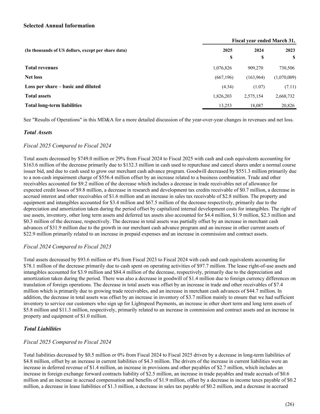 Selected Annual Information Fiscal year ended March 31, (In thousands of US dollars, except per share data) 2025 2024 2023 $ $ $ Total revenues 1,076,826 909,270 730,506 Net loss (667,196) (163,964) (1,070,009) Loss per share – basic and diluted (4.34) (1.07) (7.11) Total assets 1,826,203 2,575,154 2,668,732 Total long-term liabilities 13,253 18,087 20,826 See "Results of Operations" in this MD&A for a more detailed discussion of the year-over-year changes in revenues and net loss. Total Assets Fiscal 2025 Compared to Fiscal 2024 Total assets decreased by $749.0 million or 29% from Fiscal 2024 to Fiscal 2025 with cash and cash equivalents accounting for $163.6 million of the decrease primarily due to $132.3 million in cash used to repurchase and cancel shares under a normal course issuer bid, and due to cash used to grow our merchant cash advance program. Goodwill decreased by $551.3 million primarily due to a non-cash impairment charge of $556.4 million offset by an increase related to a business combination. Trade and other receivables accounted for $9.2 million of the decrease which includes a decrease in trade receivables net of allowance for expected credit losses of $9.8 million, a decrease in research and development tax credits receivable of $0.7 million, a decrease in accrued interest and other receivables of $1.6 million and an increase in sales tax receivable of $2.8 million. The property and equipment and intangibles accounted for $3.4 million and $67.5 million of the decrease respectively, primarily due to the depreciation and amortization taken during the period offset by capitalized internal development costs for intangibles. The right of use assets, inventory, other long term assets and deferred tax assets also accounted for $4.4 million, $1.9 million, $2.3 million and $0.3 million of the decrease, respectively. The decrease in total assets was partially offset by an increase in merchant cash advances of $31.9 million due to the growth in our merchant cash advance program and an increase in other current assets of $22.9 million primarily related to an increase in prepaid expenses and an increase in commission and contract assets. Fiscal 2024 Compared to Fiscal 2023 Total assets decreased by $93.6 million or 4% from Fiscal 2023 to Fiscal 2024 with cash and cash equivalents accounting for $78.1 million of the decrease primarily due to cash spent on operating activities of $97.7 million. The lease right-of-use assets and intangibles accounted for $3.9 million and $84.4 million of the decrease, respectively, primarily due to the depreciation and amortization taken during the period. There was also a decrease in goodwill of $1.4 million due to foreign currency differences on translation of foreign operations. The decrease in total assets was offset by an increase in trade and other receivables of $7.4 million which is primarily due to growing trade receivables, and an increase in merchant cash advances of $44.7 million. In addition, the decrease in total assets was offset by an increase in inventory of $3.7 million mainly to ensure that we had sufficient inventory to service our customers who sign up for Lightspeed Payments, an increase in other short term and long term assets of $5.8 million and $11.3 million, respectively, primarily related to an increase in commission and contract assets and an increase in property and equipment of $1.0 million. Total Liabilities Fiscal 2025 Compared to Fiscal 2024 Total liabilities decreased by $0.5 million or 0% from Fiscal 2024 to Fiscal 2025 driven by a decrease in long-term liabilities of $4.8 million, offset by an increase in current liabilities of $4.3 million. The drivers of the increase in current liabilities were an increase in deferred revenue of $1.4 million, an increase in provisions and other payables of $2.7 million, which includes an increase in foreign exchange forward contracts liability of $2.5 million, an increase in trade payables and trade accruals of $0.6 million and an increase in accrued compensation and benefits of $1.9 million, offset by a decrease in income taxes payable of $0.2 million, a decrease in lease liabilities of $1.3 million, a decrease in sales tax payable of $0.2 million, and a decrease in accrued (26)