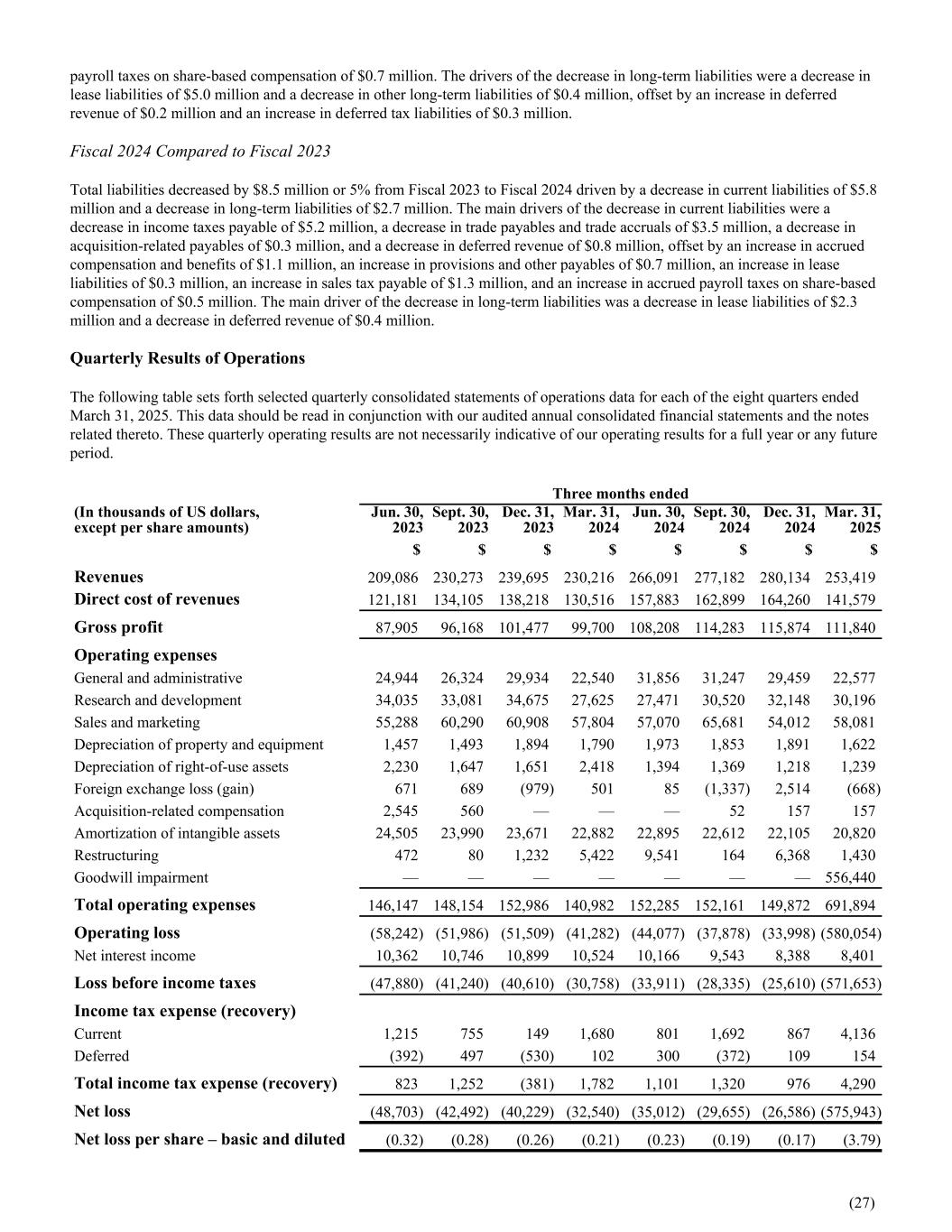 payroll taxes on share-based compensation of $0.7 million. The drivers of the decrease in long-term liabilities were a decrease in lease liabilities of $5.0 million and a decrease in other long-term liabilities of $0.4 million, offset by an increase in deferred revenue of $0.2 million and an increase in deferred tax liabilities of $0.3 million. Fiscal 2024 Compared to Fiscal 2023 Total liabilities decreased by $8.5 million or 5% from Fiscal 2023 to Fiscal 2024 driven by a decrease in current liabilities of $5.8 million and a decrease in long-term liabilities of $2.7 million. The main drivers of the decrease in current liabilities were a decrease in income taxes payable of $5.2 million, a decrease in trade payables and trade accruals of $3.5 million, a decrease in acquisition-related payables of $0.3 million, and a decrease in deferred revenue of $0.8 million, offset by an increase in accrued compensation and benefits of $1.1 million, an increase in provisions and other payables of $0.7 million, an increase in lease liabilities of $0.3 million, an increase in sales tax payable of $1.3 million, and an increase in accrued payroll taxes on share-based compensation of $0.5 million. The main driver of the decrease in long-term liabilities was a decrease in lease liabilities of $2.3 million and a decrease in deferred revenue of $0.4 million. Quarterly Results of Operations The following table sets forth selected quarterly consolidated statements of operations data for each of the eight quarters ended March 31, 2025. This data should be read in conjunction with our audited annual consolidated financial statements and the notes related thereto. These quarterly operating results are not necessarily indicative of our operating results for a full year or any future period. Three months ended (In thousands of US dollars, except per share amounts) Jun. 30, 2023 Sept. 30, 2023 Dec. 31, 2023 Mar. 31, 2024 Jun. 30, 2024 Sept. 30, 2024 Dec. 31, 2024 Mar. 31, 2025 $ $ $ $ $ $ $ $ Revenues 209,086 230,273 239,695 230,216 266,091 277,182 280,134 253,419 Direct cost of revenues 121,181 134,105 138,218 130,516 157,883 162,899 164,260 141,579 Gross profit 87,905 96,168 101,477 99,700 108,208 114,283 115,874 111,840 Operating expenses General and administrative 24,944 26,324 29,934 22,540 31,856 31,247 29,459 22,577 Research and development 34,035 33,081 34,675 27,625 27,471 30,520 32,148 30,196 Sales and marketing 55,288 60,290 60,908 57,804 57,070 65,681 54,012 58,081 Depreciation of property and equipment 1,457 1,493 1,894 1,790 1,973 1,853 1,891 1,622 Depreciation of right-of-use assets 2,230 1,647 1,651 2,418 1,394 1,369 1,218 1,239 Foreign exchange loss (gain) 671 689 (979) 501 85 (1,337) 2,514 (668) Acquisition-related compensation 2,545 560 — — — 52 157 157 Amortization of intangible assets 24,505 23,990 23,671 22,882 22,895 22,612 22,105 20,820 Restructuring 472 80 1,232 5,422 9,541 164 6,368 1,430 Goodwill impairment — — — — — — — 556,440 Total operating expenses 146,147 148,154 152,986 140,982 152,285 152,161 149,872 691,894 Operating loss (58,242) (51,986) (51,509) (41,282) (44,077) (37,878) (33,998) (580,054) Net interest income 10,362 10,746 10,899 10,524 10,166 9,543 8,388 8,401 Loss before income taxes (47,880) (41,240) (40,610) (30,758) (33,911) (28,335) (25,610) (571,653) Income tax expense (recovery) Current 1,215 755 149 1,680 801 1,692 867 4,136 Deferred (392) 497 (530) 102 300 (372) 109 154 Total income tax expense (recovery) 823 1,252 (381) 1,782 1,101 1,320 976 4,290 Net loss (48,703) (42,492) (40,229) (32,540) (35,012) (29,655) (26,586) (575,943) Net loss per share – basic and diluted (0.32) (0.28) (0.26) (0.21) (0.23) (0.19) (0.17) (3.79) (27)