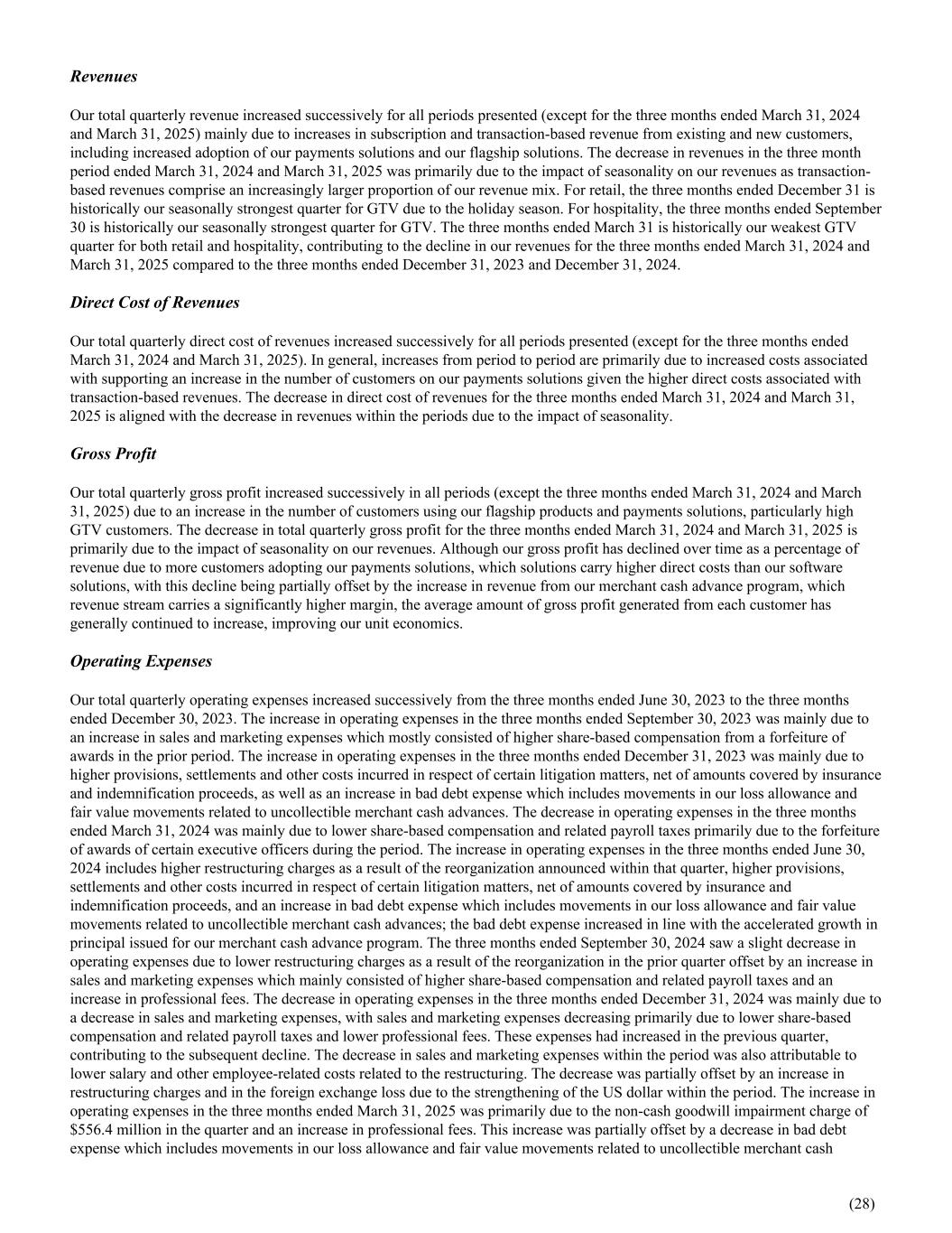 Revenues Our total quarterly revenue increased successively for all periods presented (except for the three months ended March 31, 2024 and March 31, 2025) mainly due to increases in subscription and transaction-based revenue from existing and new customers, including increased adoption of our payments solutions and our flagship solutions. The decrease in revenues in the three month period ended March 31, 2024 and March 31, 2025 was primarily due to the impact of seasonality on our revenues as transaction- based revenues comprise an increasingly larger proportion of our revenue mix. For retail, the three months ended December 31 is historically our seasonally strongest quarter for GTV due to the holiday season. For hospitality, the three months ended September 30 is historically our seasonally strongest quarter for GTV. The three months ended March 31 is historically our weakest GTV quarter for both retail and hospitality, contributing to the decline in our revenues for the three months ended March 31, 2024 and March 31, 2025 compared to the three months ended December 31, 2023 and December 31, 2024. Direct Cost of Revenues Our total quarterly direct cost of revenues increased successively for all periods presented (except for the three months ended March 31, 2024 and March 31, 2025). In general, increases from period to period are primarily due to increased costs associated with supporting an increase in the number of customers on our payments solutions given the higher direct costs associated with transaction-based revenues. The decrease in direct cost of revenues for the three months ended March 31, 2024 and March 31, 2025 is aligned with the decrease in revenues within the periods due to the impact of seasonality. Gross Profit Our total quarterly gross profit increased successively in all periods (except the three months ended March 31, 2024 and March 31, 2025) due to an increase in the number of customers using our flagship products and payments solutions, particularly high GTV customers. The decrease in total quarterly gross profit for the three months ended March 31, 2024 and March 31, 2025 is primarily due to the impact of seasonality on our revenues. Although our gross profit has declined over time as a percentage of revenue due to more customers adopting our payments solutions, which solutions carry higher direct costs than our software solutions, with this decline being partially offset by the increase in revenue from our merchant cash advance program, which revenue stream carries a significantly higher margin, the average amount of gross profit generated from each customer has generally continued to increase, improving our unit economics. Operating Expenses Our total quarterly operating expenses increased successively from the three months ended June 30, 2023 to the three months ended December 30, 2023. The increase in operating expenses in the three months ended September 30, 2023 was mainly due to an increase in sales and marketing expenses which mostly consisted of higher share-based compensation from a forfeiture of awards in the prior period. The increase in operating expenses in the three months ended December 31, 2023 was mainly due to higher provisions, settlements and other costs incurred in respect of certain litigation matters, net of amounts covered by insurance and indemnification proceeds, as well as an increase in bad debt expense which includes movements in our loss allowance and fair value movements related to uncollectible merchant cash advances. The decrease in operating expenses in the three months ended March 31, 2024 was mainly due to lower share-based compensation and related payroll taxes primarily due to the forfeiture of awards of certain executive officers during the period. The increase in operating expenses in the three months ended June 30, 2024 includes higher restructuring charges as a result of the reorganization announced within that quarter, higher provisions, settlements and other costs incurred in respect of certain litigation matters, net of amounts covered by insurance and indemnification proceeds, and an increase in bad debt expense which includes movements in our loss allowance and fair value movements related to uncollectible merchant cash advances; the bad debt expense increased in line with the accelerated growth in principal issued for our merchant cash advance program. The three months ended September 30, 2024 saw a slight decrease in operating expenses due to lower restructuring charges as a result of the reorganization in the prior quarter offset by an increase in sales and marketing expenses which mainly consisted of higher share-based compensation and related payroll taxes and an increase in professional fees. The decrease in operating expenses in the three months ended December 31, 2024 was mainly due to a decrease in sales and marketing expenses, with sales and marketing expenses decreasing primarily due to lower share-based compensation and related payroll taxes and lower professional fees. These expenses had increased in the previous quarter, contributing to the subsequent decline. The decrease in sales and marketing expenses within the period was also attributable to lower salary and other employee-related costs related to the restructuring. The decrease was partially offset by an increase in restructuring charges and in the foreign exchange loss due to the strengthening of the US dollar within the period. The increase in operating expenses in the three months ended March 31, 2025 was primarily due to the non-cash goodwill impairment charge of $556.4 million in the quarter and an increase in professional fees. This increase was partially offset by a decrease in bad debt expense which includes movements in our loss allowance and fair value movements related to uncollectible merchant cash (28)