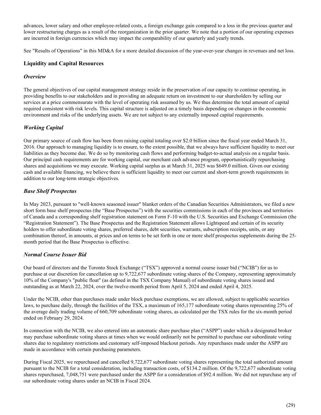 advances, lower salary and other employee-related costs, a foreign exchange gain compared to a loss in the previous quarter and lower restructuring charges as a result of the reorganization in the prior quarter. We note that a portion of our operating expenses are incurred in foreign currencies which may impact the comparability of our quarterly and yearly trends. See "Results of Operations" in this MD&A for a more detailed discussion of the year-over-year changes in revenues and net loss. Liquidity and Capital Resources Overview The general objectives of our capital management strategy reside in the preservation of our capacity to continue operating, in providing benefits to our stakeholders and in providing an adequate return on investment to our shareholders by selling our services at a price commensurate with the level of operating risk assumed by us. We thus determine the total amount of capital required consistent with risk levels. This capital structure is adjusted on a timely basis depending on changes in the economic environment and risks of the underlying assets. We are not subject to any externally imposed capital requirements. Working Capital Our primary source of cash flow has been from raising capital totaling over $2.0 billion since the fiscal year ended March 31, 2016. Our approach to managing liquidity is to ensure, to the extent possible, that we always have sufficient liquidity to meet our liabilities as they become due. We do so by monitoring cash flows and performing budget-to-actual analysis on a regular basis. Our principal cash requirements are for working capital, our merchant cash advance program, opportunistically repurchasing shares and acquisitions we may execute. Working capital surplus as at March 31, 2025 was $649.0 million. Given our existing cash and available financing, we believe there is sufficient liquidity to meet our current and short-term growth requirements in addition to our long-term strategic objectives. Base Shelf Prospectus In May 2023, pursuant to "well-known seasoned issuer" blanket orders of the Canadian Securities Administrators, we filed a new short form base shelf prospectus (the “Base Prospectus”) with the securities commissions in each of the provinces and territories of Canada and a corresponding shelf registration statement on Form F-10 with the U.S. Securities and Exchange Commission (the “Registration Statement”). The Base Prospectus and the Registration Statement allows Lightspeed and certain of its security holders to offer subordinate voting shares, preferred shares, debt securities, warrants, subscription receipts, units, or any combination thereof, in amounts, at prices and on terms to be set forth in one or more shelf prospectus supplements during the 25- month period that the Base Prospectus is effective. Normal Course Issuer Bid Our board of directors and the Toronto Stock Exchange (“TSX”) approved a normal course issuer bid (“NCIB”) for us to purchase at our discretion for cancellation up to 9,722,677 subordinate voting shares of the Company, representing approximately 10% of the Company's "public float" (as defined in the TSX Company Manual) of subordinate voting shares issued and outstanding as at March 22, 2024, over the twelve-month period from April 5, 2024 and ended April 4, 2025. Under the NCIB, other than purchases made under block purchase exemptions, we are allowed, subject to applicable securities laws, to purchase daily, through the facilities of the TSX, a maximum of 165,177 subordinate voting shares representing 25% of the average daily trading volume of 660,709 subordinate voting shares, as calculated per the TSX rules for the six-month period ended on February 29, 2024. In connection with the NCIB, we also entered into an automatic share purchase plan (“ASPP”) under which a designated broker may purchase subordinate voting shares at times when we would ordinarily not be permitted to purchase our subordinate voting shares due to regulatory restrictions and customary self-imposed blackout periods. Any repurchases made under the ASPP are made in accordance with certain purchasing parameters. During Fiscal 2025, we repurchased and cancelled 9,722,677 subordinate voting shares representing the total authorized amount pursuant to the NCIB for a total consideration, including transaction costs, of $134.2 million. Of the 9,722,677 subordinate voting shares repurchased, 7,048,751 were purchased under the ASPP for a consideration of $92.4 million. We did not repurchase any of our subordinate voting shares under an NCIB in Fiscal 2024. (29)