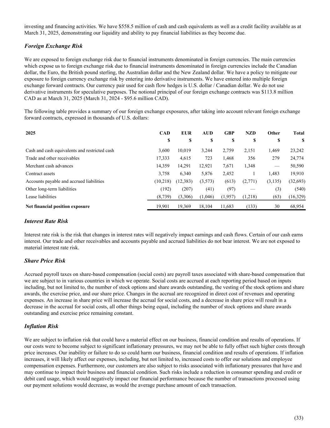 investing and financing activities. We have $558.5 million of cash and cash equivalents as well as a credit facility available as at March 31, 2025, demonstrating our liquidity and ability to pay financial liabilities as they become due. Foreign Exchange Risk We are exposed to foreign exchange risk due to financial instruments denominated in foreign currencies. The main currencies which expose us to foreign exchange risk due to financial instruments denominated in foreign currencies include the Canadian dollar, the Euro, the British pound sterling, the Australian dollar and the New Zealand dollar. We have a policy to mitigate our exposure to foreign currency exchange risk by entering into derivative instruments. We have entered into multiple foreign exchange forward contracts. Our currency pair used for cash flow hedges is U.S. dollar / Canadian dollar. We do not use derivative instruments for speculative purposes. The notional principal of our foreign exchange contracts was $113.8 million CAD as at March 31, 2025 (March 31, 2024 - $95.6 million CAD). The following table provides a summary of our foreign exchange exposures, after taking into account relevant foreign exchange forward contracts, expressed in thousands of U.S. dollars: 2025 CAD EUR AUD GBP NZD Other Total $ $ $ $ $ $ $ Cash and cash equivalents and restricted cash 3,600 10,019 3,244 2,759 2,151 1,469 23,242 Trade and other receivables 17,333 4,615 723 1,468 356 279 24,774 Merchant cash advances 14,359 14,291 12,921 7,671 1,348 — 50,590 Contract assets 3,758 6,340 5,876 2,452 1 1,483 19,910 Accounts payable and accrued liabilities (10,218) (12,383) (3,573) (613) (2,771) (3,135) (32,693) Other long-term liabilities (192) (207) (41) (97) — (3) (540) Lease liabilities (8,739) (3,306) (1,046) (1,957) (1,218) (63) (16,329) Net financial position exposure 19,901 19,369 18,104 11,683 (133) 30 68,954 Interest Rate Risk Interest rate risk is the risk that changes in interest rates will negatively impact earnings and cash flows. Certain of our cash earns interest. Our trade and other receivables and accounts payable and accrued liabilities do not bear interest. We are not exposed to material interest rate risk. Share Price Risk Accrued payroll taxes on share-based compensation (social costs) are payroll taxes associated with share-based compensation that we are subject to in various countries in which we operate. Social costs are accrued at each reporting period based on inputs including, but not limited to, the number of stock options and share awards outstanding, the vesting of the stock options and share awards, the exercise price, and our share price. Changes in the accrual are recognized in direct cost of revenues and operating expenses. An increase in share price will increase the accrual for social costs, and a decrease in share price will result in a decrease in the accrual for social costs, all other things being equal, including the number of stock options and share awards outstanding and exercise price remaining constant. Inflation Risk We are subject to inflation risk that could have a material effect on our business, financial condition and results of operations. If our costs were to become subject to significant inflationary pressures, we may not be able to fully offset such higher costs through price increases. Our inability or failure to do so could harm our business, financial condition and results of operations. If inflation increases, it will likely affect our expenses, including, but not limited to, increased costs to offer our solutions and employee compensation expenses. Furthermore, our customers are also subject to risks associated with inflationary pressures that have and may continue to impact their business and financial condition. Such risks include a reduction in consumer spending and credit or debit card usage, which would negatively impact our financial performance because the number of transactions processed using our payment solutions would decrease, as would the average purchase amount of each transaction. (33)