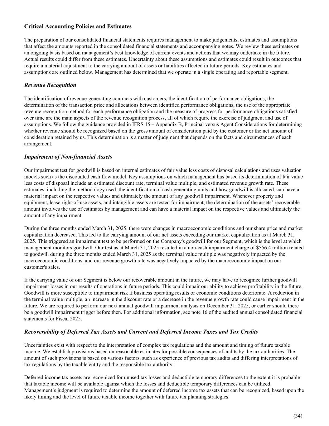 Critical Accounting Policies and Estimates The preparation of our consolidated financial statements requires management to make judgements, estimates and assumptions that affect the amounts reported in the consolidated financial statements and accompanying notes. We review these estimates on an ongoing basis based on management’s best knowledge of current events and actions that we may undertake in the future. Actual results could differ from these estimates. Uncertainty about these assumptions and estimates could result in outcomes that require a material adjustment to the carrying amount of assets or liabilities affected in future periods. Key estimates and assumptions are outlined below. Management has determined that we operate in a single operating and reportable segment. Revenue Recognition The identification of revenue-generating contracts with customers, the identification of performance obligations, the determination of the transaction price and allocations between identified performance obligations, the use of the appropriate revenue recognition method for each performance obligation and the measure of progress for performance obligations satisfied over time are the main aspects of the revenue recognition process, all of which require the exercise of judgment and use of assumptions. We follow the guidance provided in IFRS 15 – Appendix B, Principal versus Agent Considerations for determining whether revenue should be recognized based on the gross amount of consideration paid by the customer or the net amount of consideration retained by us. This determination is a matter of judgment that depends on the facts and circumstances of each arrangement. Impairment of Non-financial Assets Our impairment test for goodwill is based on internal estimates of fair value less costs of disposal calculations and uses valuation models such as the discounted cash flow model. Key assumptions on which management has based its determination of fair value less costs of disposal include an estimated discount rate, terminal value multiple, and estimated revenue growth rate. These estimates, including the methodology used, the identification of cash-generating units and how goodwill is allocated, can have a material impact on the respective values and ultimately the amount of any goodwill impairment. Whenever property and equipment, lease right-of-use assets, and intangible assets are tested for impairment, the determination of the assets’ recoverable amount involves the use of estimates by management and can have a material impact on the respective values and ultimately the amount of any impairment. During the three months ended March 31, 2025, there were changes in macroeconomic conditions and our share price and market capitalization decreased. This led to the carrying amount of our net assets exceeding our market capitalization as at March 31, 2025. This triggered an impairment test to be performed on the Company's goodwill for our Segment, which is the level at which management monitors goodwill. Our test as at March 31, 2025 resulted in a non-cash impairment charge of $556.4 million related to goodwill during the three months ended March 31, 2025 as the terminal value multiple was negatively impacted by the macroeconomic conditions, and our revenue growth rate was negatively impacted by the macroeconomic impact on our customer's sales. If the carrying value of our Segment is below our recoverable amount in the future, we may have to recognize further goodwill impairment losses in our results of operations in future periods. This could impair our ability to achieve profitability in the future. Goodwill is more susceptible to impairment risk if business operating results or economic conditions deteriorate. A reduction in the terminal value multiple, an increase in the discount rate or a decrease in the revenue growth rate could cause impairment in the future. We are required to perform our next annual goodwill impairment analysis on December 31, 2025, or earlier should there be a goodwill impairment trigger before then. For additional information, see note 16 of the audited annual consolidated financial statements for Fiscal 2025. Recoverability of Deferred Tax Assets and Current and Deferred Income Taxes and Tax Credits Uncertainties exist with respect to the interpretation of complex tax regulations and the amount and timing of future taxable income. We establish provisions based on reasonable estimates for possible consequences of audits by the tax authorities. The amount of such provisions is based on various factors, such as experience of previous tax audits and differing interpretations of tax regulations by the taxable entity and the responsible tax authority. Deferred income tax assets are recognized for unused tax losses and deductible temporary differences to the extent it is probable that taxable income will be available against which the losses and deductible temporary differences can be utilized. Management’s judgment is required to determine the amount of deferred income tax assets that can be recognized, based upon the likely timing and the level of future taxable income together with future tax planning strategies. (34)